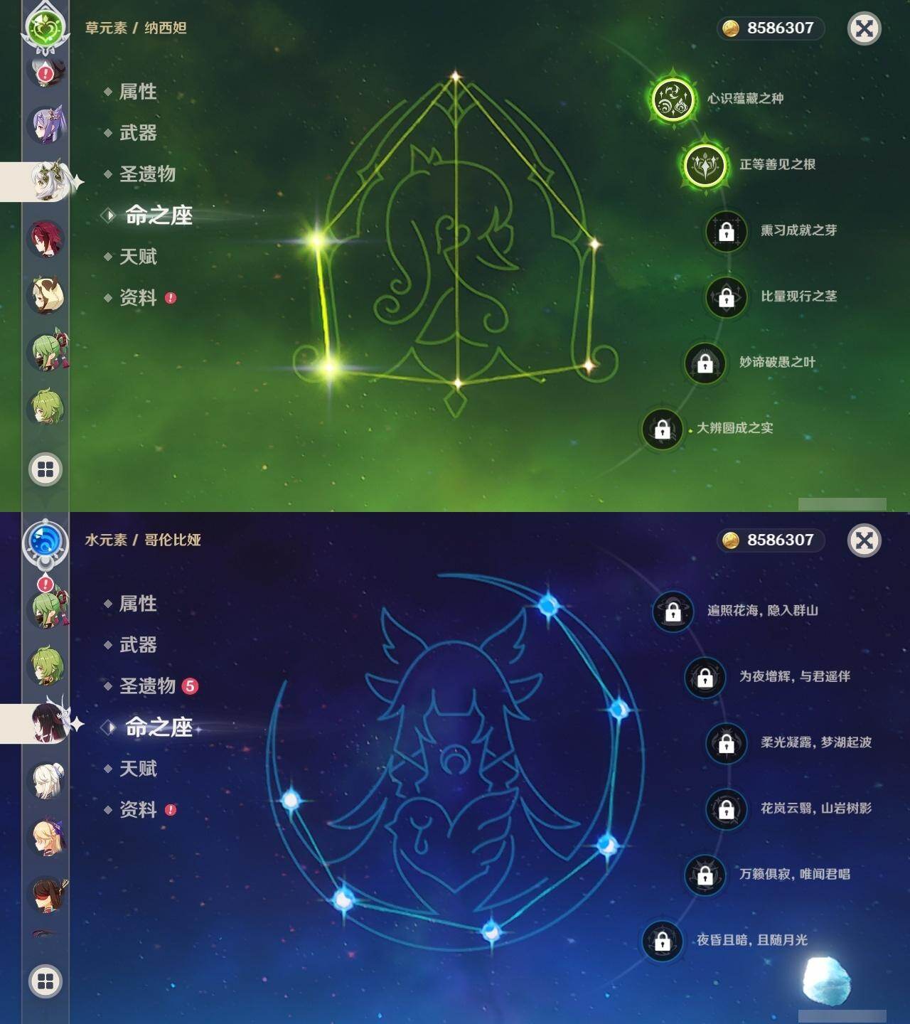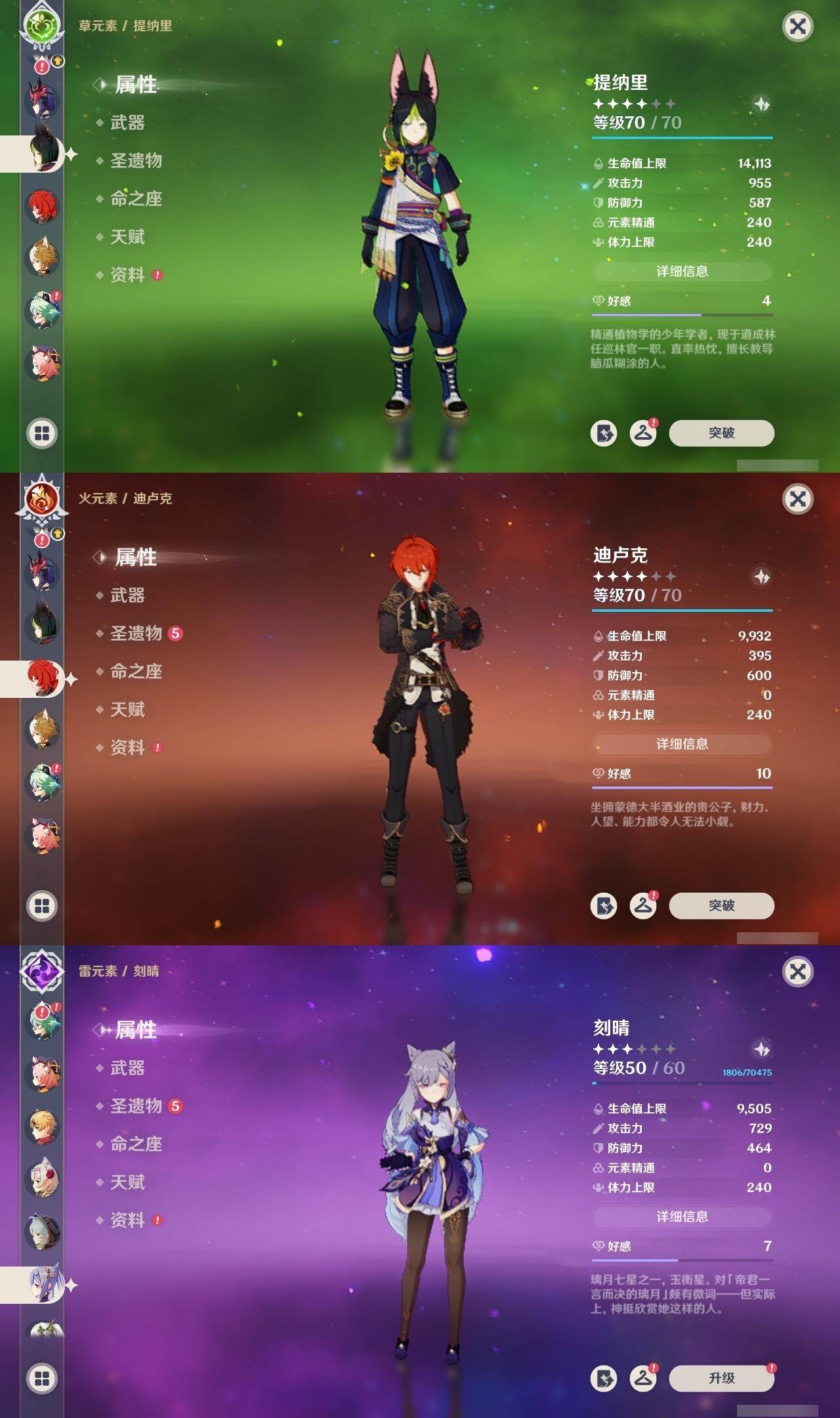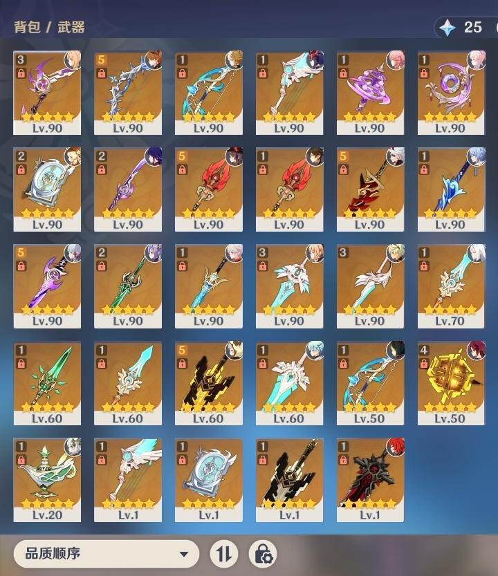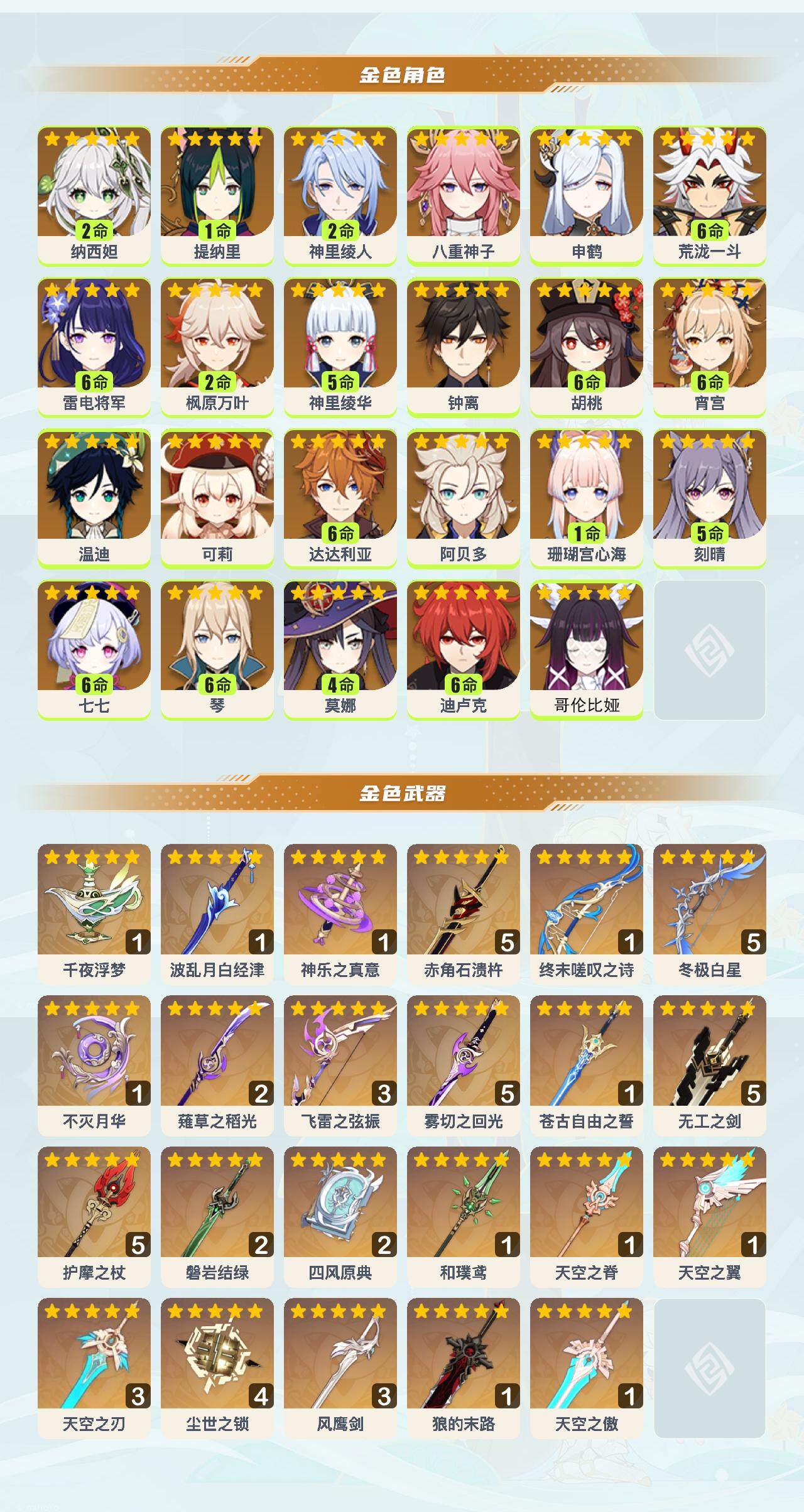 2命纳西妲,1命提纳里,2命神里绫人,0命八重神子,0命申鹤,满命荒泷一斗,满命雷电将军,2命枫原万叶,5命神里绫华,0命钟离,满命胡桃,满命宵宫,0命温迪,0命可莉,满命达达利亚,0命阿贝多,1命珊瑚宫心海,5命刻晴,满命七七,满命琴,4命莫娜,满命迪卢克,0命哥伦比娅,精1千夜浮梦,精1波乱月白经津,精1神乐之真意,精5赤角石溃杵,精1终末嗟叹之诗,精5冬极白星,精1不灭月华,精2薙草之稻光,精3飞雷之弦振,精5雾切之回光,精1苍古自由之誓,精5无工之剑,精5护摩之杖,精2磐岩结绿,精2四风原典,精1和璞鸢,精1天空之脊,精1天空之翼,精3天空之刃,精4尘世之锁,精3风鹰剑,精1狼的末路,精1天空之傲