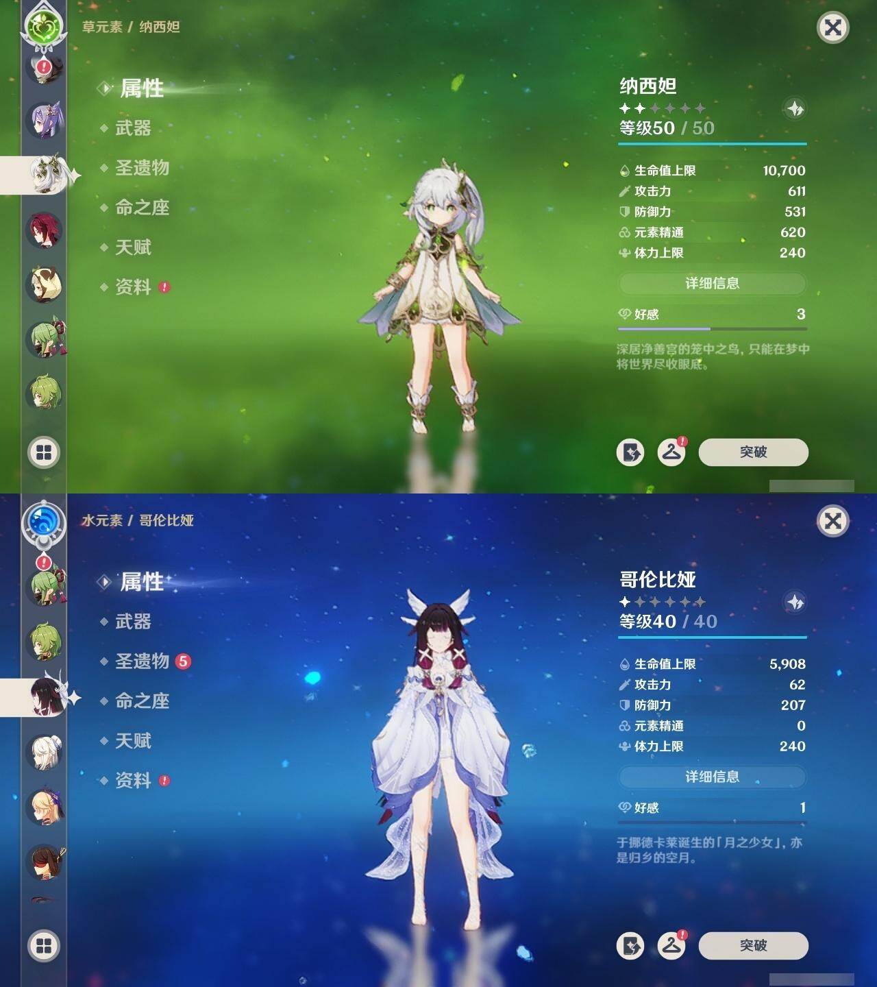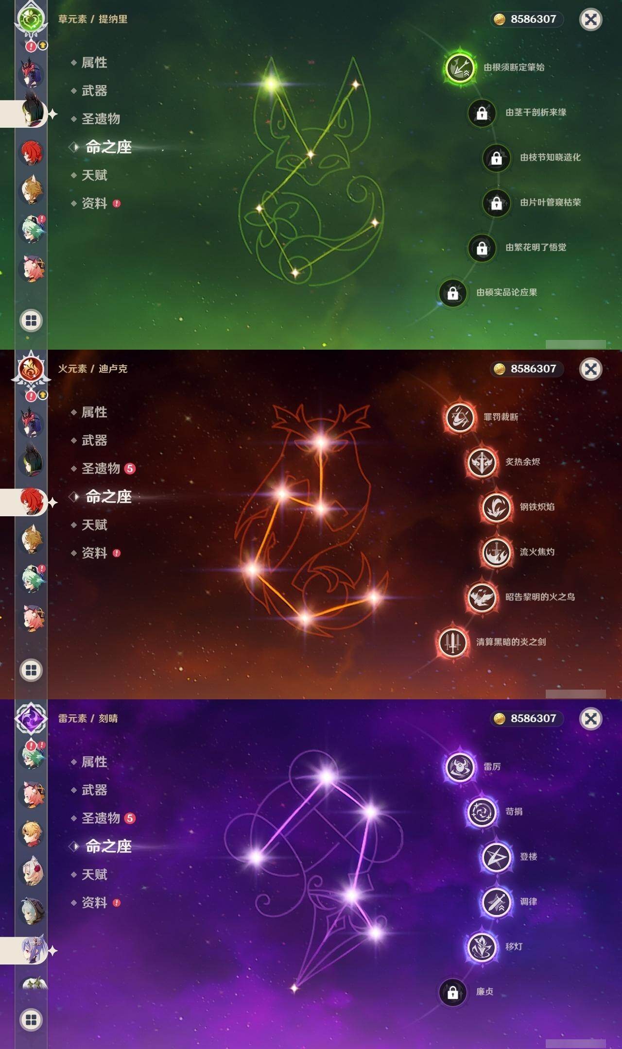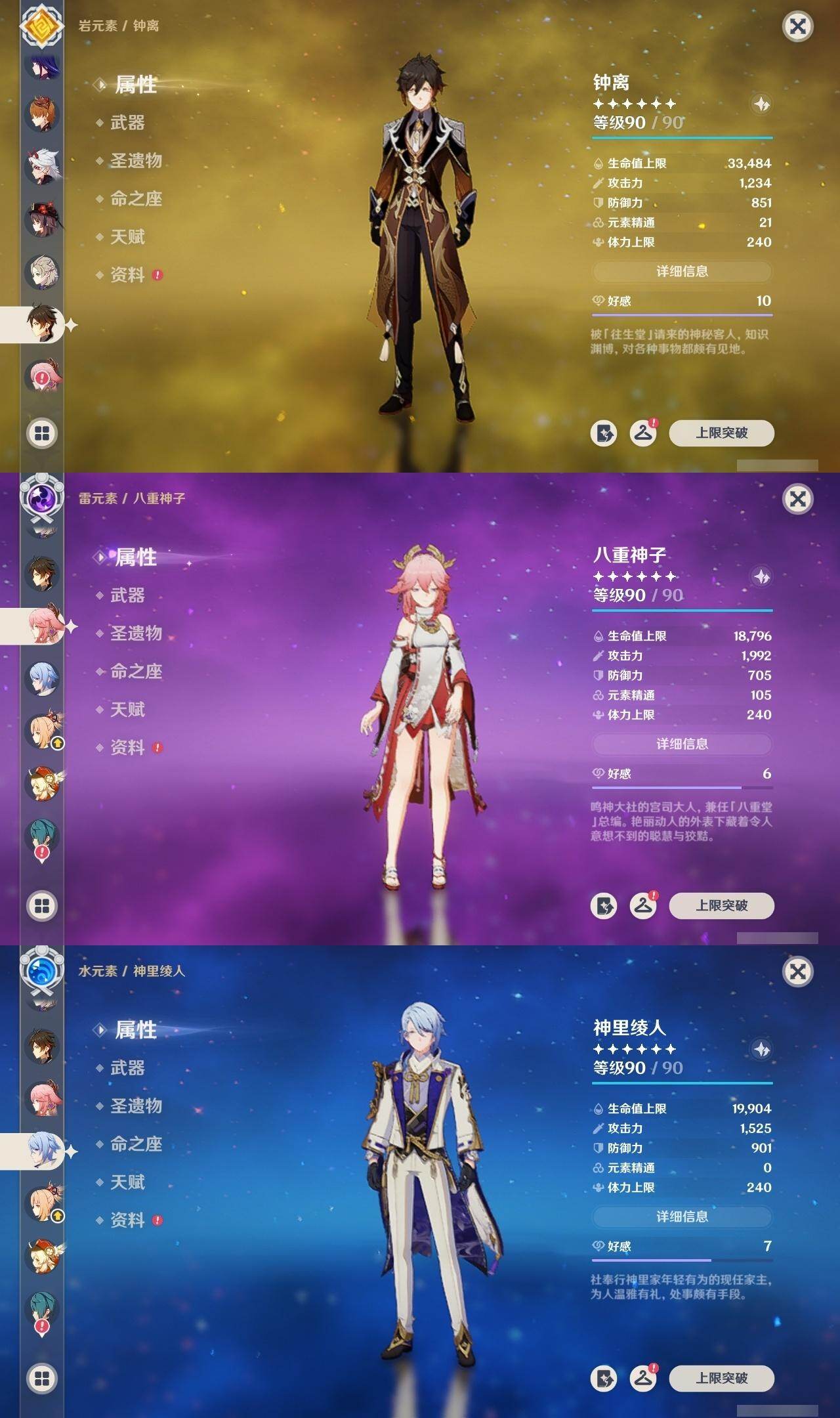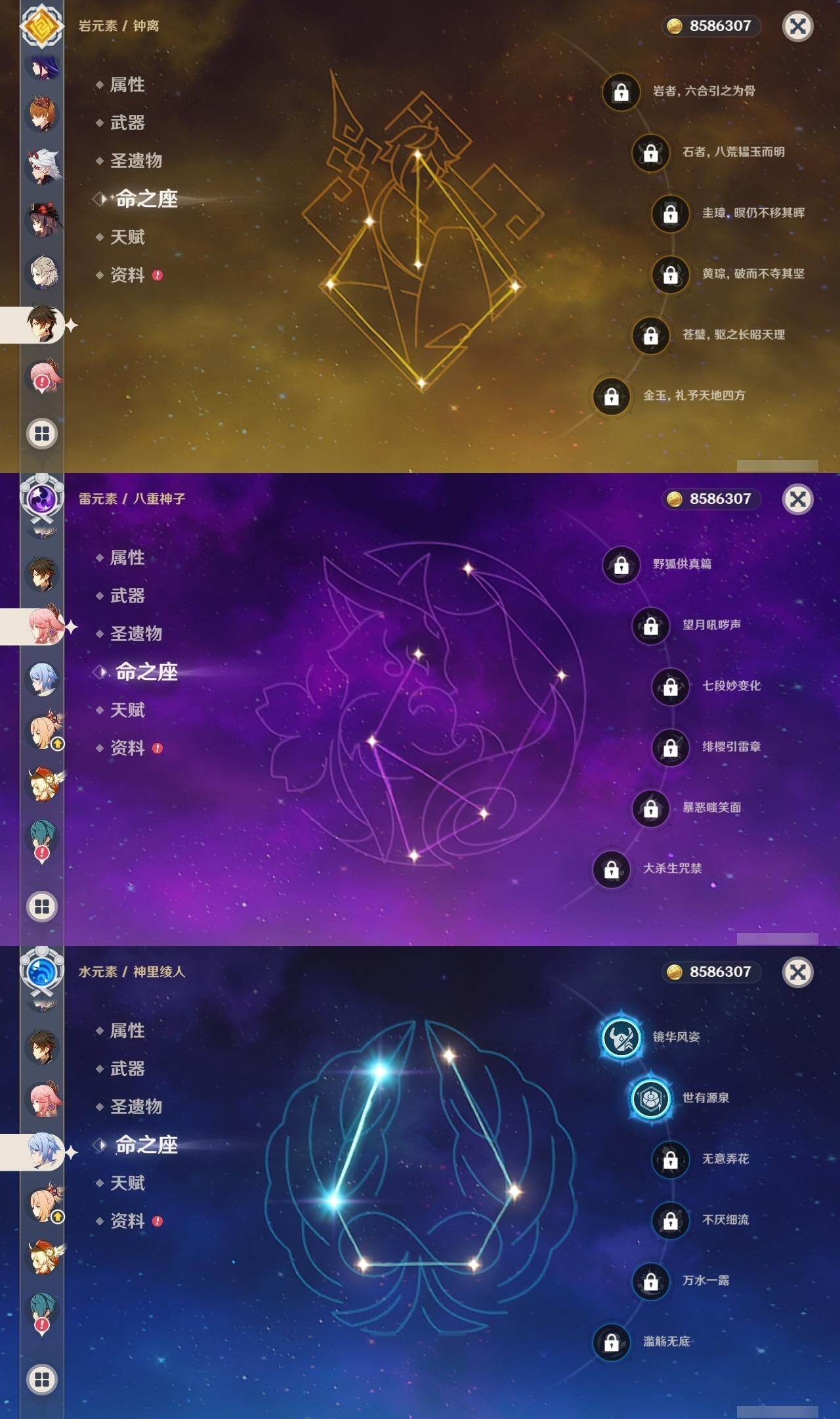 2命纳西妲,1命提纳里,2命神里绫人,0命八重神子,0命申鹤,满命荒泷一斗,满命雷电将军,2命枫原万叶,5命神里绫华,0命钟离,满命胡桃,满命宵宫,0命温迪,0命可莉,满命达达利亚,0命阿贝多,1命珊瑚宫心海,5命刻晴,满命七七,满命琴,4命莫娜,满命迪卢克,0命哥伦比娅,精1千夜浮梦,精1波乱月白经津,精1神乐之真意,精5赤角石溃杵,精1终末嗟叹之诗,精5冬极白星,精1不灭月华,精2薙草之稻光,精3飞雷之弦振,精5雾切之回光,精1苍古自由之誓,精5无工之剑,精5护摩之杖,精2磐岩结绿,精2四风原典,精1和璞鸢,精1天空之脊,精1天空之翼,精3天空之刃,精4尘世之锁,精3风鹰剑,精1狼的末路,精1天空之傲