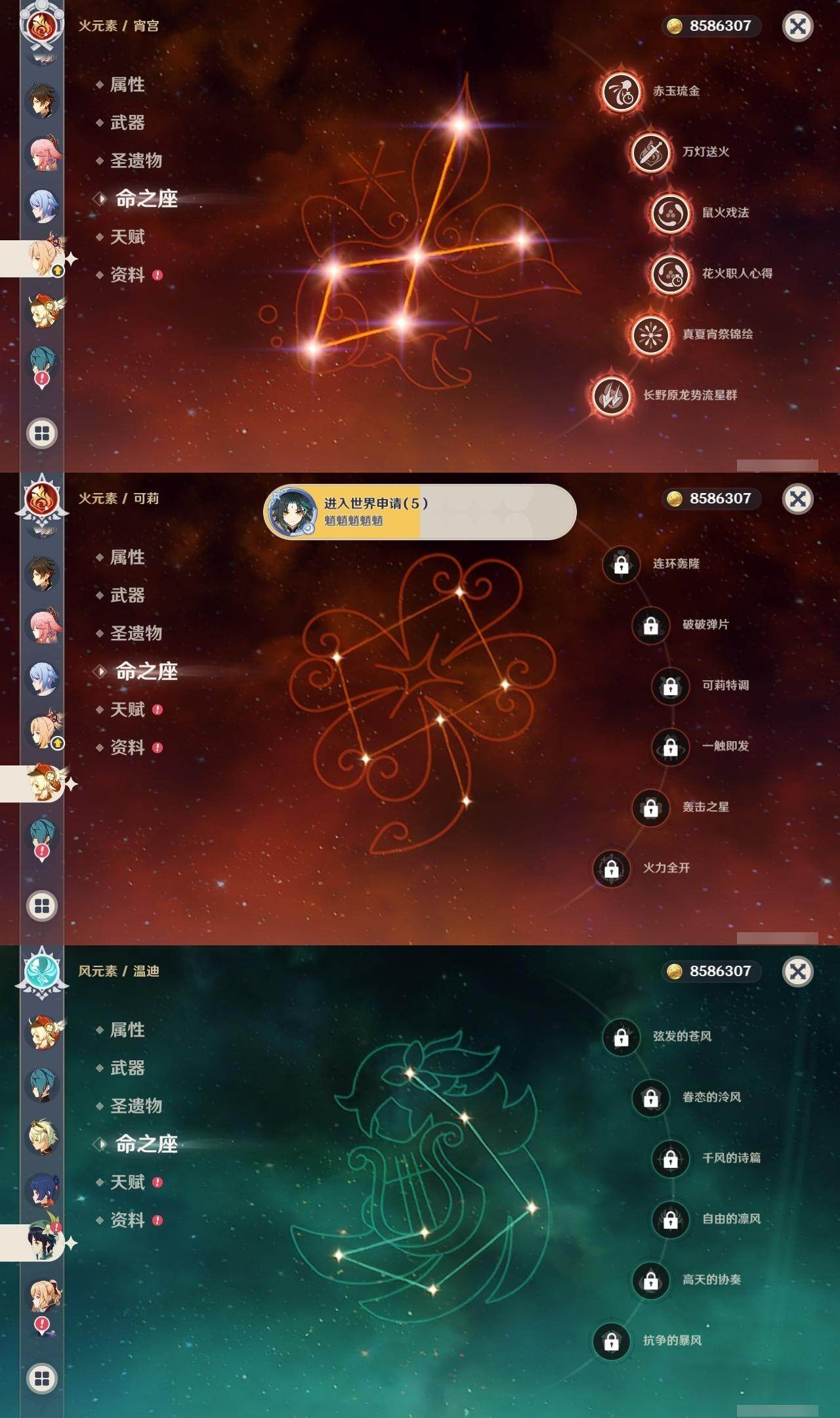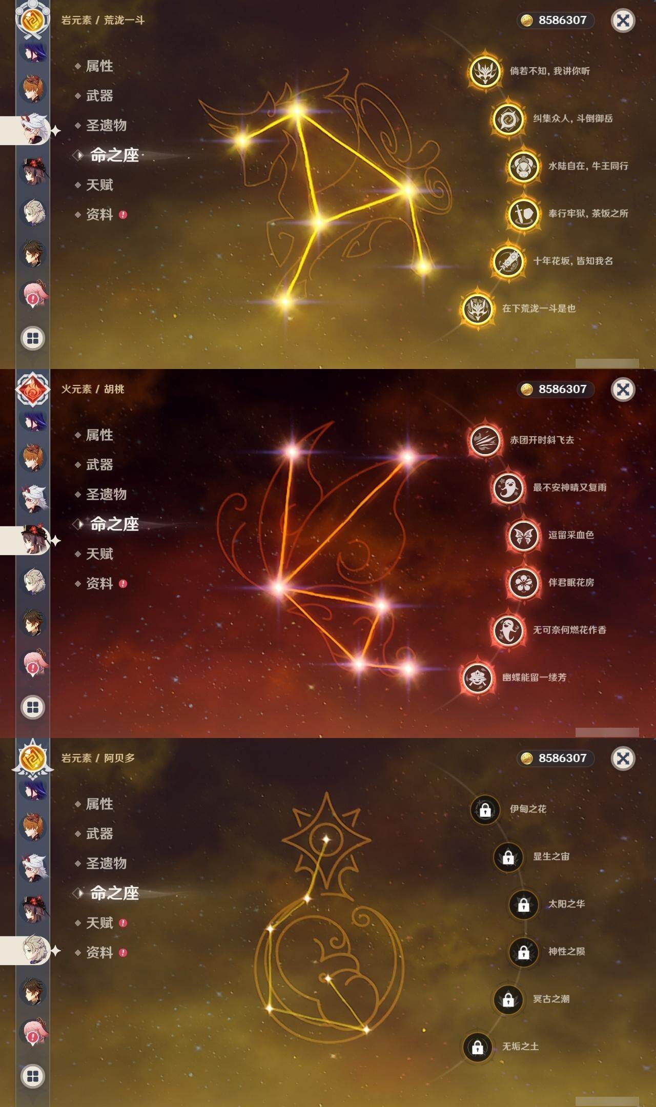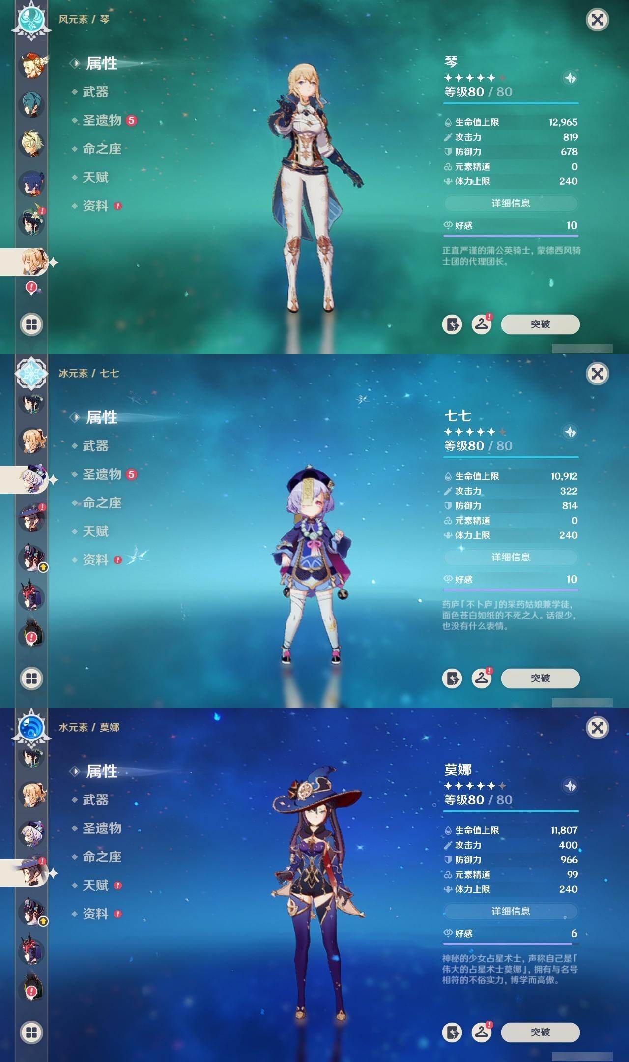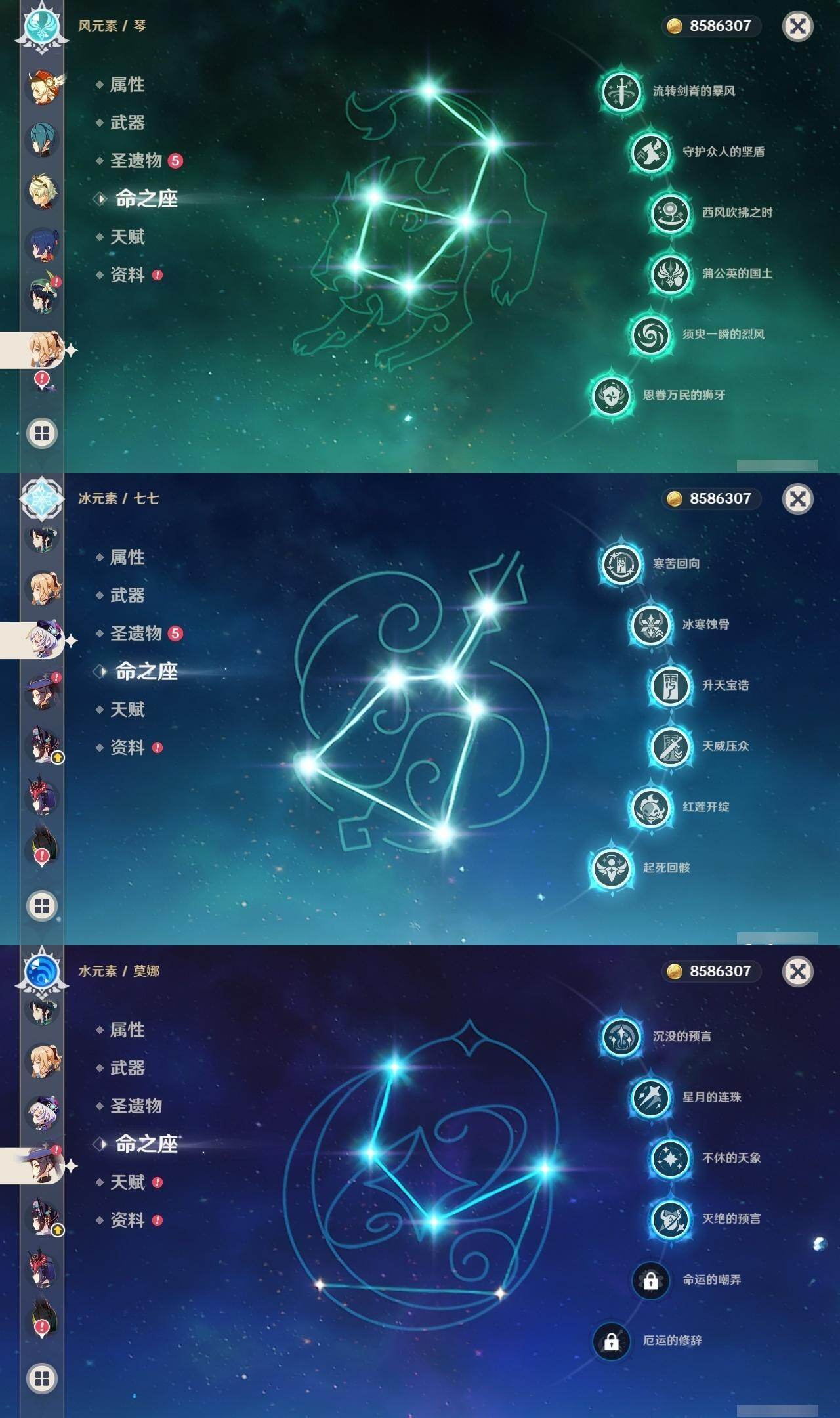 2命纳西妲,1命提纳里,2命神里绫人,0命八重神子,0命申鹤,满命荒泷一斗,满命雷电将军,2命枫原万叶,5命神里绫华,0命钟离,满命胡桃,满命宵宫,0命温迪,0命可莉,满命达达利亚,0命阿贝多,1命珊瑚宫心海,5命刻晴,满命七七,满命琴,4命莫娜,满命迪卢克,0命哥伦比娅,精1千夜浮梦,精1波乱月白经津,精1神乐之真意,精5赤角石溃杵,精1终末嗟叹之诗,精5冬极白星,精1不灭月华,精2薙草之稻光,精3飞雷之弦振,精5雾切之回光,精1苍古自由之誓,精5无工之剑,精5护摩之杖,精2磐岩结绿,精2四风原典,精1和璞鸢,精1天空之脊,精1天空之翼,精3天空之刃,精4尘世之锁,精3风鹰剑,精1狼的末路,精1天空之傲