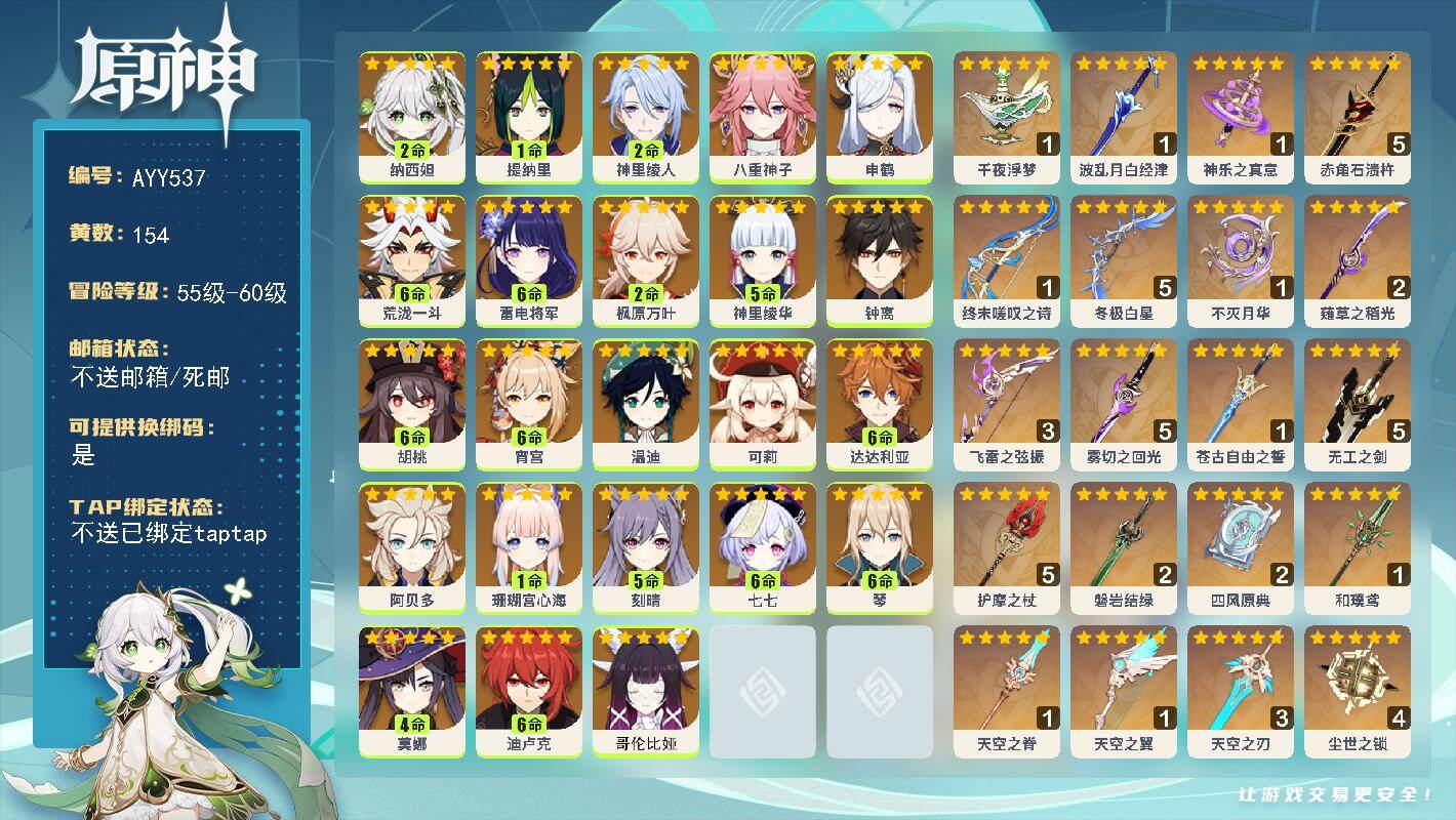 [17189302]【店主推荐捡漏号】58级/154黄/女主/23个五星角色/29个五星武器 2命纳西妲,1命提纳里,2命神里绫人,0命八重神子,0命申鹤,满命荒泷一斗,满命雷电将军,2命枫原万叶,5命神里绫华,0命钟离,满命胡桃,满命宵宫,0命温迪,0命可莉,满命达达利亚,0命阿贝多,1命珊瑚宫心海,5命刻晴,满命七七,满命琴,4命莫娜,满命迪卢克,0命哥伦比娅,精1千夜浮梦,精1波乱月白经津,精1神乐之真意,精5赤角石溃杵,精1终末嗟叹之诗,精5冬极白星,精1不灭月华,精2薙草之稻光,精3飞雷之弦振,精5雾切之回光,精1苍古自由之誓,精5无工之剑,精5护摩之杖,精2磐岩结绿,精2四风原典,精1和璞鸢,精1天空之脊,精1天空之翼,精3天空之刃,精4尘世之锁,精3风鹰剑,精1狼的末路,精1天空之傲
