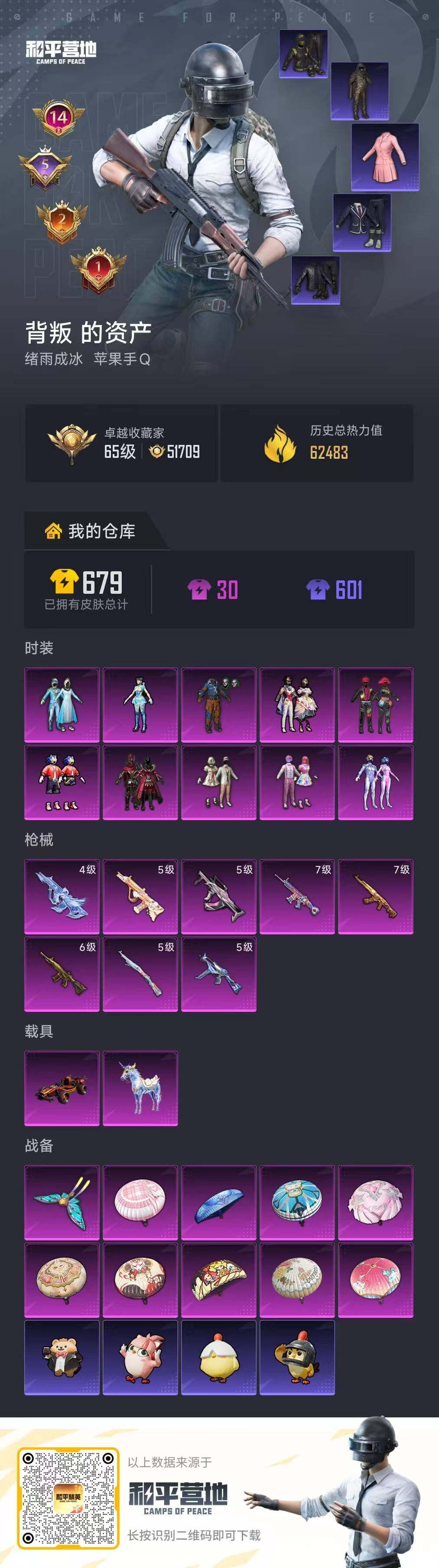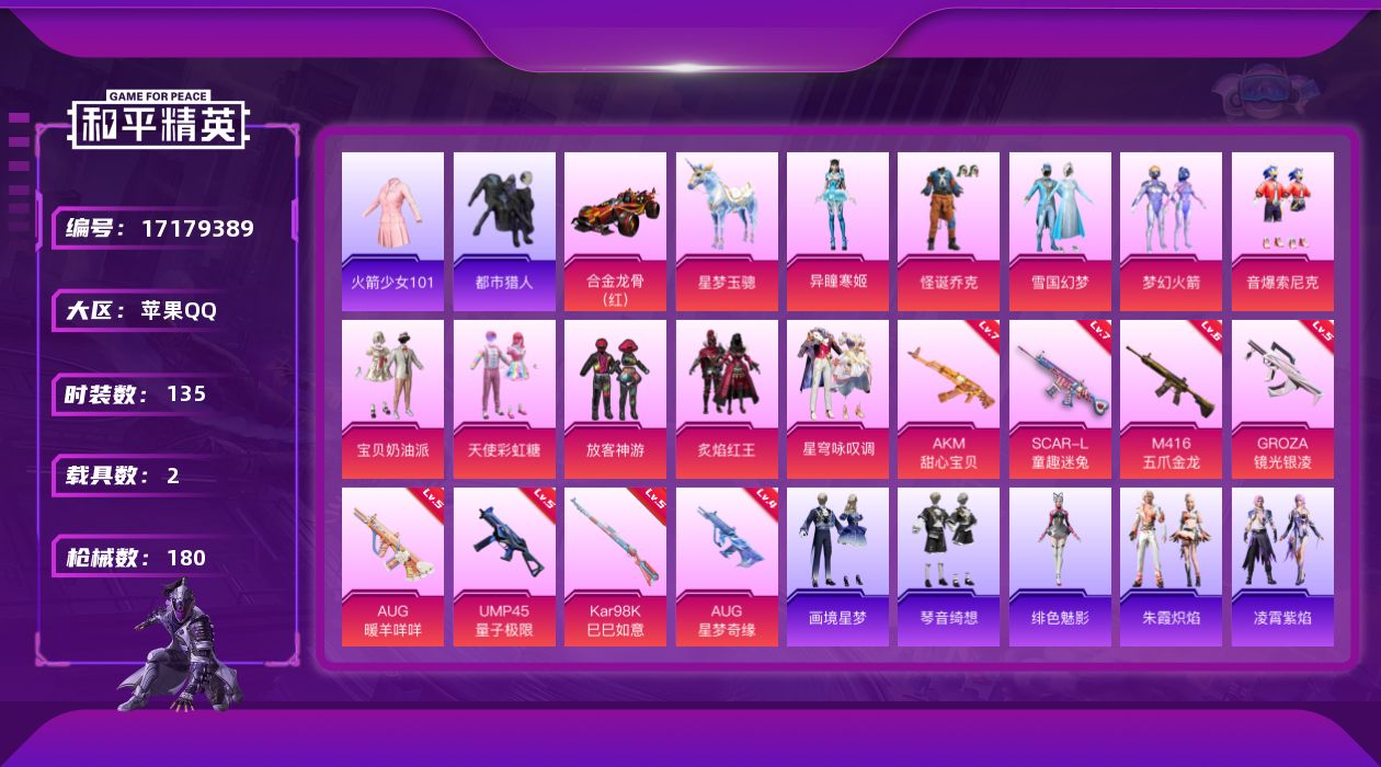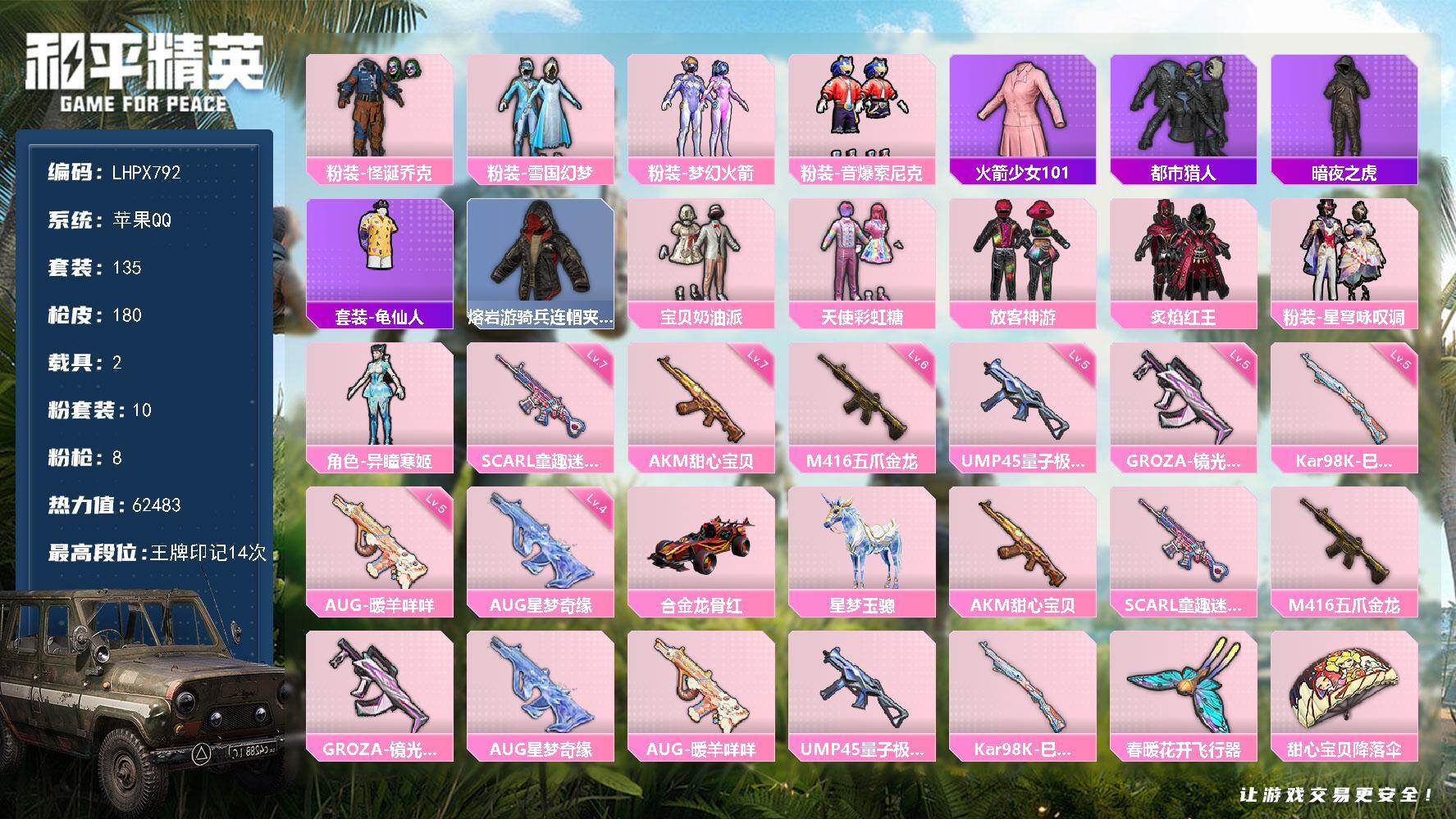 [17179389]老101【特价出售/店主推荐】苹果 手Q-10粉装-8特效枪-2载具-1粉色飞行器-62483热力值-14王牌印记-135套装-180枪皮