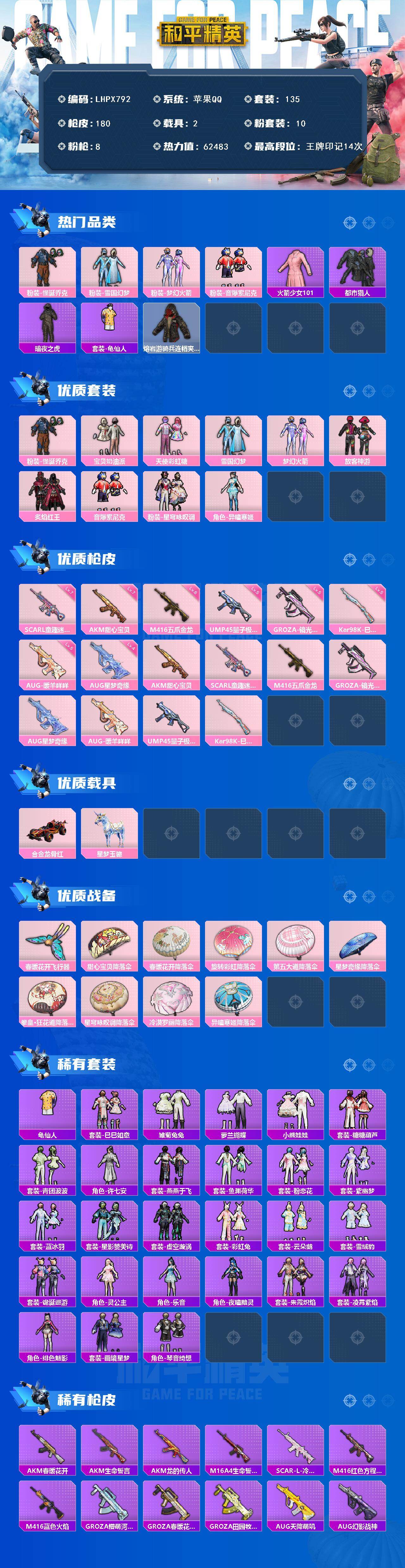 [17179389]老101【特价出售/店主推荐】苹果 手Q-10粉装-8特效枪-2载具-1粉色飞行器-62483热力值-14王牌印记-135套装-180枪皮 【热门品类】:粉装-怪诞乔克,粉装-雪国幻梦,粉装-梦幻火箭,粉装-音爆索尼克,套装-火箭少女101,套装-都市猎人,套装-暗夜之虎,套装-龟仙人,熔岩游骑兵连帽夹克 【粉色套装】:粉装-怪诞乔克,粉装-宝贝奶油派,粉装-天使彩虹糖,粉装-雪国幻梦,粉装-梦幻火箭,粉装-放客神游,粉装-炙焰红王,粉装-音爆索尼克,粉装-星穹咏叹调,角色-异瞳寒姬 【粉色枪皮等级】:AKM-甜心宝贝(七级),SCAR-L-童趣迷兔(七级),M416-五爪金龙(六级),GROZA-镜光银凌(五级),AUG-星梦奇缘(四级),AUG-暖羊咩咩(五级),UMP45-量子极限(五级),Kar98K-巳巳如意(五级) 【粉色载具】:合金龙骨(红),星梦玉骢 【粉色枪皮】:AKM-甜心宝贝,SCAR-L-童趣迷兔,M416-五爪金龙,GROZA-镜光银凌,AUG-星梦奇缘,AUG-暖羊咩咩,UMP45-量子极限,Kar98K-巳巳如意 【粉色飞行器】:春暖花开飞行器 【粉色降落伞】:甜心宝贝降落伞,春暖花开降落伞,旋转彩虹降落伞,第五大道降落伞,星梦奇缘降落伞,拳皇·狂花道降落伞,星穹咏叹调降落伞,冷漠罗丽降落伞,异瞳寒姬降落伞 【稀有套装】:套装-龟仙人,套装-巳巳如意,套装-雪国风尚,套装-雏菊兔兔,套装-萝兰蝴蝶,套装-小熊娃娃,套装-糖糖葫芦,套装-青团波波,角色-许七安,套装-燕燕于飞,套装-鱼渊荷华,套装-粉恋花,套装-紫幽梦,套装-蓝冰羽,套装-星影赞美诗,套装-虚空漩涡,套装-彩虹兔,套装-云朵鹅,套装-雪绒豹,套装-诡诞巡游,角色-灵公主,角色-乐音,角色-夜瞳黯灵,套装-朱霞炽焰,套装-凌霄紫焰,角色-绯色魅影,套装-画境星梦,套装-琴音绮想 【稀有枪皮】:AKM-春暖花开,AKM-生命誓言,AKM-龙的传人,M16A4-生命誓言,SCAR-L-冷漠罗丽,M416-红色方程式,M416-蓝色火焰,GROZA-懵萌河马,GROZA-春暖花开,GROZA-田园牧歌,AUG-天降萌叽,AUG-幻影战神,AUG-耀粉歌者,M762-天降萌叽,M762-甜心宝贝,M762-诡娃娃,M762-云朵鹅,Mk47-妙红点点,G36C-懵萌河马,G36C