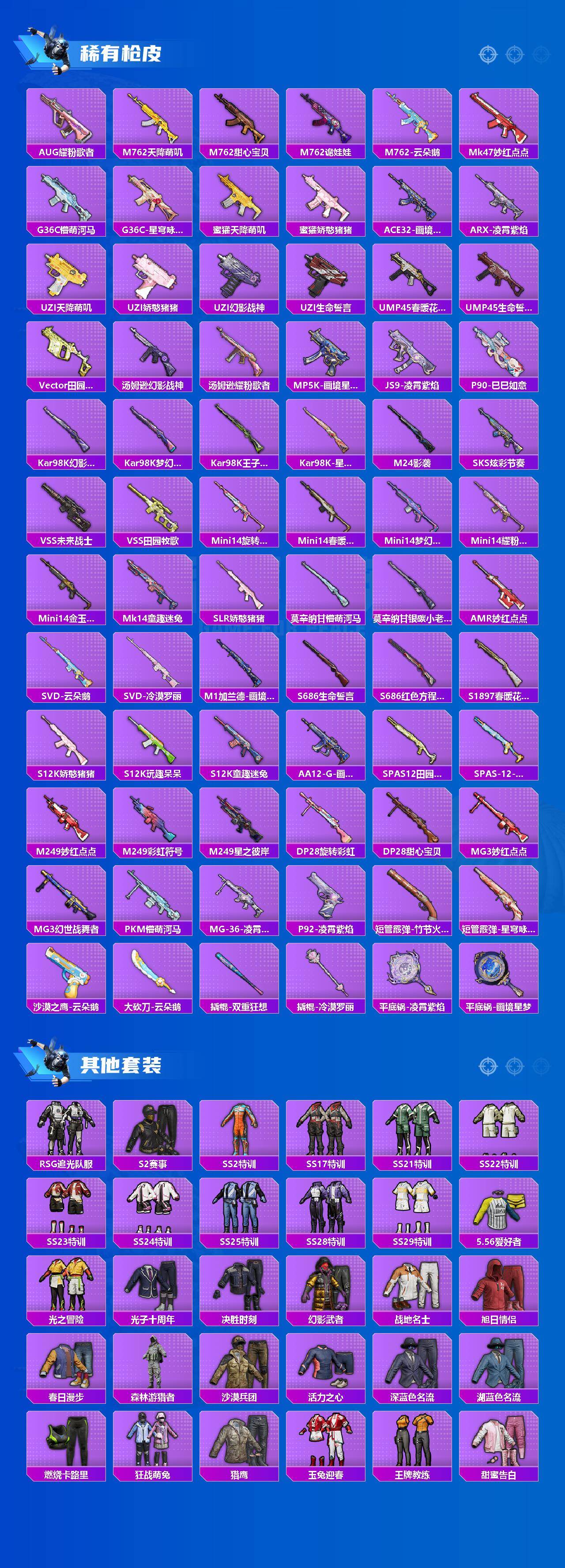 【稀有枪皮】:AKM-春暖花开,AKM-生命誓言,AKM-龙的传人,M16A4-生命誓言,SCAR-L-冷漠罗丽,M416-红色方程式,M416-蓝色火焰,GROZA-懵萌河马,GROZA-春暖花开,GROZA-田园牧歌,AUG-天降萌叽,AUG-幻影战神,AUG-耀粉歌者,M762-天降萌叽,M762-甜心宝贝,M762-诡娃娃,M762-云朵鹅,Mk47-妙红点点,G36C-懵萌河马,G36C