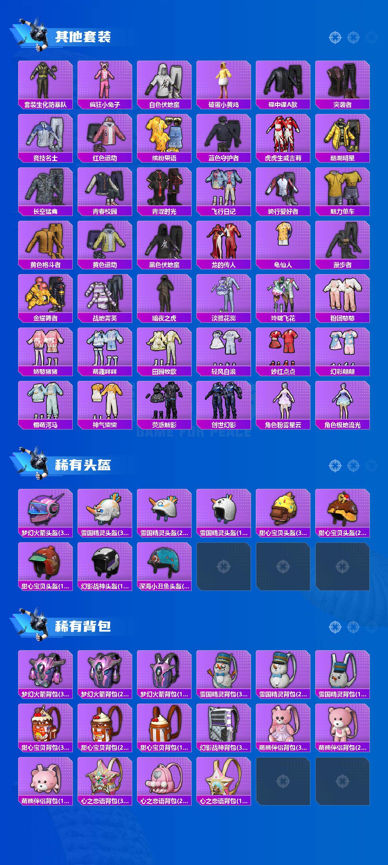 AKM-甜心宝贝,SCAR-L-童趣迷兔,M416-五爪金龙,GROZA-镜光银凌,AUG-星梦奇缘,AUG-暖羊咩咩,UMP45-量子极限,Kar98K-巳巳如意