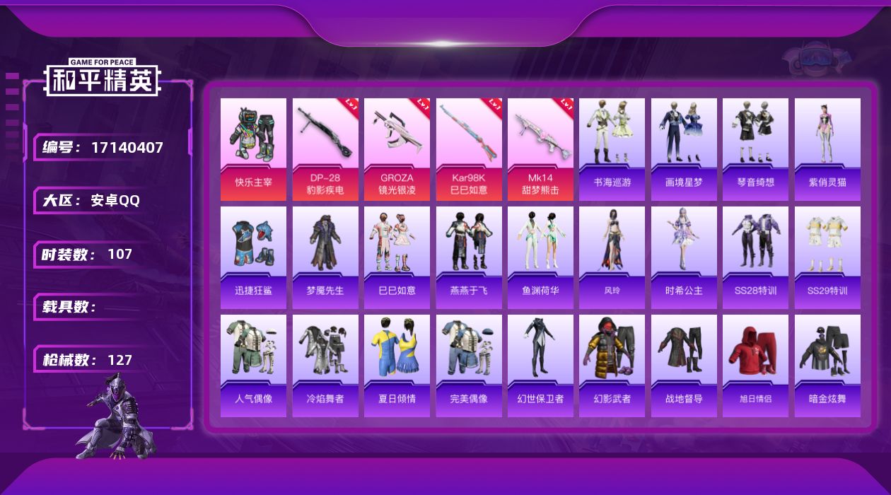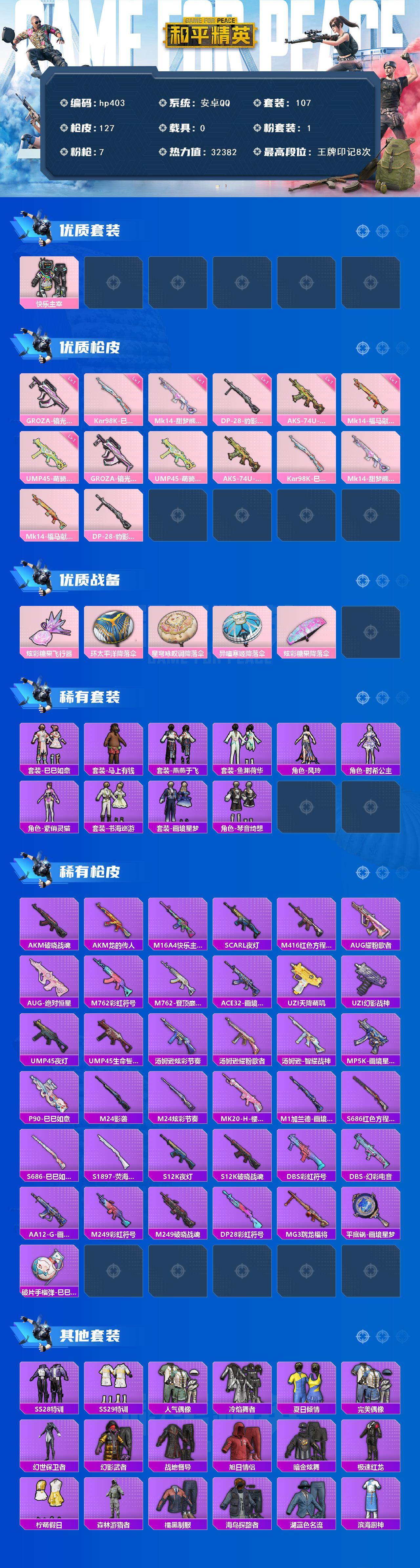 [17140407]安卓 手Q-1粉装-7特效枪-0载具-1粉色飞行器-32382热力值-8王牌印记-107套装-127枪皮 【粉色套装】:粉装-快乐主宰 【粉色枪皮等级】:GROZA-镜光银凌(一级),UMP45-萌骑冒险(一级),AKS-74U-森灵之息(一级),Kar98K-巳巳如意(一级),Mk14-甜梦熊击(一级),Mk14-福马献瑞(一级),DP-28-豹影疾电(一级) 【粉色枪皮】:GROZA-镜光银凌,UMP45-萌骑冒险,AKS-74U-森灵之息,Kar98K-巳巳如意,Mk14-甜梦熊击,Mk14-福马献瑞,DP-28-豹影疾电 【粉色飞行器】:炫彩糖果飞行器 【粉色降落伞】:环太平洋降落伞,星穹咏叹调降落伞,异瞳寒姬降落伞,炫彩糖果降落伞 【稀有套装】:套装-巳巳如意,套装-雪国风尚,套装-炫彩糖果,套装-马上有钱,套装-燕燕于飞,套装-鱼渊荷华,角色-风玲,角色-时希公主,角色-紫俏灵猫,套装-书海巡游,套装-画境星梦,套装-琴音绮想 【稀有枪皮】:AUG-冰晶雪宝,AKM-破晓战魂,AKM-龙的传人,M16A4-快乐主宰,SCAR-L-夜灯,M416-红色方程式,AUG-耀粉歌者,AUG-绝对恒星,M762-彩虹符号,M762-登顶巅峰,ACE32-画境星梦,UZI-天降萌叽,UZI-幻影战神,UMP45-夜灯,UMP45-生命誓言,汤姆逊-炫彩节奏,汤姆逊-耀粉歌者,汤姆逊-智耀战神,MP5K-画境星梦,P90-巳巳如意,M24-影袭,M24-炫彩节奏,MK20-H-樱桃泡泡,M1加兰德-画境星梦,S686-红色方程式,S686-巳巳如意,S1897-荧海星豚,S12K-破晓战魂,S12K-夜灯,DBS-彩虹符号,DBS-幻彩电音,AA12-G-画境星梦,M249-彩虹符号,M249-破晓战魂,DP-28-彩虹符号,MG3-瑞龙福将,平底锅-画境星梦,破片手榴弹-巳巳如意 【其他套装】:套装-SS28特训,套装-SS29特训,套装-人气偶像,套装-冷焰舞者,套装-夏日倾情,套装-完美偶像,套装-幻世保卫者,套装-幻影武者,套装-战地督导,套装-旭日情侣,套装-暗金炫舞,套装-极速红龙,套装-柠萌假日,套装-森林游猎者,套装-橘黑制服,套装-海岛探路者,套装-湖蓝色名流,套装-滨海厨神,套装-潮流炫酷,套装-灼焰舞者,套装-特战装甲,套装-特训学院,套装-猎