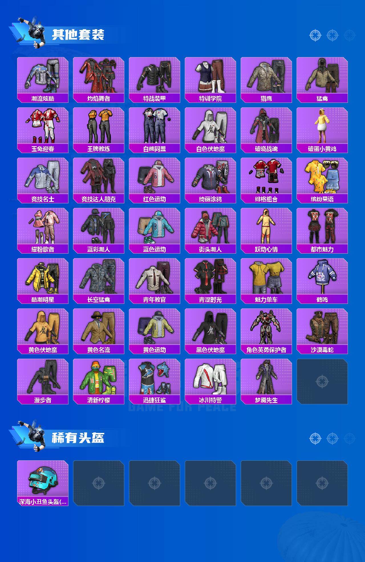 【其他套装】:套装-SS28特训,套装-SS29特训,套装-人气偶像,套装-冷焰舞者,套装-夏日倾情,套装-完美偶像,套装-幻世保卫者,套装-幻影武者,套装-战地督导,套装-旭日情侣,套装-暗金炫舞,套装-极速红龙,套装-柠萌假日,套装-森林游猎者,套装-橘黑制服,套装-海岛探路者,套装-湖蓝色名流,套装-滨海厨神,套装-潮流炫酷,套装-灼焰舞者,套装-特战装甲,套装-特训学院,套装-猎