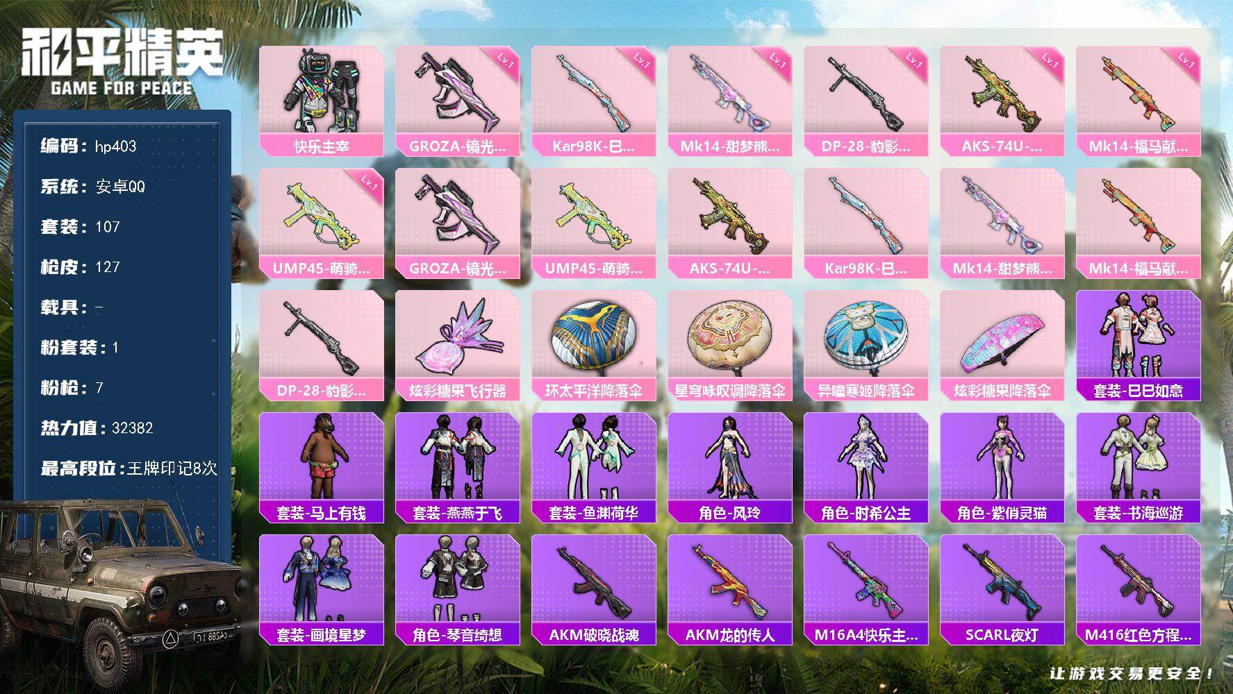 [17140407]安卓 手Q-1粉装-7特效枪-0载具-1粉色飞行器-32382热力值-8王牌印记-107套装-127枪皮