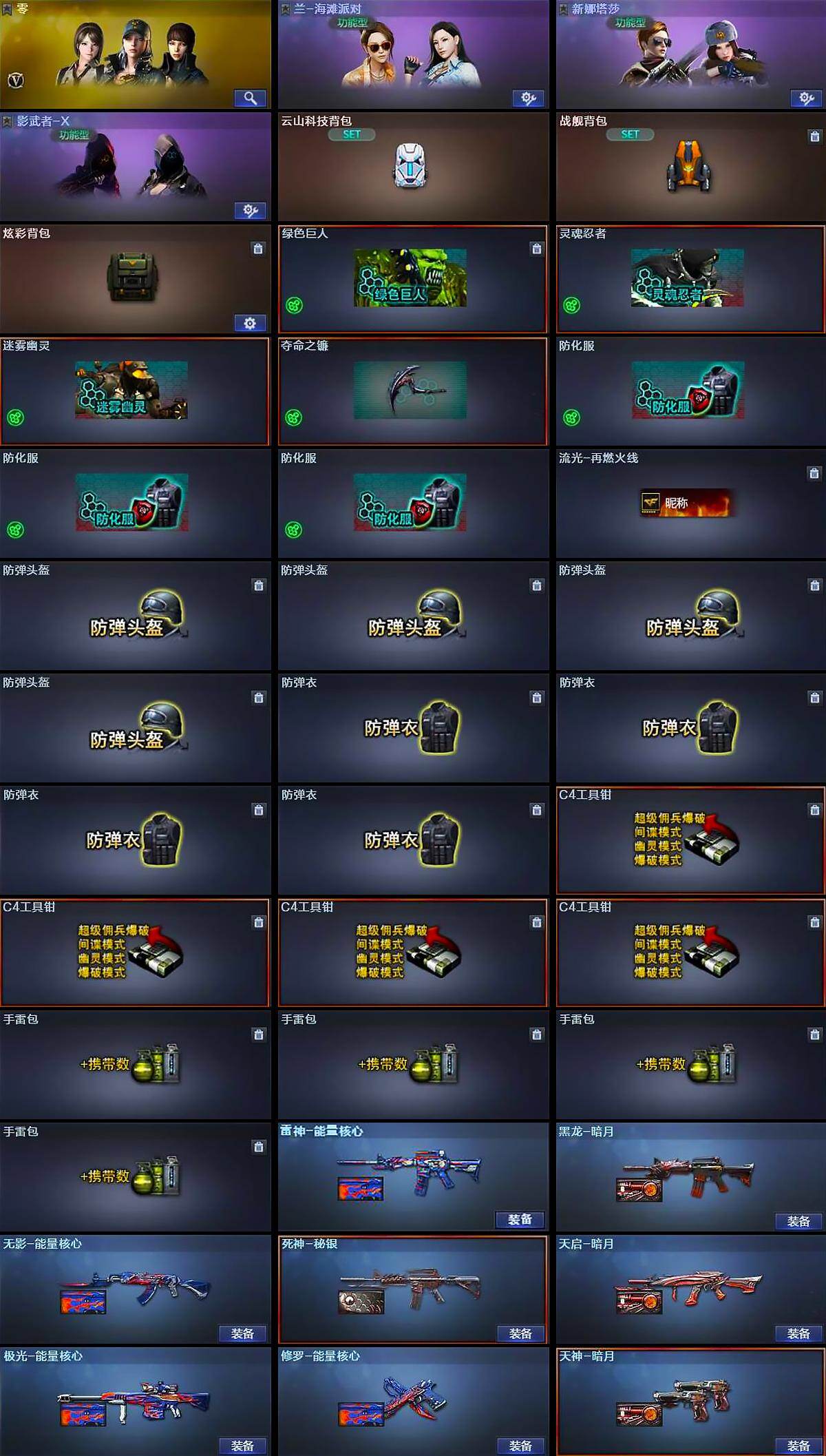 【道具】:云山科技背包,战舰背包,炫彩背包,绿色巨人,灵魂忍者,迷雾幽灵,夺命之镰,防化服*3,流光-再燃火线,防弹头盔*4,防弹衣*4,C4工具钳*4,手雷包*4