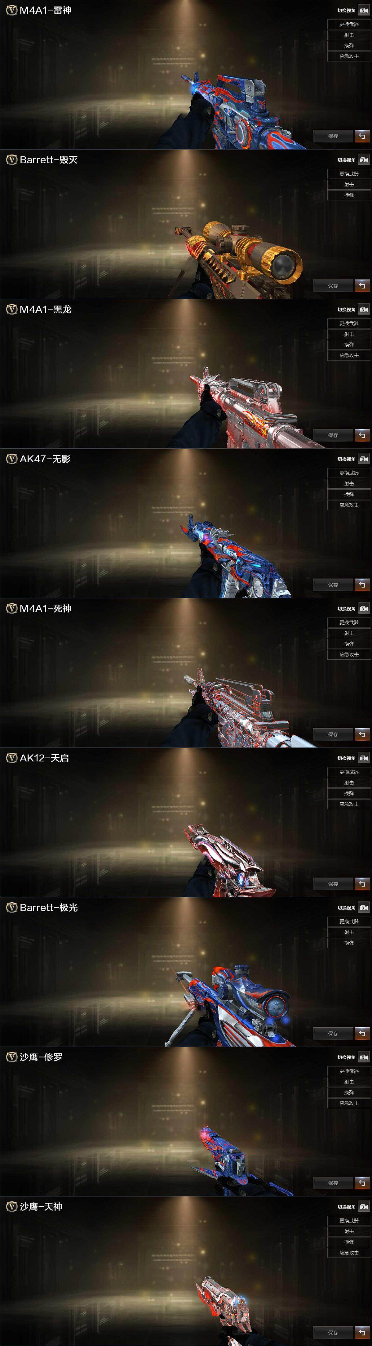 【英雄级武器】:AK47-火麒麟*2,M4A1-黑龙,M4A1-雷神,M4A1-黑骑士,AK47-无影,AK47-黑武士,AN94-超新星,M4A1-武圣,M4A1-龙血,M4A1-玫瑰精灵,AWM-天龙,Barrett-毁灭,Barrett-极光,汤姆逊-烈龙,沙鹰-修罗*4,沙鹰-天神,Glock18-武圣,屠龙,龙啸*2,擎天,麒麟刺