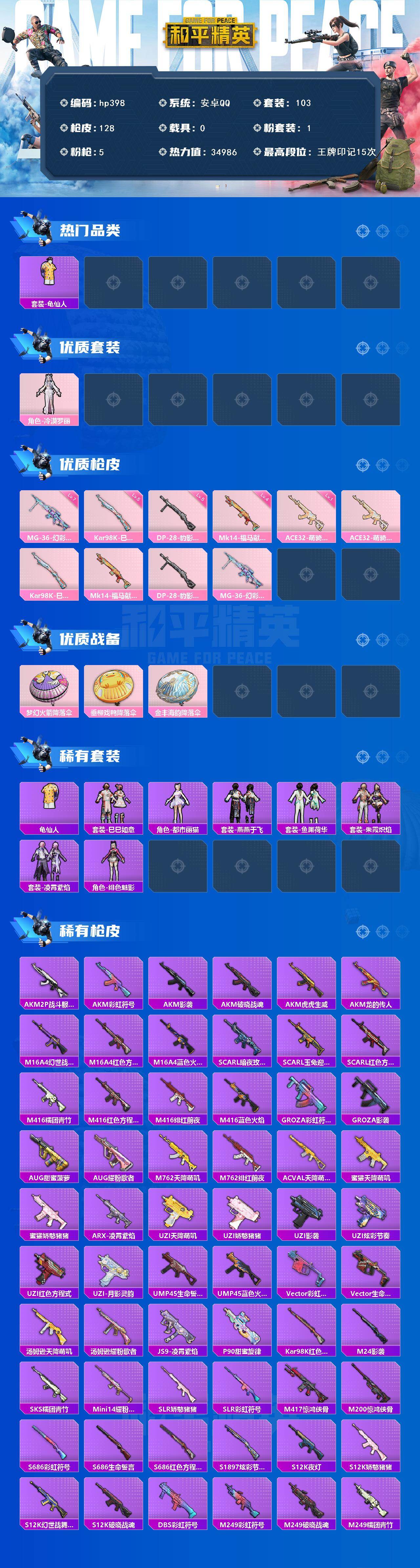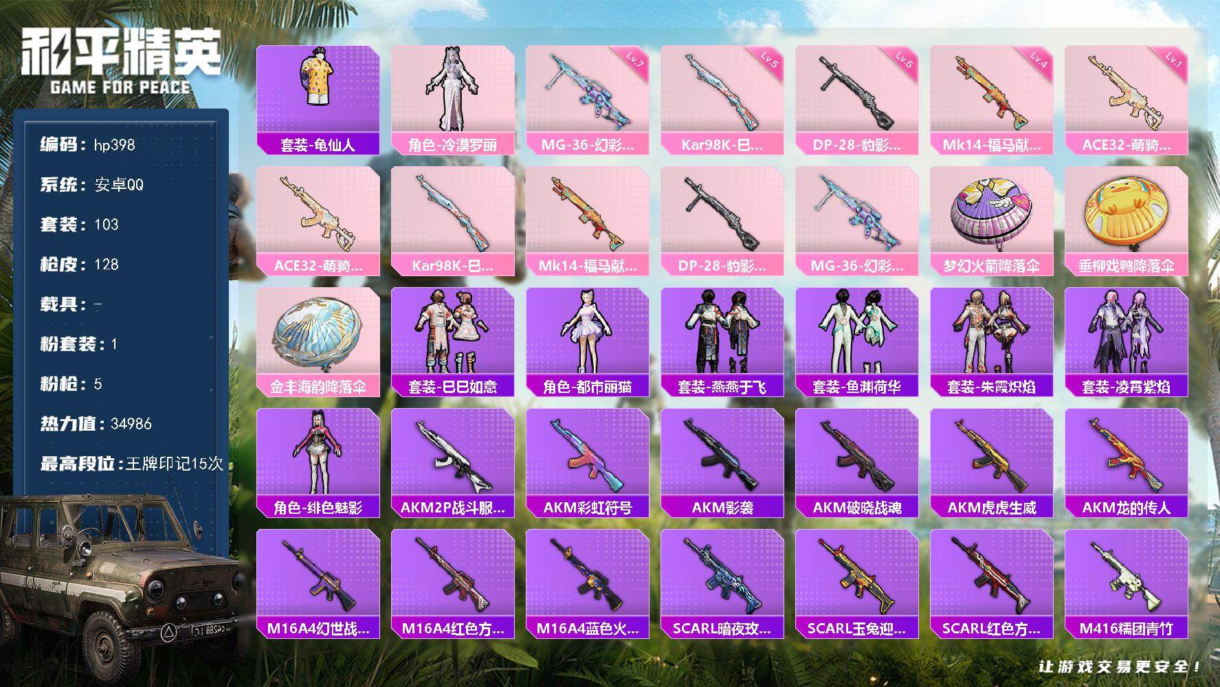 [17140487]安卓 手Q-1粉装-5特效枪-0载具-0粉色飞行器-34986热力值-15王牌印记-103套装-128枪皮 【热门品类】:套装-龟仙人 【粉色套装】:角色-冷漠罗丽 【粉色枪皮等级】:ACE32-萌骑漫游(一级),Kar98K-巳巳如意(五级),Mk14-福马献瑞(四级),DP-28-豹影疾电(五级),MG-36-幻彩电音(七级) 【粉色枪皮】:ACE32-萌骑漫游,Kar98K-巳巳如意,Mk14-福马献瑞,DP-28-豹影疾电,MG-36-幻彩电音 【粉色降落伞】:梦幻火箭降落伞,垂柳戏鸭降落伞,金丰海韵降落伞 【稀有套装】:套装-龟仙人,套装-巳巳如意,角色-都市丽猫,套装-燕燕于飞,套装-鱼渊荷华,套装-朱霞炽焰,套装-凌霄紫焰,角色-绯色魅影 【稀有枪皮】:AKM-2P战斗服款,AKM-彩虹符号,AKM-影袭,AKM-破晓战魂,AKM-虎虎生威,AKM-龙的传人,M16A4-幻世战舞者,M16A4-红色方程式,M16A4-蓝色火焰,SCAR-L-暗夜玫瑰,SCAR-L-玉兔迎春,SCAR-L-红色方程式,M416-糯团青竹,M416-红色方程式,M416-绯红前夜,M416-蓝色火焰,GROZA-彩虹符号,GROZA-影袭,AUG-甜蜜菠萝,AUG-耀粉歌者,M762-天降萌叽,M762-绯红前夜,AC-VAL-天降萌叽,蜜獾-天降萌叽,蜜獾-娇憨猪猪,ARX-凌霄紫焰,UZI-天降萌叽,UZI-娇憨猪猪,UZI-影袭,UZI-炫彩节奏,UZI-红色方程式,UZI-月影灵韵,UMP45-生命誓言,UMP45-蓝色火焰,Vector-彩虹符号,Vector-生命誓言,汤姆逊-天降萌叽,汤姆逊-耀粉歌者,JS9-凌霄紫焰,P90-甜蜜旋律,Kar98K-红色方程式,M24-影袭,SKS-糯团青竹,Mini14-耀粉歌者,SLR-娇憨猪猪,SLR-彩虹符号,M417-惊鸿侠骨,M200-惊鸿侠骨,S686-彩虹符号,S686-生命誓言,S686-红色方程式,S1897-炫彩节奏,S12K-破晓战魂,S12K-夜灯,S12K-娇憨猪猪,S12K-幻世战舞者,DBS-彩虹符号,M249-彩虹符号,M249-破晓战魂,M249-糯团青竹,M249-绯穹魔姬,DP-28-彩虹符号,MG3-惊鸿侠骨,MG-36-凌霄紫焰,P92-凌霄紫焰,战术弩-江南烟雨,爆炸猎弓-惊