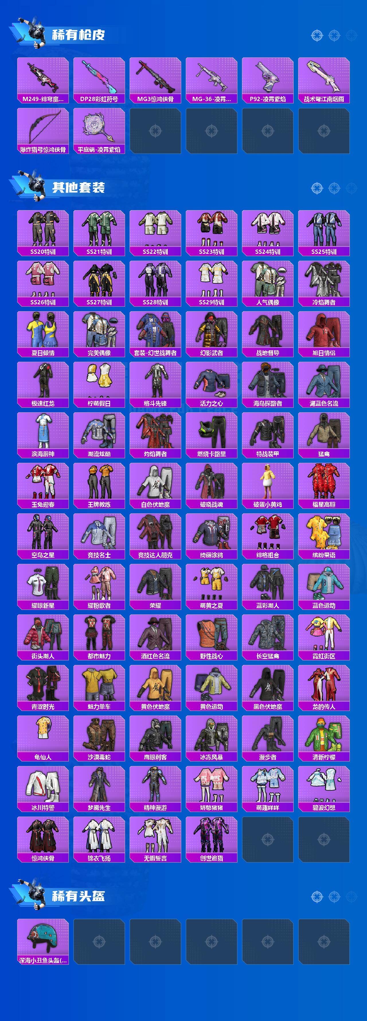 【稀有枪皮】:AKM-2P战斗服款,AKM-彩虹符号,AKM-影袭,AKM-破晓战魂,AKM-虎虎生威,AKM-龙的传人,M16A4-幻世战舞者,M16A4-红色方程式,M16A4-蓝色火焰,SCAR-L-暗夜玫瑰,SCAR-L-玉兔迎春,SCAR-L-红色方程式,M416-糯团青竹,M416-红色方程式,M416-绯红前夜,M416-蓝色火焰,GROZA-彩虹符号,GROZA-影袭,AUG-甜蜜菠萝,AUG-耀粉歌者,M762-天降萌叽,M762-绯红前夜,AC-VAL-天降萌叽,蜜獾-天降萌叽,蜜獾-娇憨猪猪,ARX-凌霄紫焰,UZI-天降萌叽,UZI-娇憨猪猪,UZI-影袭,UZI-炫彩节奏,UZI-红色方程式,UZI-月影灵韵,UMP45-生命誓言,UMP45-蓝色火焰,Vector-彩虹符号,Vector-生命誓言,汤姆逊-天降萌叽,汤姆逊-耀粉歌者,JS9-凌霄紫焰,P90-甜蜜旋律,Kar98K-红色方程式,M24-影袭,SKS-糯团青竹,Mini14-耀粉歌者,SLR-娇憨猪猪,SLR-彩虹符号,M417-惊鸿侠骨,M200-惊鸿侠骨,S686-彩虹符号,S686-生命誓言,S686-红色方程式,S1897-炫彩节奏,S12K-破晓战魂,S12K-夜灯,S12K-娇憨猪猪,S12K-幻世战舞者,DBS-彩虹符号,M249-彩虹符号,M249-破晓战魂,M249-糯团青竹,M249-绯穹魔姬,DP-28-彩虹符号,MG3-惊鸿侠骨,MG-36-凌霄紫焰,P92-凌霄紫焰,战术弩-江南烟雨,爆炸猎弓-惊