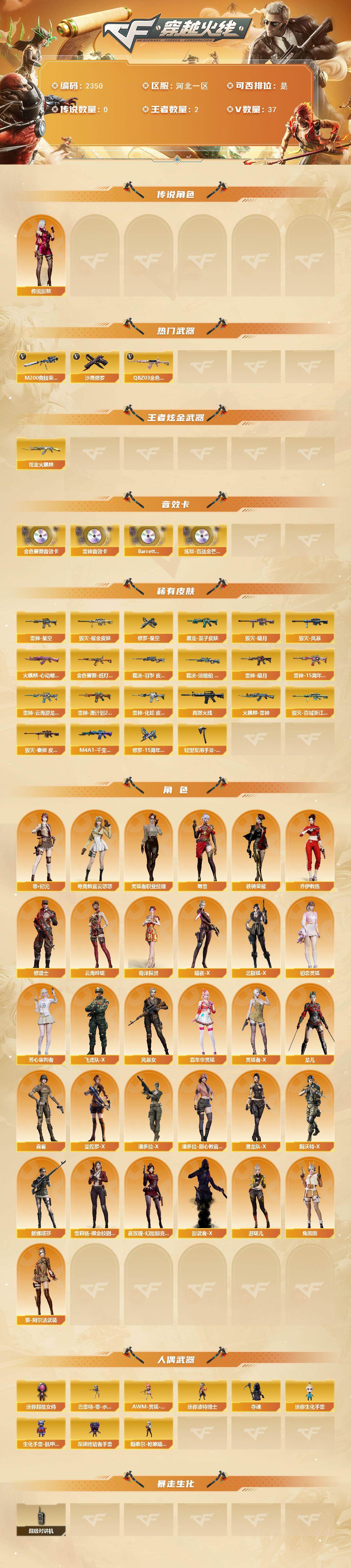 [17146257]河北一区-40V-2王者武器数-1炫金武器数 【传说角色】:传说影煞 【热门武器】:QBZ03-金色蔷薇,M200-竞技荣光,沙鹰-修罗 【王者炫金武器】:炫金火麒麟 【音效卡】:M4A1-雷神音效卡,QBZ03-金色蔷薇音效卡,Barrett-碧霄极光音效卡,炼狱-百战金芒-庆典舞曲音效卡 【皮肤】:金色蔷薇-纸灯龙皮肤,裁决-羽掣 皮肤,裁决-运输船 皮肤,雷神-暗月,雷神-星空,雷神-15周年嘉年华 皮肤,雷神-云海游龙皮肤,雷神-源计划2.0专属 皮肤,雷神-化蛇 皮肤,M4A1-再燃火线,火麒麟-雷神,火麒麟-心动糖果,毁灭-暗月,毁灭耀金皮肤,毁灭-风暴,毁灭-百城浙江 皮肤,毁灭-秦师 皮肤,M4A1-千变-孔明皮肤,黑龙-墨子皮肤,修罗-星空,修罗-15周年嘉年华 皮肤,轻型军用手斧-再燃火线 【角色】:电竞教官-云悠悠,零·纪元,奇洋探员,乔伊教练,修道士,云海玲珑,葵-阿尔法武装,暗夜-X,北极狐-X,初恋灵狐,芳心审判者,飞虎队-X,风暴女,嘉年华灵狐,灵狐者-X,灵狐者-职业经理,龙儿,麻雀,曼陀罗-X,潘多拉-X,潘多拉-甜心教官,潜龙队-X,斯沃特-X,蜀雪,铁骑荣耀,兔囡囡,新娜塔莎,雪莉杨-摸金校尉,夜玫瑰-幻能朋克,影武者-X,游珑儿 【人偶武器】:巴雷特-零-水下丽影,斯泰尔-枪娘暗刃,AWM-灵狐-15周年嘉年华*3,迷你波特博士,夺魂,迷你生化手雷*2,生化手雷-机甲核心*3,深渊终结者手雷*2,迷你超能女侍 【暴走生化】:超级对讲机 【挑战大师】:激光毁灭者III-白马银枪,神圣爆裂者-末日III 【英雄级武器】:M4A1-雷神*2,无影-神兵利器,黑武士-锦绣游龙,QBZ03-金色蔷薇,Barrett-毁灭,AWM-裁决,M200-竞技荣光,炼狱-百战金芒,沙鹰-修罗,柯尔特-竞技荣光,屠龙,麒麟刺,擎天-竞技荣光,擎天-云海游龙,麒麟刺-百战金芒,雷霆王者之锋-觉醒版,高爆手雷-幻灵,高爆手雷-竞技荣光*2,高爆手雷-云龙,手雷-云海游龙,手雷-热带奇洋,高爆手雷-雷霆王者-觉醒版,闪光弹-幻灵,闪光弹-竞技荣光*2,闪光弹-云龙,烟雾弹-幻灵,烟雾弹-竞技荣光*2,烟雾弹-云龙 【道具】:BS战队炫彩背包,CFS限定背包,亚洲杯纪念炫彩背包,全能枪王背包,奇洋探员-海龟背包,女皇终结者-背包,百战金芒炫彩背包,老虎背