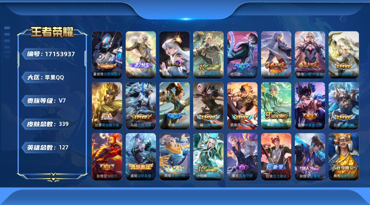 [17153937]苹果Q-V7-尊贵铂金IV段位-127英雄-339皮肤-1典藏皮肤-1无双-15传说-104史诗