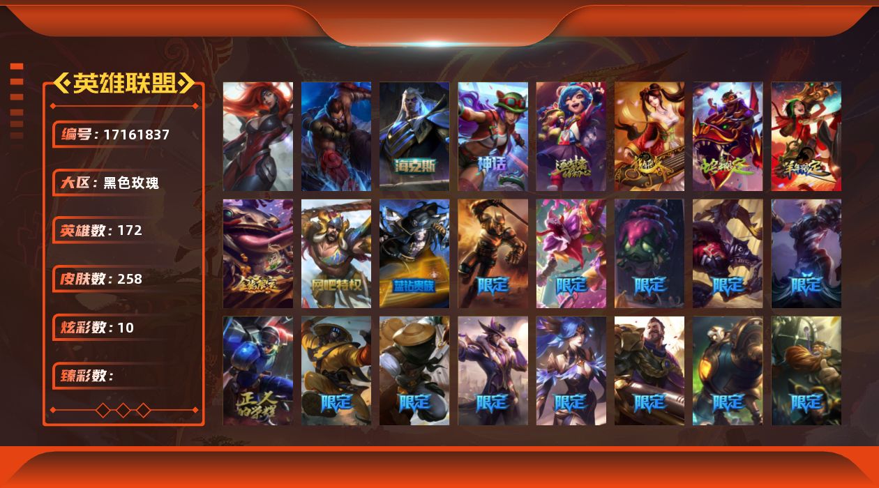 [17161837]黄金段位-172英雄-258皮肤-10炫彩-2终极-3神话-42限定-22传说-70史诗