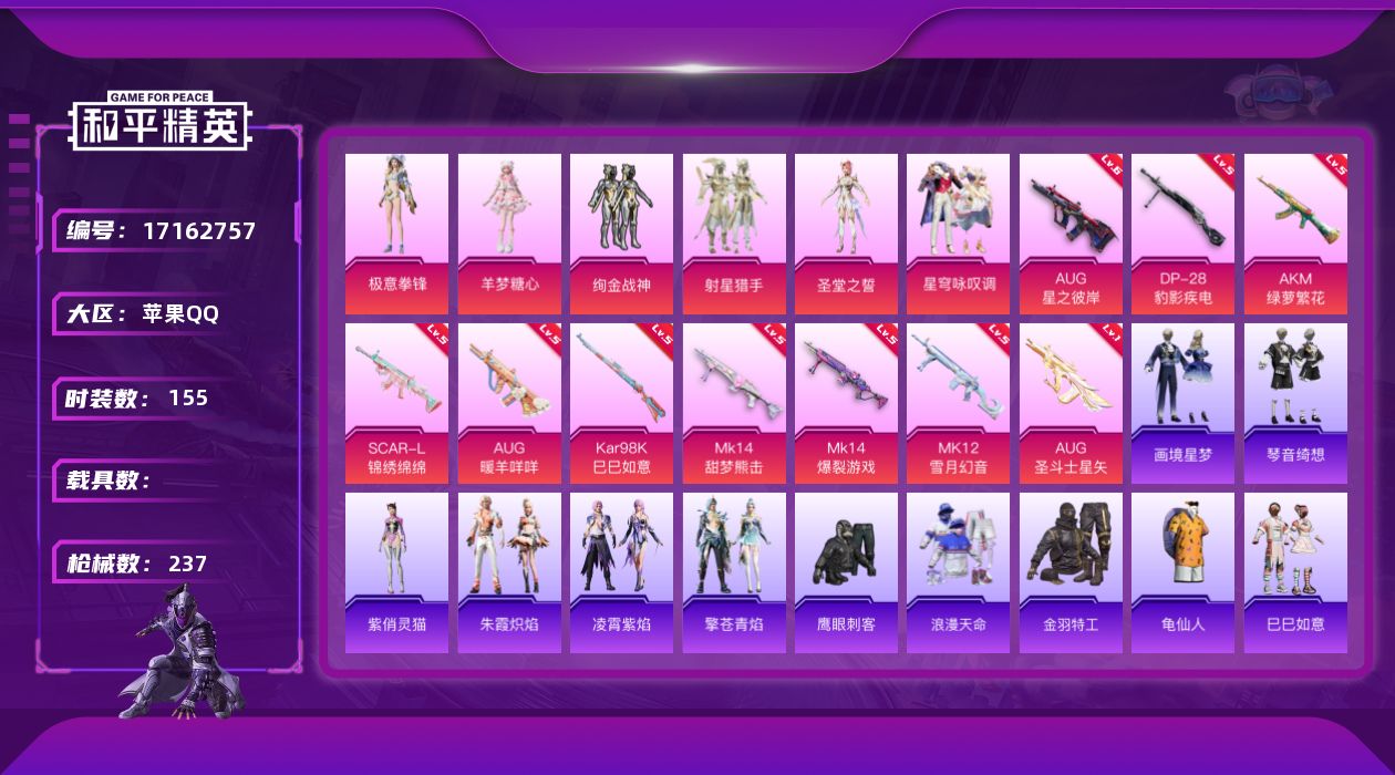 [17162757]苹果 手Q-6粉装-12特效枪-0载具-1粉色飞行器-66894热力值-6王牌印记-155套装-237枪皮