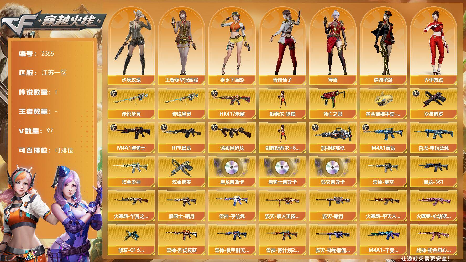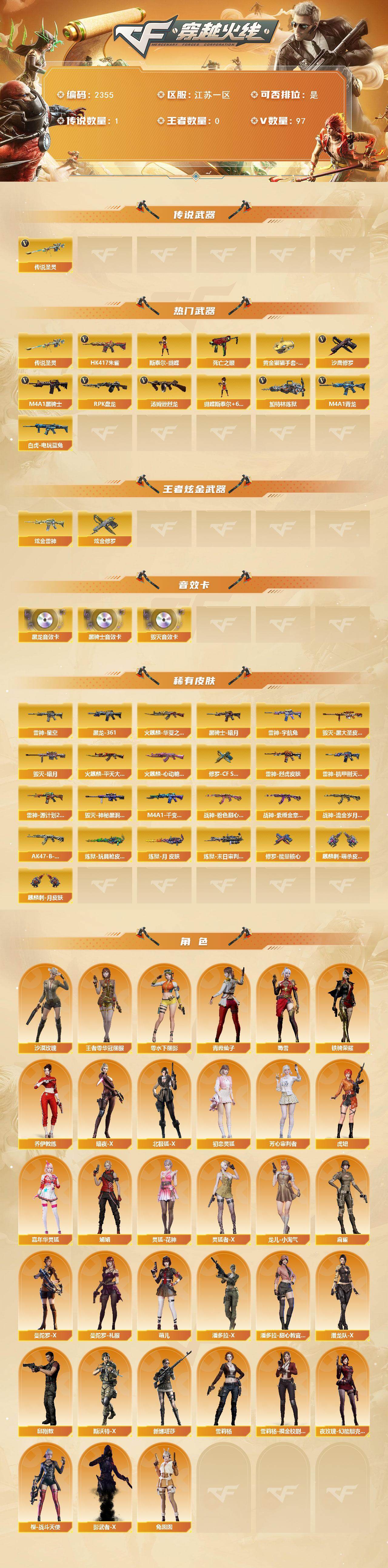 [17176997]江苏一区-97V-0王者武器数-2炫金武器数 【传说武器】:传说圣灵 【热门武器】:传说圣灵,HK417-朱雀,M4A1-青龙,死亡之眼,白虎-电玩蓝兔,M4A1-黑骑士*2,汤姆逊-烈龙*6,RPK-盘龙*6,加特林-炼狱,斯泰尔-蝴蝶,沙鹰-修罗,黄金猫猫手套-白鲨 【王者炫金武器】:炫金雷神,炫金修罗 【音效卡】:M4A1-黑龙音效卡,M4A1-黑骑士音效卡,Barrett-毁灭音效卡 【皮肤】:雷神-星空,雷神-烈虎皮肤,雷神-机甲刑天皮肤,雷神-宇航兔皮肤,雷神-源计划2.0专属 皮肤,火麒麟-华夏之心,火麒麟-平天大圣,火麒麟-心动糖果,毁灭-暗月,毁灭-黑大圣皮肤,毁灭-神秘黑洞皮肤,M4A1-千变-孔明皮肤,M4A1-黑龙-361*5,黑骑士-暗月,战神-粉色甜心皮肤,战神-紫绶金章皮肤,战神-流金岁月皮肤,AK47-B-常胜将军-刘备,炼狱-玩具枪皮肤,炼狱-月 皮肤,炼狱-末日审判 皮肤,修罗-CF STAR,修罗-能量核心,麒麟刺-萌杀皮肤,麒麟刺-月皮肤 【角色】:沙漠玫瑰,王者零-华冠丽服,乔伊教练,暗夜-X,北极狐-X,初恋灵狐,芳心审判者,虎妞,嘉年华灵狐,娟娟,零-水下丽影,灵狐-花神,灵狐者-X,龙儿-小淘气,麻雀,曼陀罗-X,曼陀罗-礼服,萌儿,潘多拉-X,潘多拉-甜心教官,潜龙队-X,邱刚敖,青霞仙子,斯沃特-X,蜀雪,铁骑荣耀,兔囡囡,新娜塔莎,雪莉杨,雪莉杨-摸金校尉,夜玫瑰-幻能朋克,樱-战斗天使,影武者-X 【人偶武器】:天龙-曼陀罗,火麒麟-灵狐,M4A1-雷神-精英刀锋,斯泰尔-蝴蝶,AWM-灵狐-15周年嘉年华,迷你深渊冰龙,迷你火种,迷你生化手雷*7,生化手雷-机甲核心,闪光弹-小乔,迷你艾比,迷你超能女侍,灵狐娃娃手雷 【暴走生化】:死亡之眼,超级对讲机 【挑战大师】:神圣爆裂者III,KAC-圣炎切割者III,神圣爆裂者-末日III 【英雄级武器】:M4A1-千变,AK47-火麒麟*2,M4A1-黑龙,M4A1-雷神,M4A1-黑骑士*2,AK47-无影,AN94-超新星,M4A1-青龙,HK417-朱雀,无影-神兵利器,9A91-烈火*2,烈火-动感闪耀,AK-47-猩红传说*6,AK47-B-战神,黑骑士-海王*3,白虎-电玩蓝兔,Barrett-毁灭,Barrett-电竞装甲,RPK-盘龙*6,加特林
