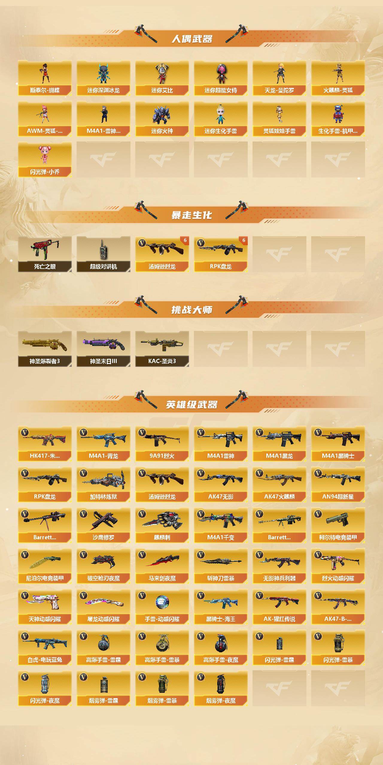 【人偶武器】:天龙-曼陀罗,火麒麟-灵狐,M4A1-雷神-精英刀锋,斯泰尔-蝴蝶,AWM-灵狐-15周年嘉年华,迷你深渊冰龙,迷你火种,迷你生化手雷*7,生化手雷-机甲核心,闪光弹-小乔,迷你艾比,迷你超能女侍,灵狐娃娃手雷