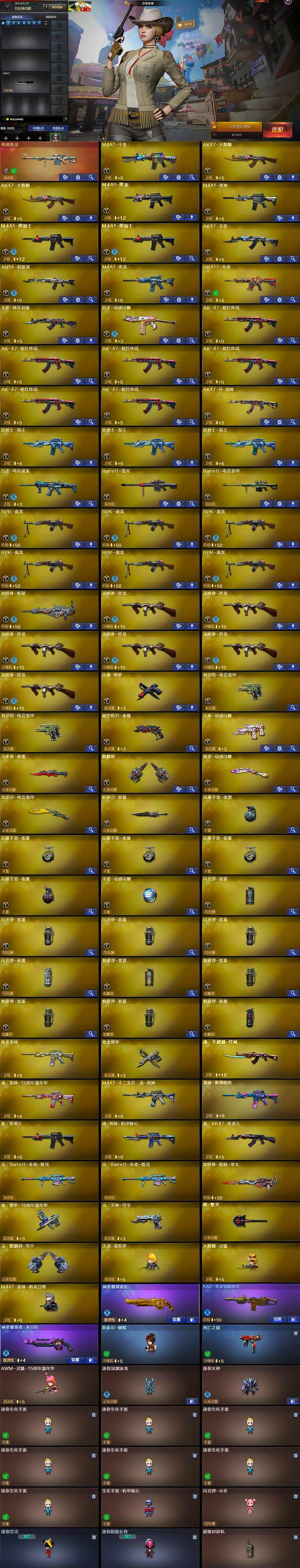 【英雄级武器】:M4A1-千变,AK47-火麒麟*2,M4A1-黑龙,M4A1-雷神,M4A1-黑骑士*2,AK47-无影,AN94-超新星,M4A1-青龙,HK417-朱雀,无影-神兵利器,9A91-烈火*2,烈火-动感闪耀,AK-47-猩红传说*6,AK47-B-战神,黑骑士-海王*3,白虎-电玩蓝兔,Barrett-毁灭,Barrett-电竞装甲,RPK-盘龙*6,加特林