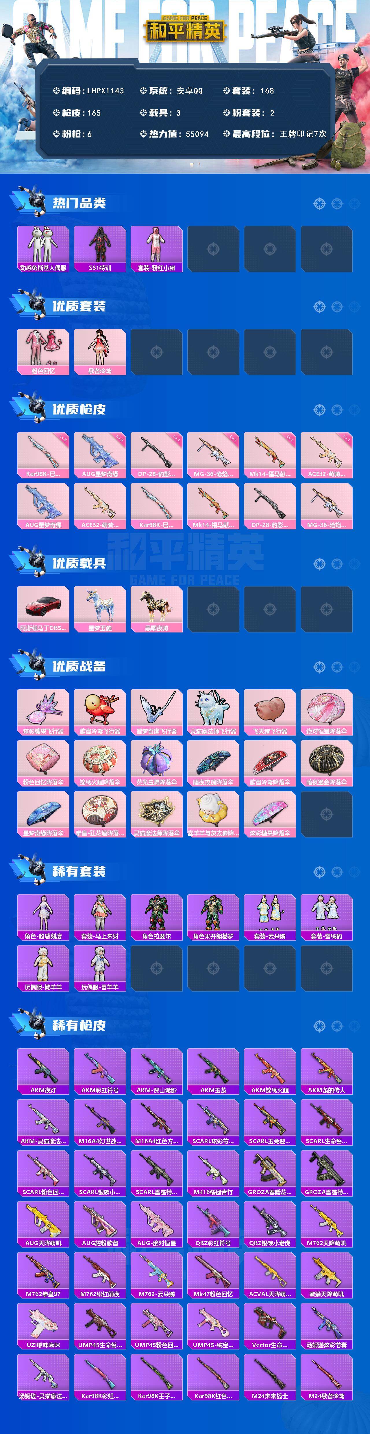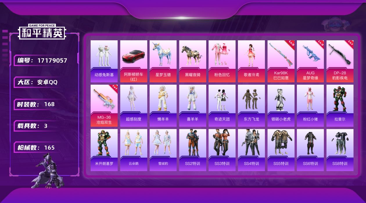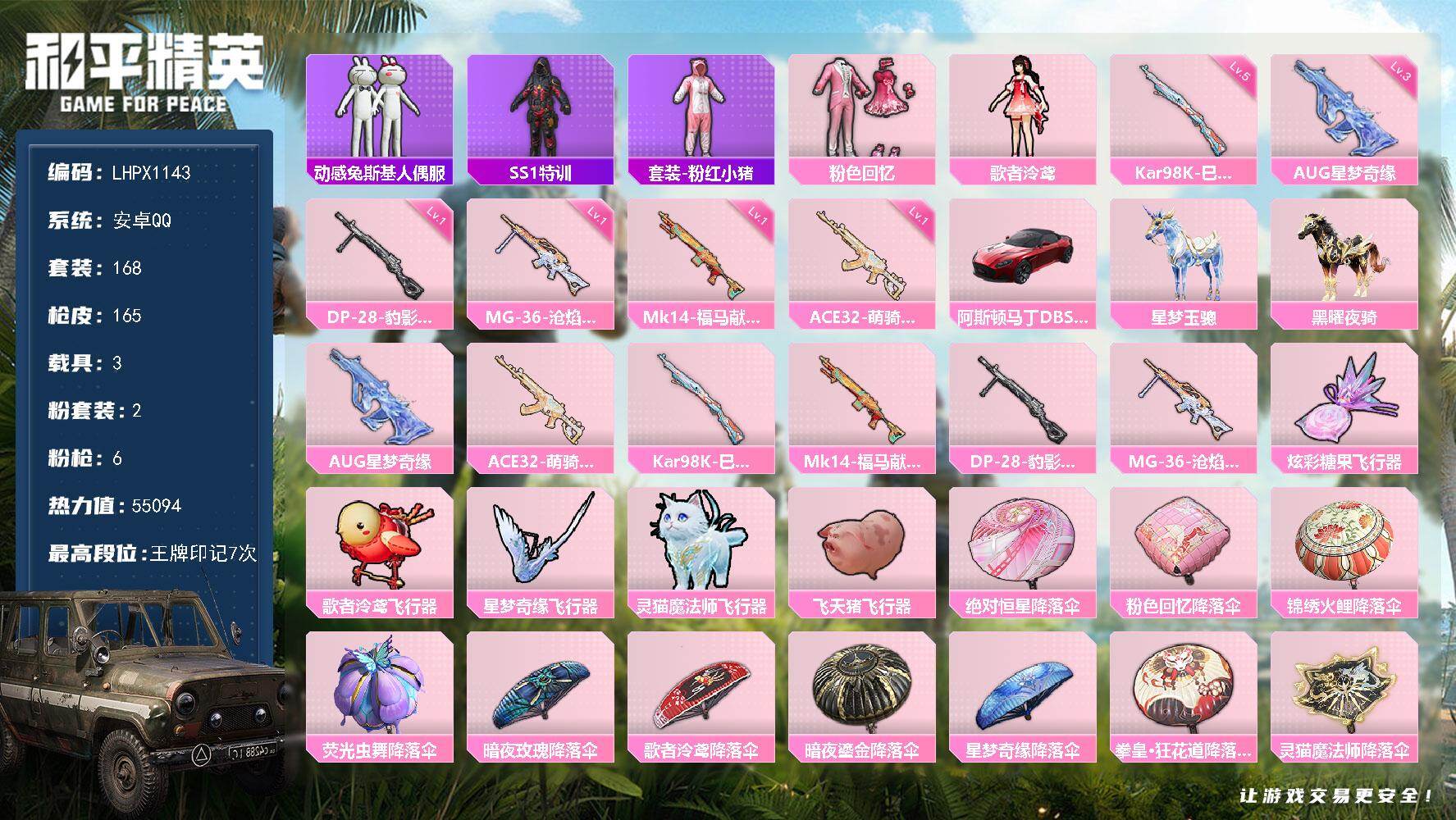 [17179057]【特价出售/店主推荐】安卓 手Q-2粉装-6特效枪-3载具-5粉色飞行器-55094热力值-7王牌印记-168套装-165枪皮【热门品类】:套装-动感兔斯基人偶服,套装-SS1特训,套装-粉红小猪【粉色套装】:粉装-粉色回忆,角色-歌者泠鸢【粉色枪皮等级】:AUG-星梦奇缘(三级),ACE32-萌骑漫游(一级),Kar98K-巳巳如意(五级),Mk14-福马献瑞(一级),DP-28-豹影疾电(一级),MG-36-沧焰双生(一级)【粉色载具】:阿斯顿马丁DBS(红),星梦玉骢,黑曜夜骑【粉色枪皮】:AUG-星梦奇缘,ACE32-萌骑漫游,Kar98K-巳巳如意,Mk14-福马献瑞,DP-28-豹影疾电,MG-36-沧焰双生【粉色飞行器】:炫彩糖果飞行器,歌者泠鸢飞行器,星梦奇缘飞行器,灵猫魔法师飞行器,飞天猪飞行器