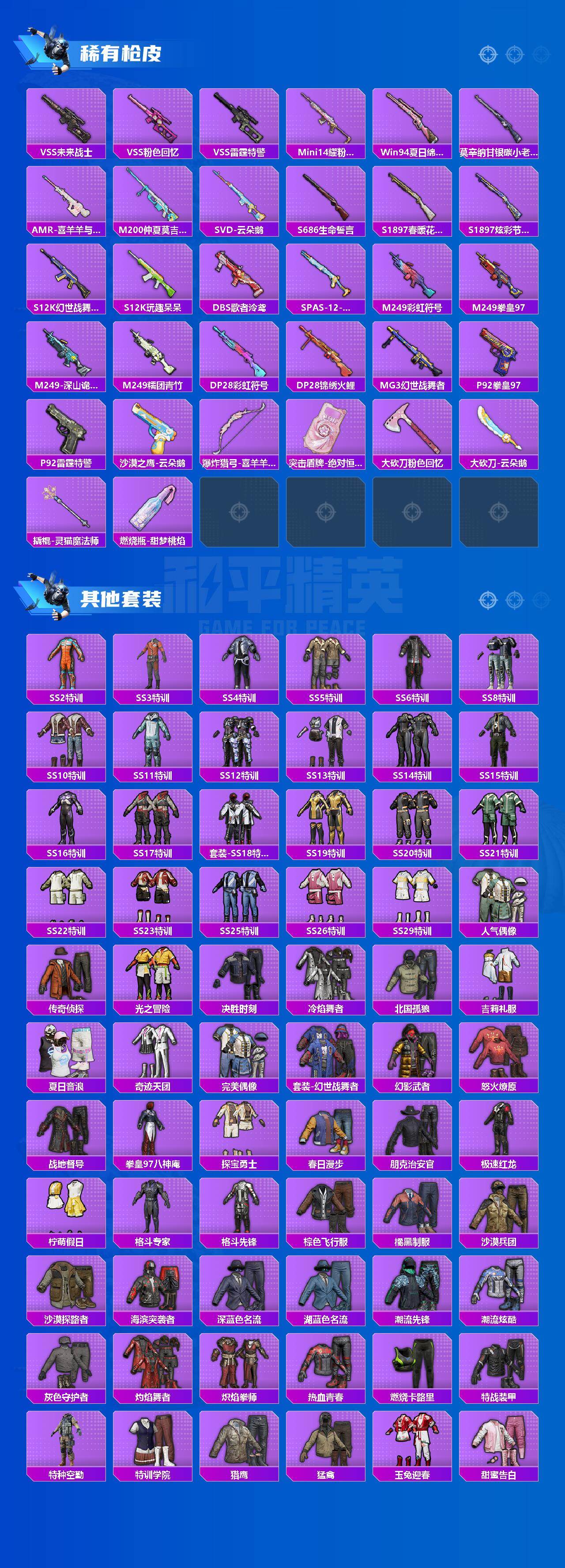 - [15242565]四川一区-66V-17王者-1炫金 【热门武器】:QBZ03-金色蔷薇,M200-幻神,死亡之眼,白虎-电玩蓝兔,M4A1-黑骑士,加特林-炼狱,沙鹰-修罗*2 【王者炫金武器】:王者之武,王者之魄,王者之光,炫金毁灭 【音效卡】:M4A1-雷神音效卡,Barrett-碧霄极光音效卡,炼狱-百战金芒-庆典舞曲音效卡 【皮肤】:M200-幻神-荣耀世冠白鲨,幻神-荣耀世冠白鲨2023 皮肤,金色蔷薇-纸灯龙皮肤,金色蔷薇-破浪逐光 皮肤,裁决-羽掣 皮肤,裁决-运输船 皮肤,雷神-化蛇 皮肤,M4A1-再燃火线,雷神-神秘按键 皮肤,火麒麟-冠军之心,火麒麟-平天大圣,火麒麟-百城,毁灭-暗月,毁灭-英雄计划 皮肤,黑骑士耀金皮肤,天启-暗月,战神-粉色甜心皮肤,战神-紫绶金章皮肤,战神-流金岁月皮肤,AWM-天龙-传奇白鲨,Barrett-金色蔷薇-蛇姬 皮肤,炼狱-星空,修罗-能量核心,屠龙-破浪逐光 皮肤*2,屠龙-惊鸿 皮肤,龙啸-纸灯龙皮肤*2,龙啸-蛇姬 皮肤,轻型军用手斧-再燃火线 【角色】:樱,魅影,关小雨,王者樱-热浪之夏,王者-葵-貂蝉,王者复仇,王者玲珑,王者玲珑-小乔,王者晴雅,初恋灵狐,娟娟,兰妹妹,零-水下丽影,灵狐者-X,灵狐者-七夕宝贝,龙儿-小淘气,曼陀罗-X,潘多拉-X,潘多拉-甜心教官,青霞仙子,蛇姬,铁骑荣耀,兔囡囡,新娜塔莎,雪莉杨,影武者-X,智影 【人偶武器】:AWM-灵狐-15周年嘉年华,COP-旗袍,迷你生化手雷*3,闪光弹-小乔,闪光弹-貂蝉,高爆手雷-大乔 【暴走生化】:死亡之眼,超级对讲机 【挑战大师】:冰龙粉碎者-白马银枪,激光毁灭者III-白马银枪 【英雄级武器】:AK47-火麒麟,M4A1-黑龙,M4A1-雷神*2,M4A1-黑骑士,AN94-超新星,AK47-机械迷城,M4A1-玫瑰精灵,QBZ03-金色蔷薇,王者之翼-觉醒版,王者之魄-觉醒版,王者之势-觉醒版,AK-47-猩红传说,黑骑士-海王,AK47-B-常胜将军,白虎-电玩蓝兔,AWM-天龙,Barrett-毁灭,AWM-裁决,M200-幻神,加特林-炼狱,炼狱-百战金芒,AA-12-雷霆,沙鹰-修罗*2,沙鹰-天神*2,雷霆之契,柯尔特-竞技荣光,屠龙*4,龙啸*3,麒麟刺-堕天神,擎天,幻灵之锋,斩神刀-雷暴,麒麟刺-百战金芒,王者之啸-觉