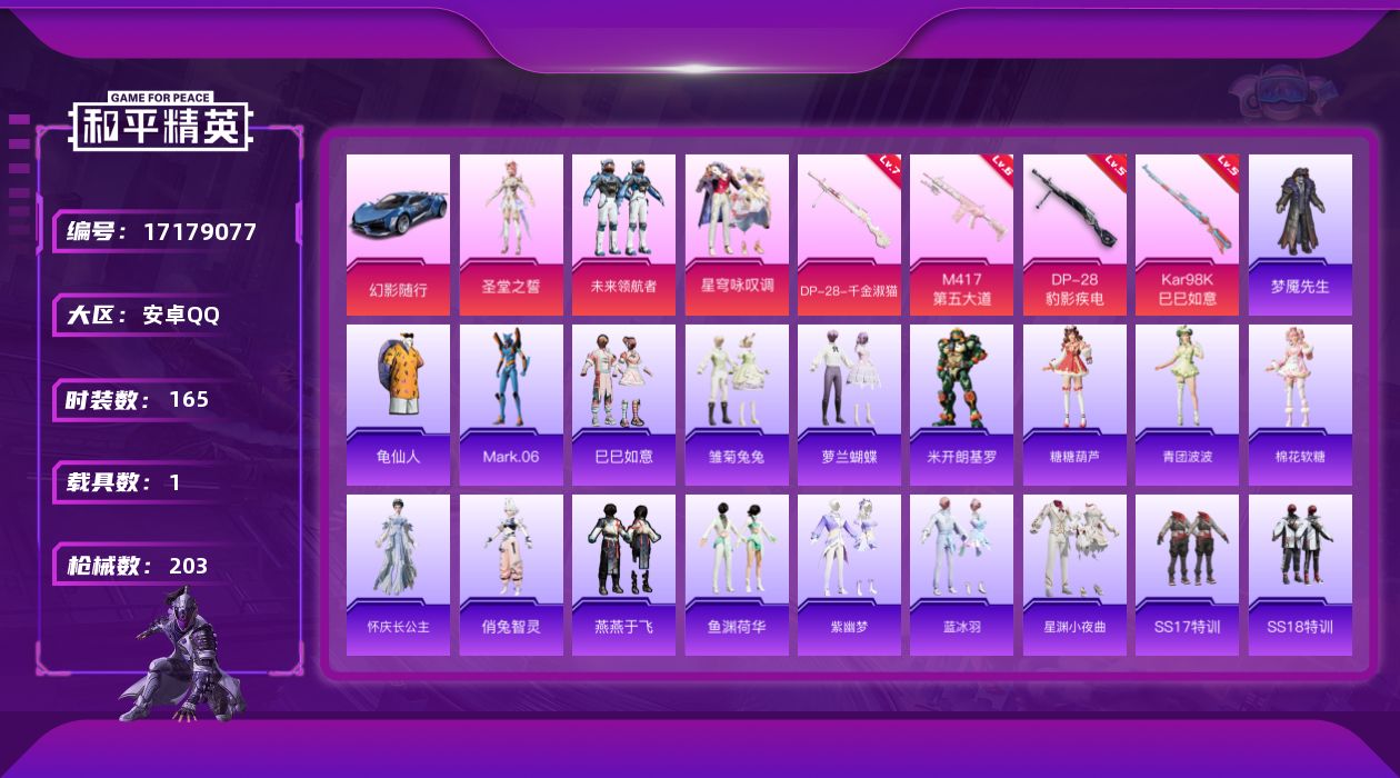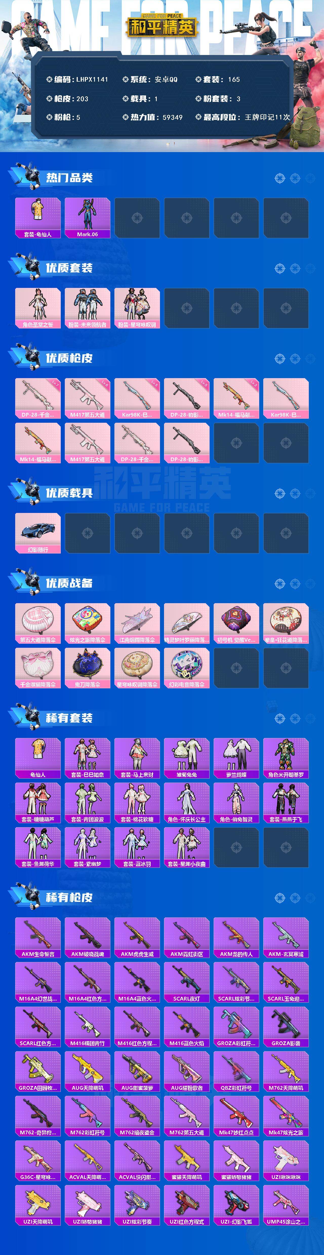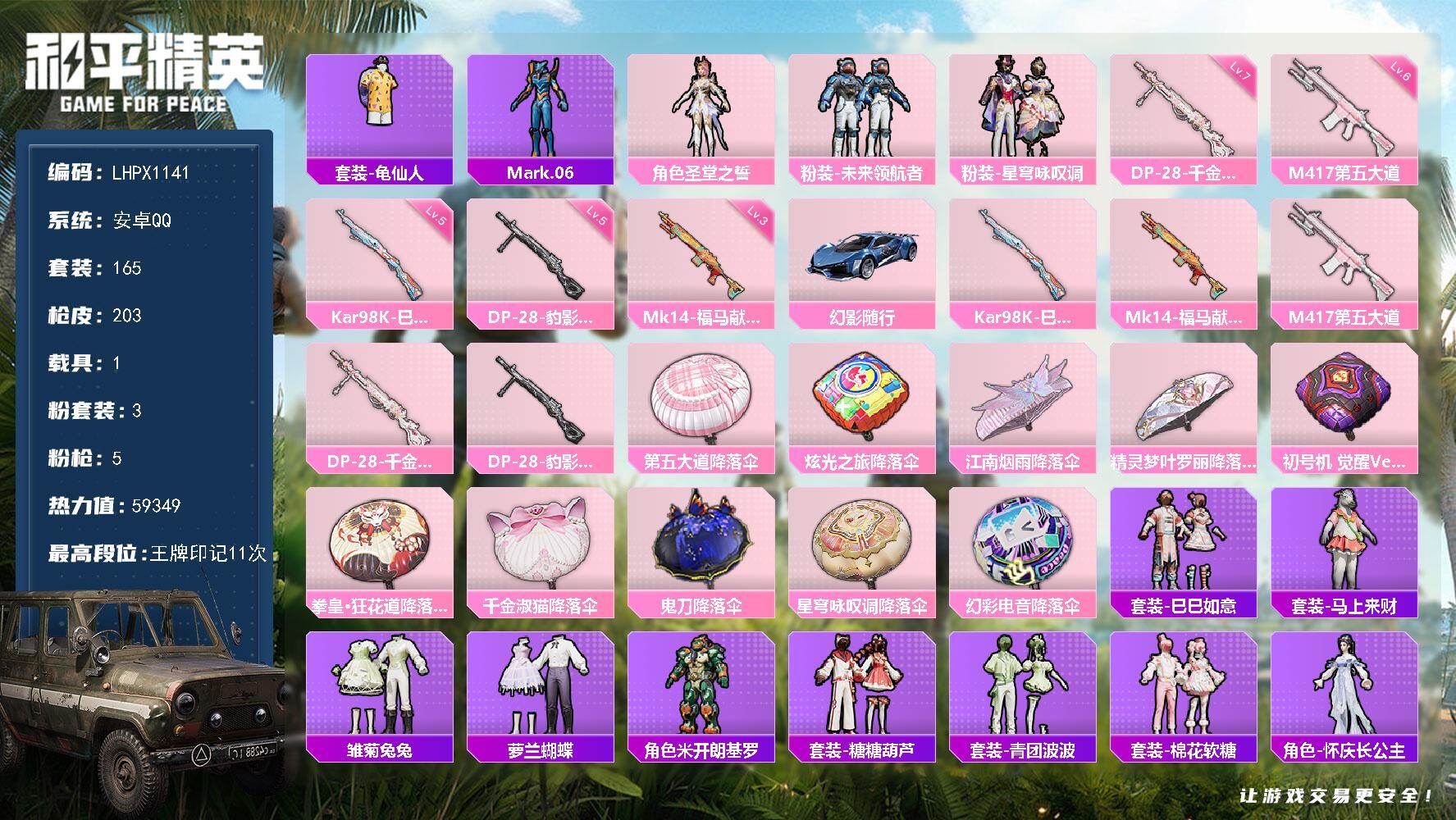 [17179077]【特价出售/店主推荐】安卓 手Q-3粉装-5特效枪-1载具-1粉色飞行器-59349热力值-11王牌印记-165套装-203枪皮【热门品类】:套装-龟仙人,角色-Mark.06【粉色套装】:角色-圣堂之誓,粉装-未来领航者,粉装-星穹咏叹调【粉色枪皮等级】:Kar98K-巳巳如意(五级),Mk14-福马献瑞(三级),M417-第五大道(六级),DP-28-千金淑猫(七级),DP-28-豹影疾电(五级)【粉色载具】:幻影随行【粉色枪皮】:Kar98K-巳巳如意,Mk14-福马献瑞,M417-第五大道,DP-28-千金淑猫,DP-28-豹影疾电