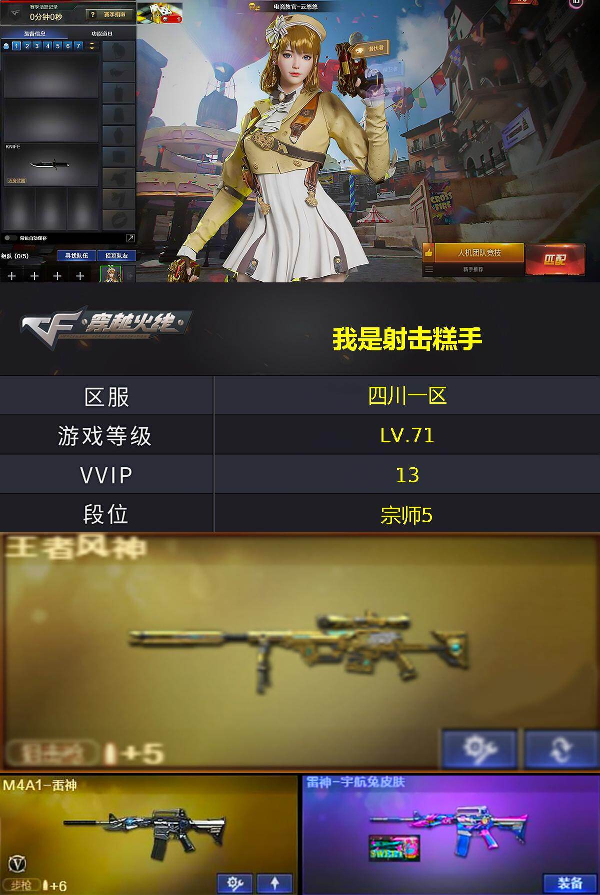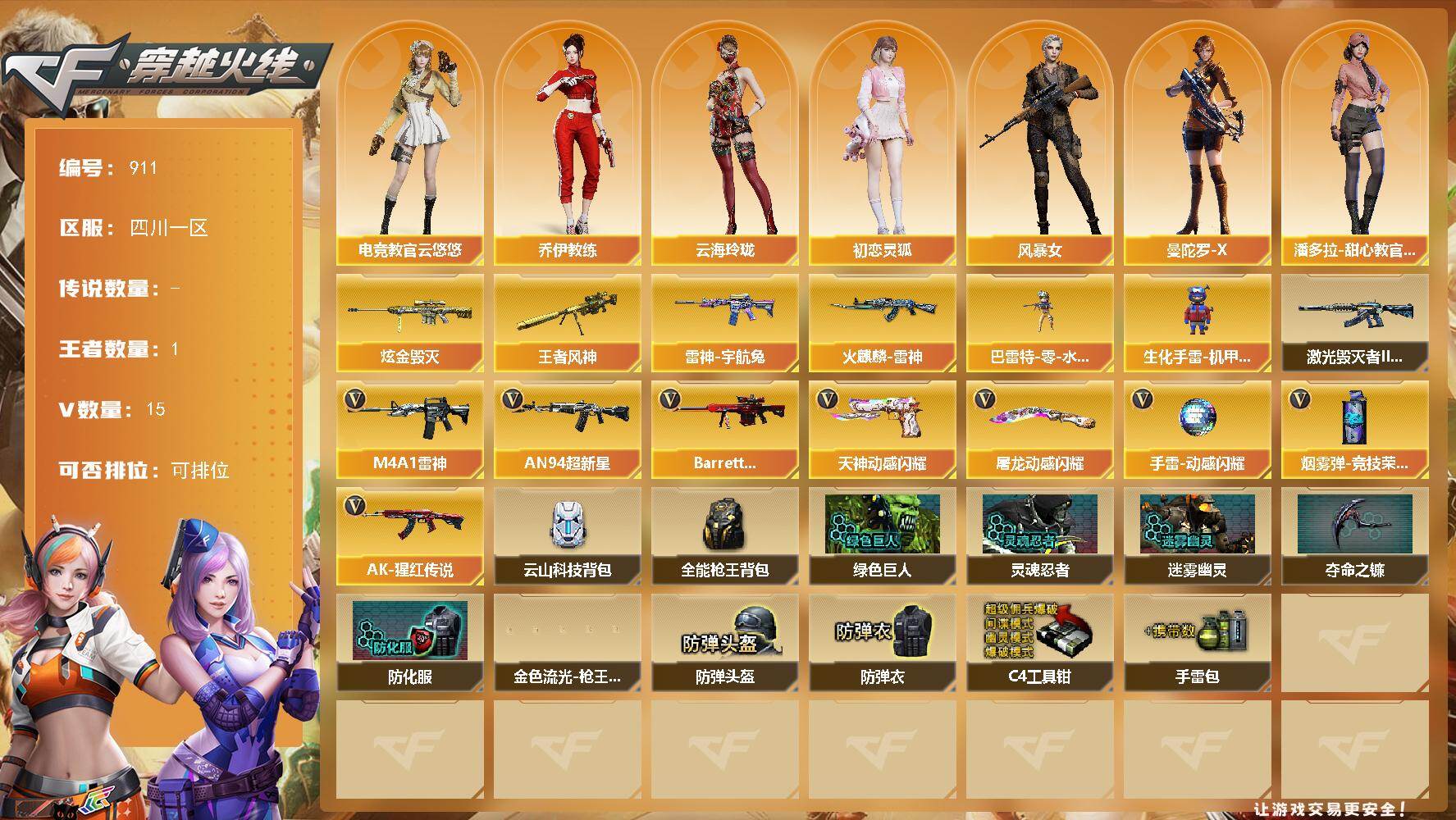 [17183337]四川一区-15V-1王者-1炫金 【王者炫金武器】:王者风神,炫金毁灭 【皮肤】:雷神-宇航兔皮肤,火麒麟-雷神 【角色】:电竞教官-云悠悠,乔伊教练,云海玲珑,初恋灵狐,风暴女,曼陀罗-X,潘多拉-甜心教官 【人偶武器】:巴雷特-零-水下丽影,生化手雷-机甲核心 【挑战大师】:激光毁灭者III-白马银枪 【英雄级武器】:M4A1-雷神,AN94-超新星,AK-47-猩红传说,Barrett-极光*2,天神-动感闪耀,屠龙-动感闪耀,手雷-动感闪耀,烟雾弹-竞技荣光 【道具】:云山科技背包,全能枪王背包,绿色巨人,灵魂忍者,迷雾幽灵,夺命之镰,防化服*3,金色流光-枪王排位*2,星辰流光-枪王排位,防弹头盔*7,防弹衣*7,C4工具钳*7,手雷包*7 【特殊枪械】: