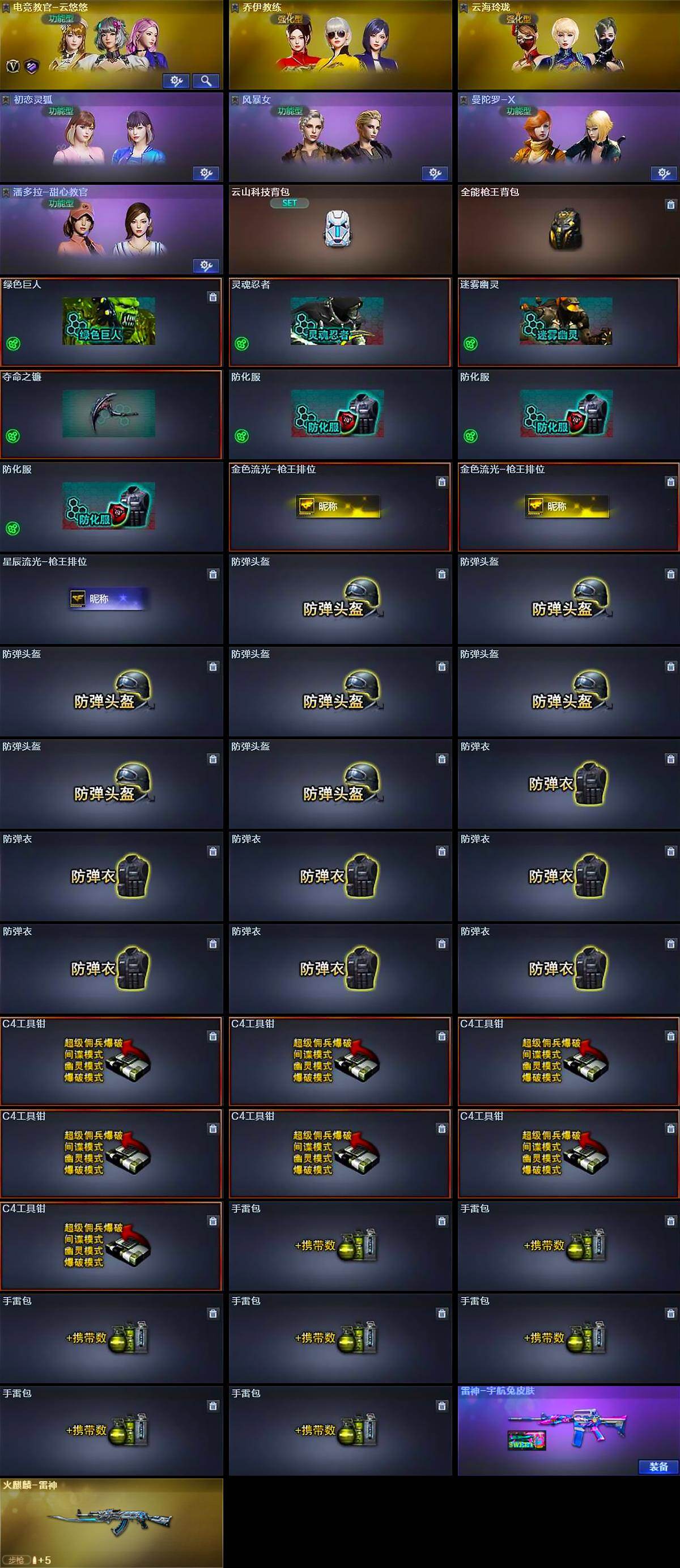 【道具】:云山科技背包,全能枪王背包,绿色巨人,灵魂忍者,迷雾幽灵,夺命之镰,防化服*3,金色流光-枪王排位*2,星辰流光-枪王排位,防弹头盔*7,防弹衣*7,C4工具钳*7,手雷包*7