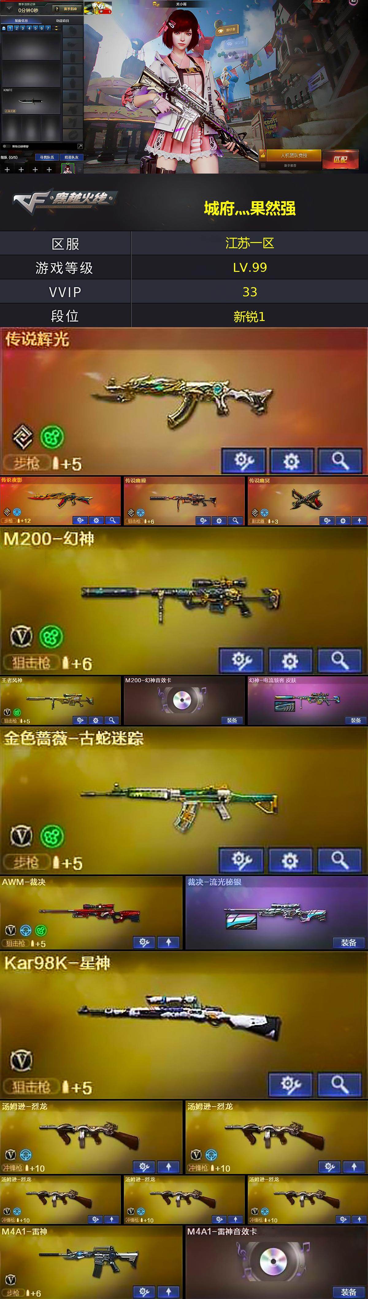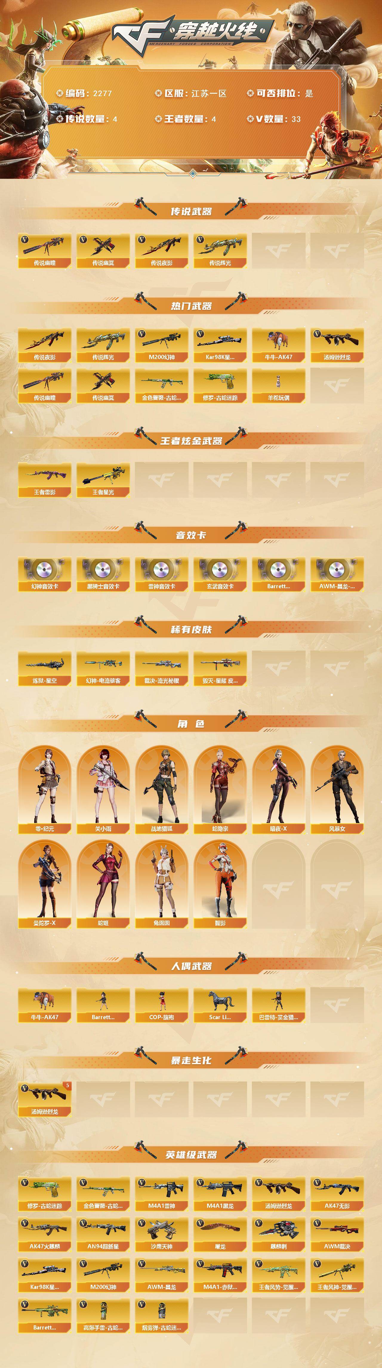 - [12208147]【商品标题】:江苏一区-23V-2王者-2炫金 【热门武器】:QBZ03-金色蔷薇,M14EBR-玄武,M4A1-青龙,M200-幻神,白虎-电玩蓝兔,加特林-炼狱,羊驼玩偶 【王者炫金武器】:炫金修罗*2 【音效卡】:烈火-动感闪耀 音效卡 【稀有皮肤】:M4A1-战神赵云,毁灭-暗月 【角色】:雨棠 【人偶武器】:天龙-曼陀罗,AWM-灵狐-15周年嘉年华,M4A1-雷神-精英刀锋,迷你超能女侍,迷你牛牛,灵狐娃娃手雷*3 【挑战大师】:神圣爆裂者-末日III,激光毁灭者III-白马银枪 【英雄级武器】:烈火-动感闪耀,天神-动感闪耀,屠龙-动感闪耀,手雷-动感闪耀,QBZ03-金色蔷薇,M14EBR-玄武,M4A1-青龙,白虎-电玩蓝兔,无影-神兵利器,M4A1-雷神,加特林-炼狱,AK47-火麒麟,Barrett-毁灭,M200-幻神,AK-47-猩红传说,AK47-B-战神,沙鹰-天神,麒麟刺 【特殊枪械】:0白虎,0黑骑士,0烈龙,0盘龙,1炼狱,0蝴蝶斯泰尔