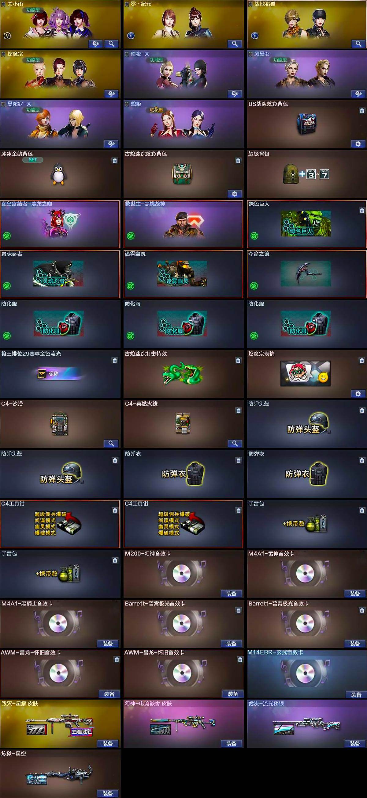 【道具】:BS战队炫彩背包,冰冰企鹅背包,古蛇迷踪炫彩背包,超级背包,女皇终结者-魔龙之吻,救世主-黑桃战神,绿色巨人,灵魂忍者,迷雾幽灵,夺命之镰,防化服*3,枪王排位29赛季金色流光,古蛇迷踪打击特效,蛇隐宗表情,C4-沙漠,C4-再燃火线,防弹头盔*2,防弹衣*2,C4工具钳*2,手雷包*2