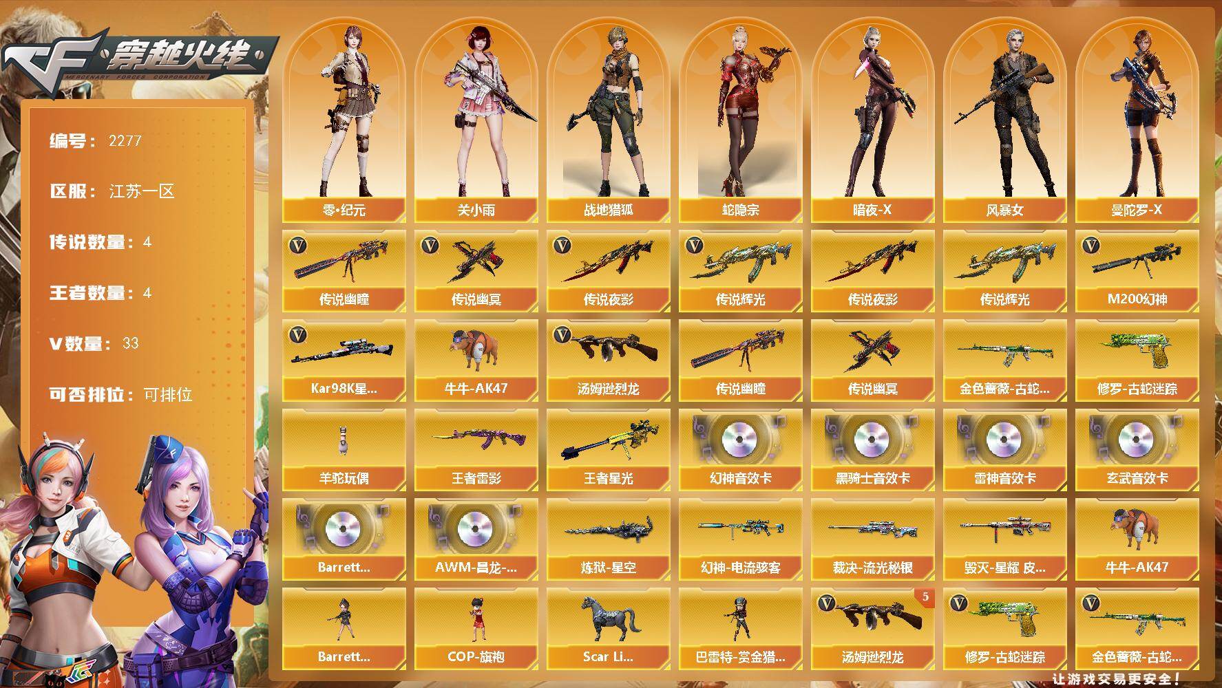[17094316]江苏一区-32V-4王者武器数-0炫金武器数 【传说武器】:传说辉光,传说夜影,传说幽瞳,传说幽冥 【热门武器】:传说夜影,传说辉光,传说幽瞳,传说幽冥,M200-幻神,金色蔷薇-古蛇迷踪,修罗-古蛇迷踪,Kar98K-星神,牛牛-AK47,汤姆逊-烈龙*5,羊驼玩偶 【王者炫金武器】:王者雷影,王者星光 【音效卡】:M200-幻神音效卡,M4A1-雷神音效卡,M4A1-黑骑士音效卡,M14EBR-玄武音效卡,Barrett-碧霄极光音效卡*2,AWM-昌龙-怀旧音效卡*2 【皮肤】:幻神-电流骇客 皮肤,裁决-流光秘银,毁灭-星耀 皮肤,炼狱-星空 【角色】:关小雨,零·纪元,战地猎狐,蛇隐宗,暗夜-X,风暴女,曼陀罗-X,蛇姬,兔囡囡,智影 【人偶武器】:Scar Light-马枪,COP-旗袍,牛牛-AK47,巴雷特-赏金猎人,Barrett-夜玫瑰 【英雄级武器】:AK47-火麒麟,M4A1-黑龙,M4A1-雷神,AK47-无影,AN94-超新星,金色蔷薇-古蛇迷踪,王者风势-觉醒版,AWM-裁决,M200-幻神,Kar98K-星神,王者风神-觉醒版,汤姆逊-烈龙*5,沙鹰-天神*2,修罗-古蛇迷踪,屠龙*2,麒麟刺*2,高爆手雷-古蛇迷踪,烟雾弹-古蛇迷踪,M4A1-赤狱骑士,AWM-昌龙,Barrett-碧霄极光*2 【道具】:BS战队炫彩背包,冰冰企鹅背包,古蛇迷踪炫彩背包,超级背包,女皇终结者-魔龙之吻,救世主-黑桃战神,绿色巨人,灵魂忍者,迷雾幽灵,夺命之镰,防化服*3,枪王排位29赛季金色流光,古蛇迷踪打击特效,蛇隐宗表情,C4-沙漠,C4-再燃火线,防弹头盔*2,防弹衣*2,C4工具钳*2,手雷包*2 【特殊枪械】:5烈龙