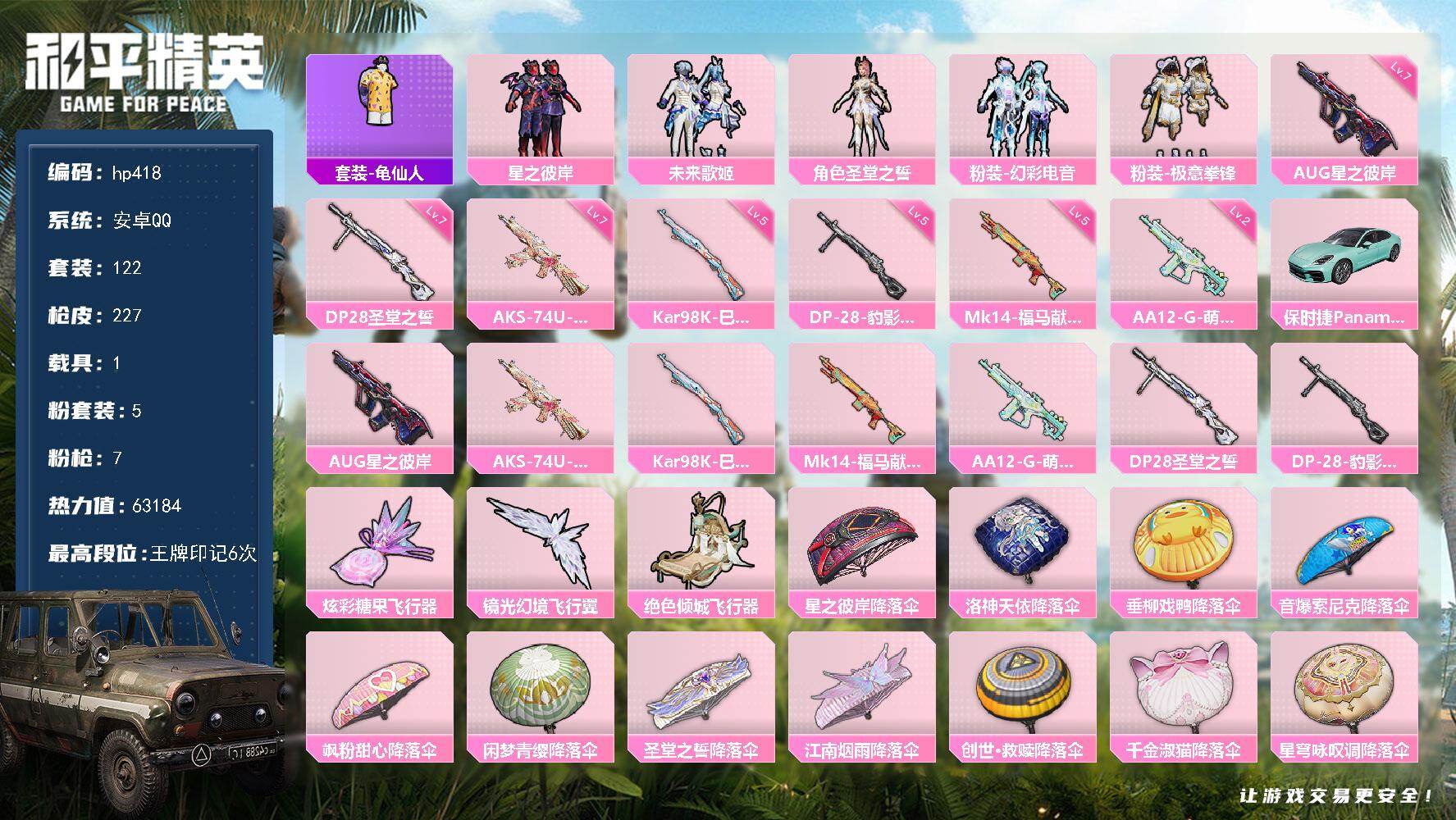 [17140086]安卓 手Q-5粉装-7特效枪-1载具-3粉色飞行器-63184热力值-6王牌印记-122套装-227枪皮