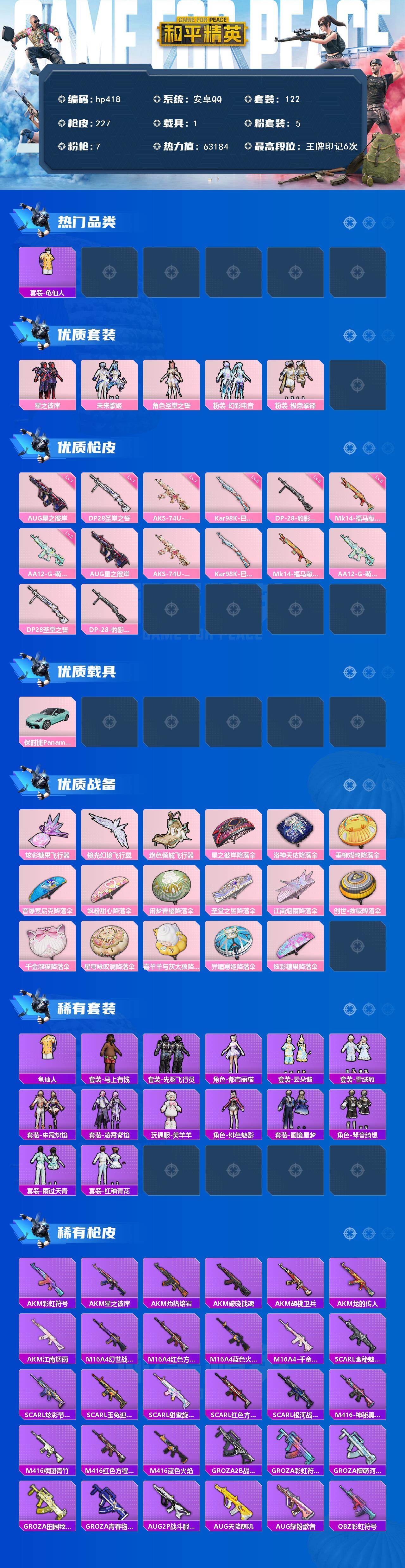 [17140086]安卓 手Q-5粉装-7特效枪-1载具-3粉色飞行器-63184热力值-6王牌印记-122套装-227枪皮 【热门品类】:套装-龟仙人 【粉色套装】:粉装-星之彼岸,粉装-未来歌姬,角色-圣堂之誓,粉装-幻彩电音,粉装-极意拳锋 【粉色枪皮等级】:AUG-星之彼岸(七级),AKS-74U-星穹咏叹调(七级),Kar98K-巳巳如意(五级),Mk14-福马献瑞(五级),AA12-G-萌骑幻想(二级),DP-28-圣堂之誓(七级),DP-28-豹影疾电(五级) 【粉色载具】:保时捷Panamera(梦幻青) 【粉色枪皮】:AUG-星之彼岸,AKS-74U-星穹咏叹调,Kar98K-巳巳如意,Mk14-福马献瑞,AA12-G-萌骑幻想,DP-28-圣堂之誓,DP-28-豹影疾电 【粉色飞行器】:炫彩糖果飞行器,镜光幻境飞行翼,绝色倾城飞行器 【粉色降落伞】:星之彼岸降落伞,洛神天依降落伞,垂柳戏鸭降落伞,音爆索尼克降落伞,飒粉甜心降落伞,闲梦青缨降落伞,圣堂之誓降落伞,江南烟雨降落伞,创世·救赎降落伞,千金淑猫降落伞,星穹咏叹调降落伞,喜羊羊与灰太狼降落伞,异瞳寒姬降落伞,炫彩糖果降落伞 【稀有套装】:套装-龟仙人,套装-炫彩糖果,套装-马上有钱,套装-先驱飞行员,角色-都市丽猫,套装-云朵鹅,套装-雪绒豹,套装-朱霞炽焰,套装-凌霄紫焰,玩偶服-美羊羊,角色-绯色魅影,套装-画境星梦,套装-琴音绮想,套装-雨过天青,套装-红釉青花 【稀有枪皮】:AUG-冰晶雪宝,AKM-彩虹符号,AKM-星之彼岸,AKM-江南烟雨,AKM-灼热熔岩,AKM-破晓战魂,AKM-胡桃卫兵,AKM-龙的传人,M16A4-幻世战舞者,M16A4-红色方程式,M16A4-蓝色火焰,M16A4-千金淑猫,SCAR-L-幽秘魅影,SCAR-L-炫彩节奏,SCAR-L-玉兔迎春,SCAR-L-甜蜜旋律,SCAR-L-红色方程式,SCAR-L-银河战甲,M416-神秘黑猫,M416-糯团青竹,M416-红色方程式,M416-蓝色火焰,GROZA-2B战斗服款,GROZA-彩虹符号,GROZA-懵萌河马,GROZA-田园牧歌,GROZA-青春物语,AUG-2P战斗服款,AUG-天降萌叽,AUG-耀粉歌者,QBZ-彩虹符号,QBZ-银碳小老虎,M762-天降萌叽,M762-奇异狩猎者,M762-彩虹符号,M