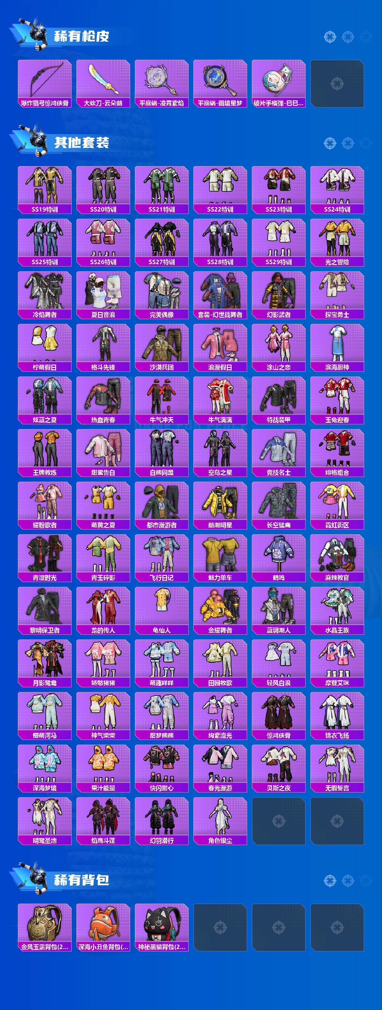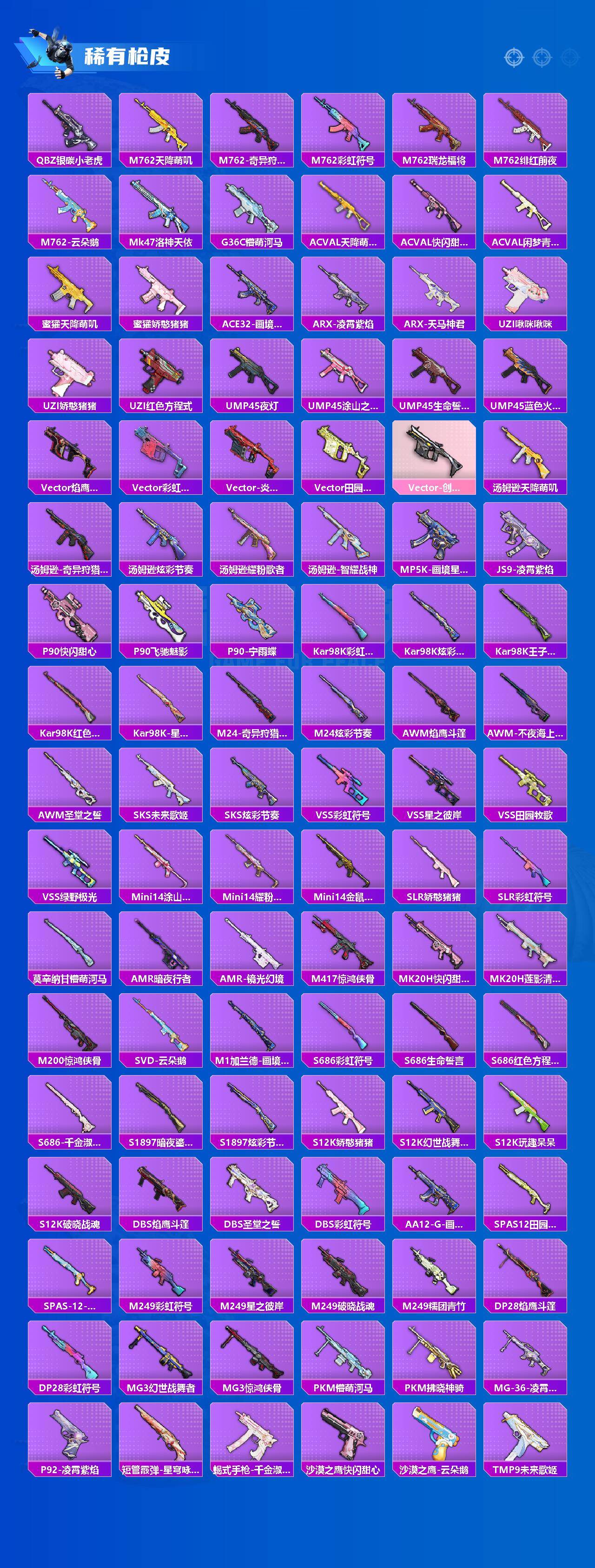 【稀有枪皮】:AUG-冰晶雪宝,AKM-彩虹符号,AKM-星之彼岸,AKM-江南烟雨,AKM-灼热熔岩,AKM-破晓战魂,AKM-胡桃卫兵,AKM-龙的传人,M16A4-幻世战舞者,M16A4-红色方程式,M16A4-蓝色火焰,M16A4-千金淑猫,SCAR-L-幽秘魅影,SCAR-L-炫彩节奏,SCAR-L-玉兔迎春,SCAR-L-甜蜜旋律,SCAR-L-红色方程式,SCAR-L-银河战甲,M416-神秘黑猫,M416-糯团青竹,M416-红色方程式,M416-蓝色火焰,GROZA-2B战斗服款,GROZA-彩虹符号,GROZA-懵萌河马,GROZA-田园牧歌,GROZA-青春物语,AUG-2P战斗服款,AUG-天降萌叽,AUG-耀粉歌者,QBZ-彩虹符号,QBZ-银碳小老虎,M762-天降萌叽,M762-奇异狩猎者,M762-彩虹符号,M