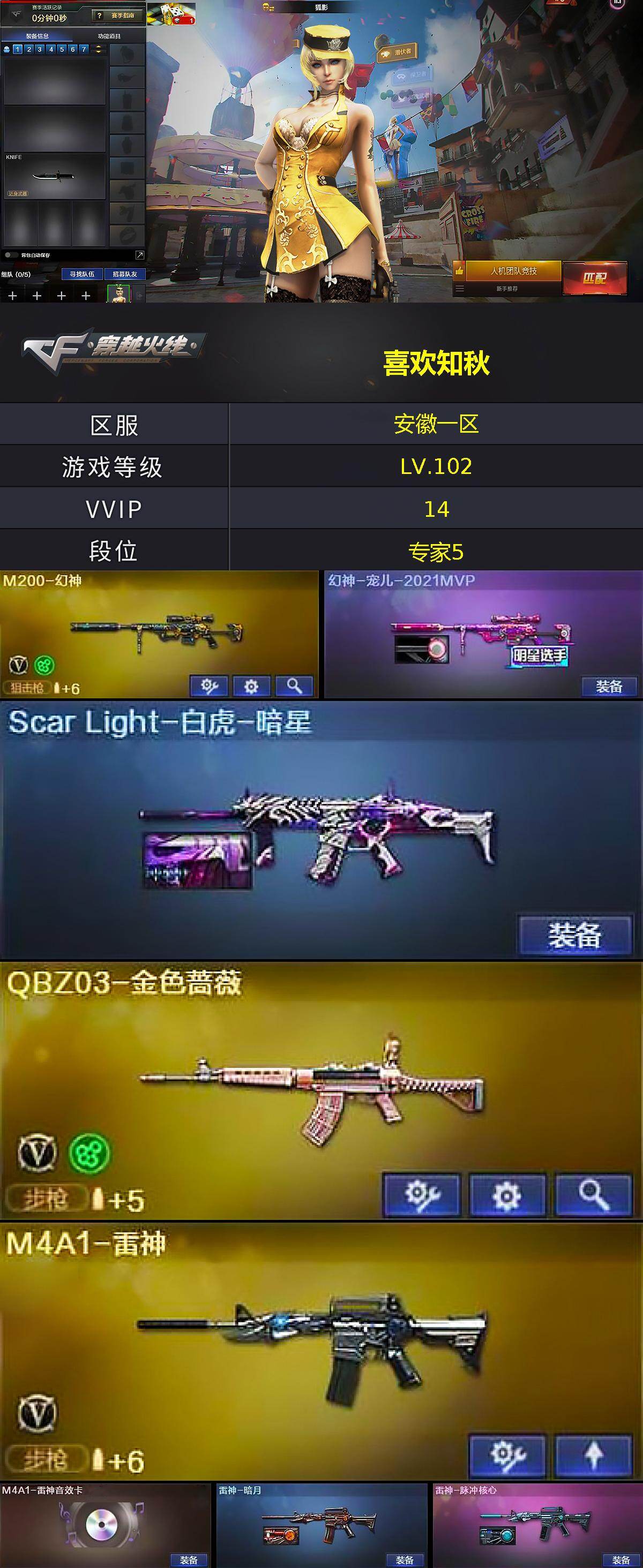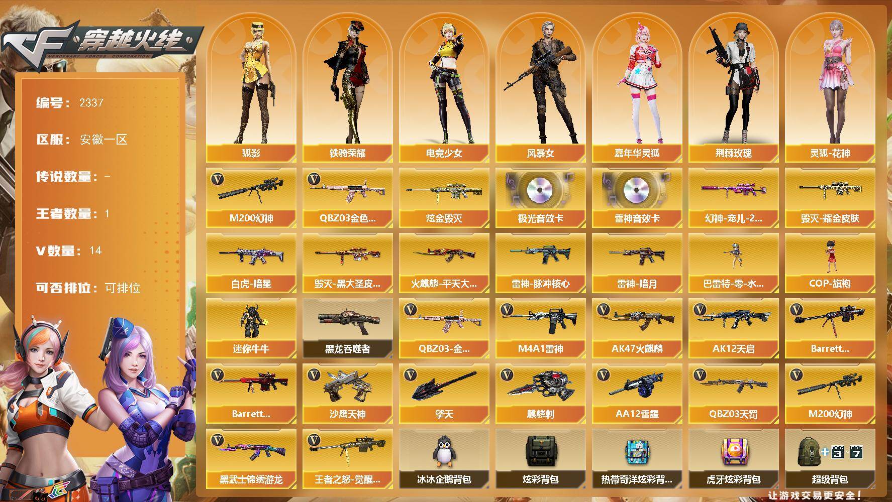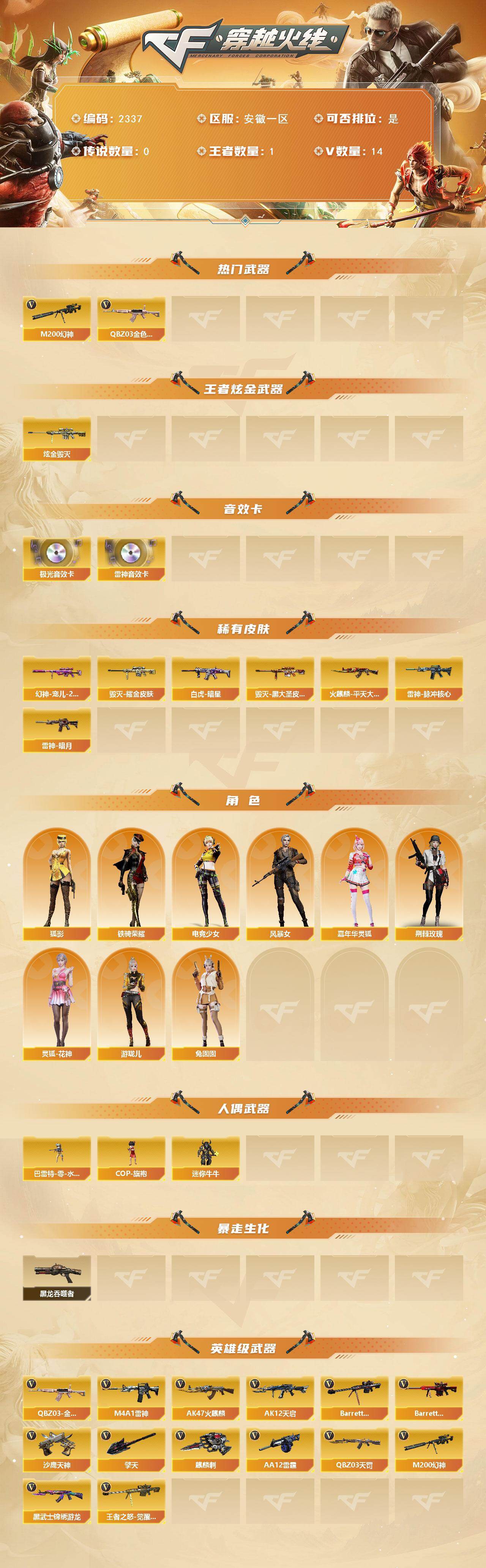 [17157906]安徽一区-16V-1王者武器数-1炫金武器数 【热门武器】:QBZ03-金色蔷薇,M200-幻神 【王者炫金武器】:炫金毁灭 【音效卡】:M4A1-雷神音效卡,Barrett-极光音效卡 【皮肤】:幻神-宠儿-2021MVP,Scar Light-白虎-暗星,雷神-暗月,雷神-脉冲核心,火麒麟-平天大圣,毁灭耀金皮肤,毁灭-黑大圣皮肤*2 【角色】:狐影,电竞少女,风暴女,嘉年华灵狐,荆棘玫瑰,灵狐-花神,铁骑荣耀,兔囡囡,游珑儿 【人偶武器】:巴雷特-零-水下丽影,COP-旗袍,迷你牛牛 【暴走生化】:黑龙吞噬者 【英雄级武器】:AK47-火麒麟,M4A1-雷神,AK12-天启,QBZ03-天罚,黑武士-锦绣游龙,QBZ03-金色蔷薇,Barrett-毁灭,Barrett-极光,M200-幻神,王者之怒-觉醒版,AA-12-雷霆,沙鹰-天神*2,擎天,麒麟刺 【道具】:冰冰企鹅背包,炫彩背包,热带奇洋炫彩背包,虎牙炫彩背包,超级背包,变异宝贝,迷雾幽灵,生化弹匣,夺命之镰,防化服,金色流光-枪王排位*2,星辰流光-枪王排位,枪王排位28赛季金色流光,防弹头盔*2,防弹衣*2,C4工具钳*2,手雷包*2 【特殊枪械】: