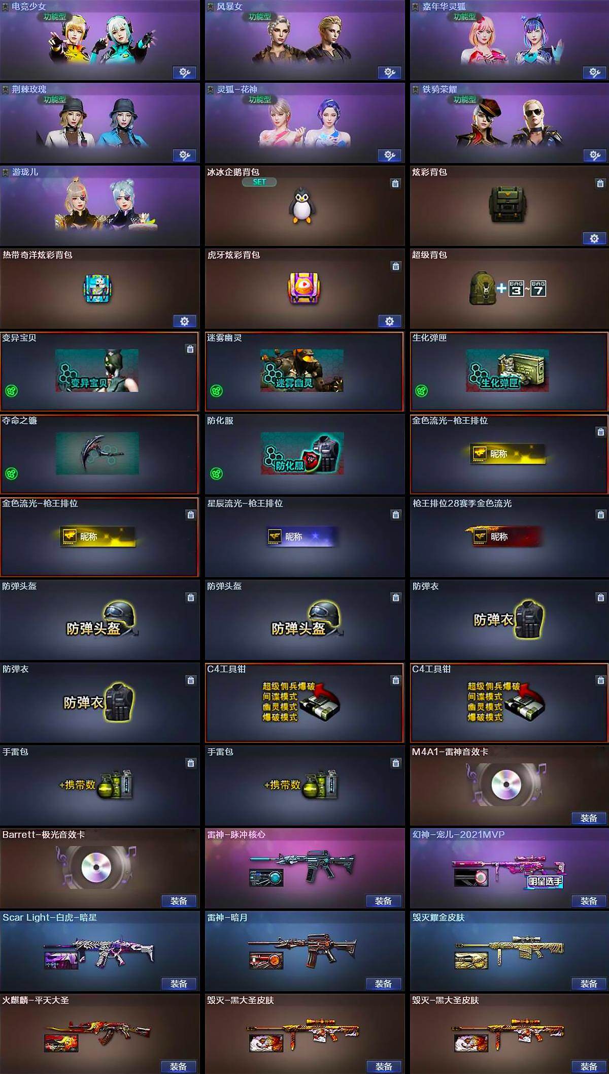 【道具】:冰冰企鹅背包,炫彩背包,热带奇洋炫彩背包,虎牙炫彩背包,超级背包,变异宝贝,迷雾幽灵,生化弹匣,夺命之镰,防化服,金色流光-枪王排位*2,星辰流光-枪王排位,枪王排位28赛季金色流光,防弹头盔*2,防弹衣*2,C4工具钳*2,手雷包*2