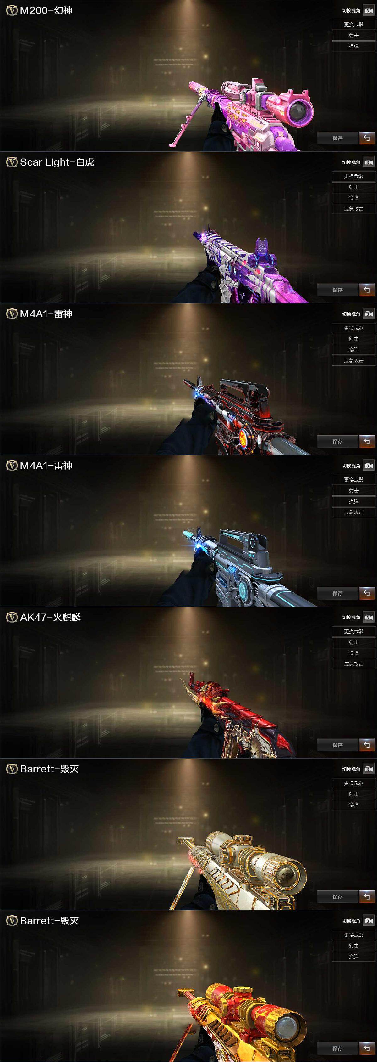 【英雄级武器】:AK47-火麒麟,M4A1-雷神,AK12-天启,QBZ03-天罚,黑武士-锦绣游龙,QBZ03-金色蔷薇,Barrett-毁灭,Barrett-极光,M200-幻神,王者之怒-觉醒版,AA-12-雷霆,沙鹰-天神*2,擎天,麒麟刺
