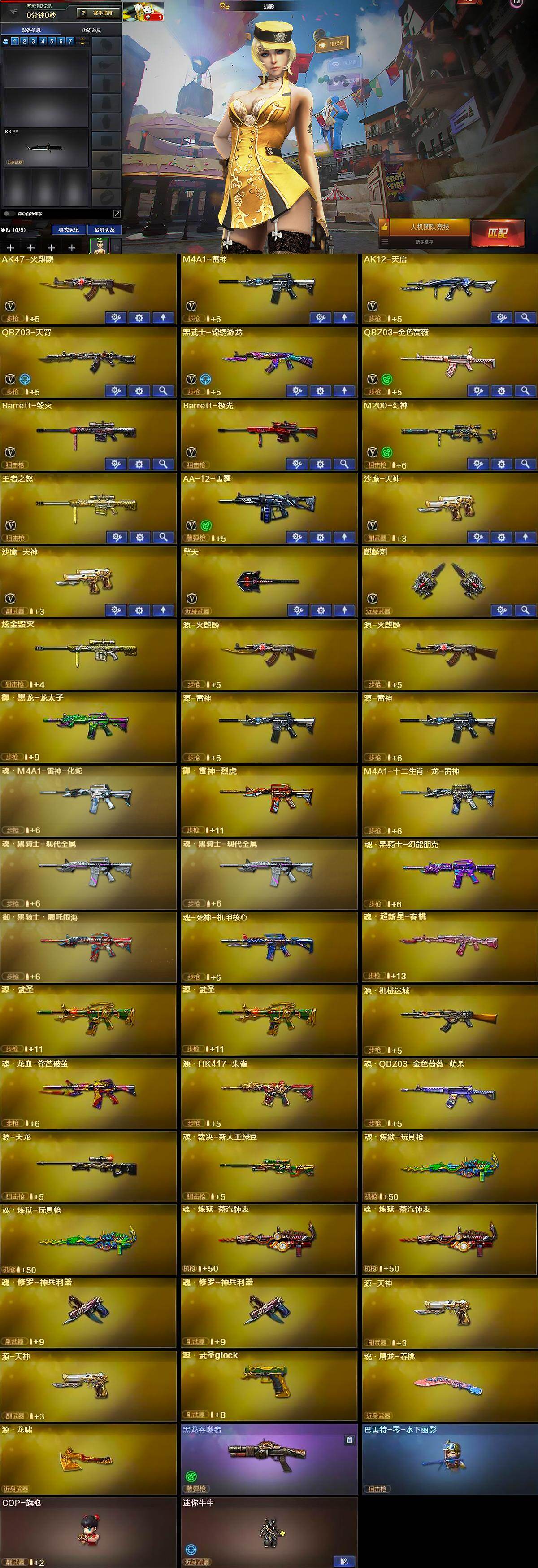 - [13101130]【428】66V/100级/元帅/6王者/2炫金/2英雄/QBZ03-金色蔷薇/死亡之眼/M4A1-黑骑士/汤姆逊-烈龙/RPK-盘龙/加特林-炼狱/沙鹰-修罗/炫金黑骑士/炫金天龙/AK47-火麒麟音效卡/M4A1-黑骑士音效卡/Barrett-毁灭音效卡/绝迹语音包/炼狱-百战金芒-庆典舞曲音效卡/烈龙-星空/M4A1-再燃火线/毁灭-荣耀之怒/毁灭耀金皮肤/毁灭-星空/M4A1-千变-孔明皮肤/黑龙-暗月/黑骑士-暗月/战神-粉色甜心皮肤/战神-紫绶金章皮肤/战神-流金岁月皮肤/AK47-B-常胜将军-曹操/AK47-B-常胜将军-孙权/天龙-能量核心/AWM-天龙-传奇70KG/修罗-冠军之魂/轻型军用手斧-再燃火线/炫/暗夜-X/嘉年华灵狐/娟娟/兰-海滩派对/潘多拉-X/蜀雪/职业选手/雅典娜/火麒麟-灵狐/M37-葵/灵狐娃娃手雷/闪光弹-小乔/闪光弹-貂蝉/高爆手雷-大乔/AK47-冰龙粉碎者/激光毁灭者/M4A1-千变/AK47-火麒麟/M4A1-黑龙/M4A1-雷神/AK47-黑武士/AK47-黑鲨/M4A1-龙血/M4A1-雷霆/王者之武-觉醒版/AK-47-猩红传说/AK47-B-战神/AK47-B-常胜将军/AWM-天龙/Barrett-毁灭/AWM-裁决/炼狱-百战金芒/AA-12-雷霆/沙鹰-天神/屠龙/擎天/麒麟刺-百战金芒/王者之啸-觉醒版/王者之击-觉醒版/高爆手雷-雷霆/闪光弹-雷霆/烟雾弹-雷霆/M4A1-赤狱骑士