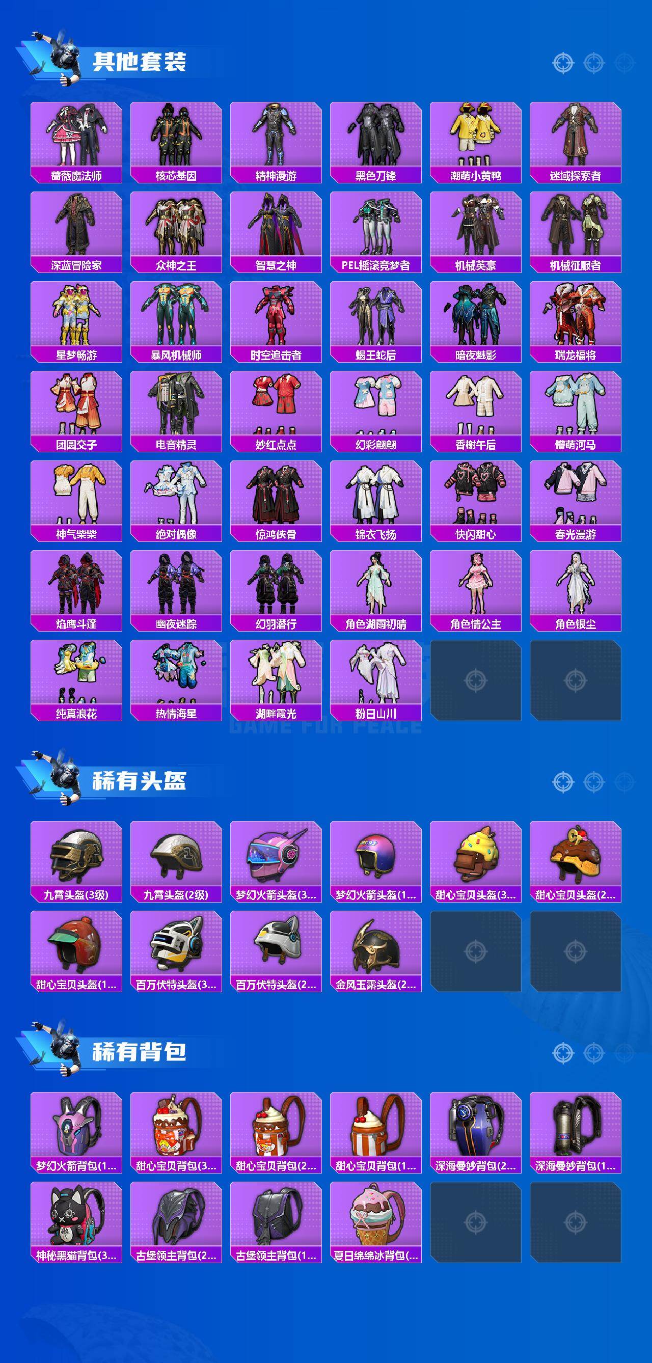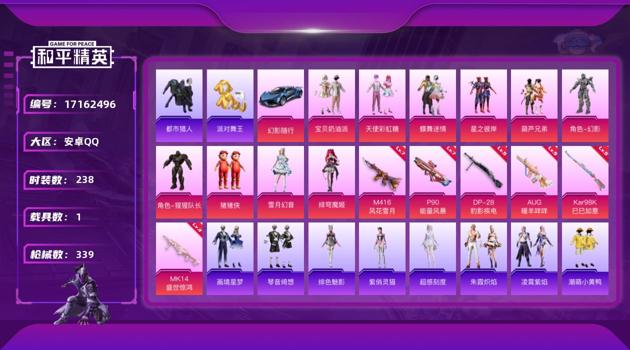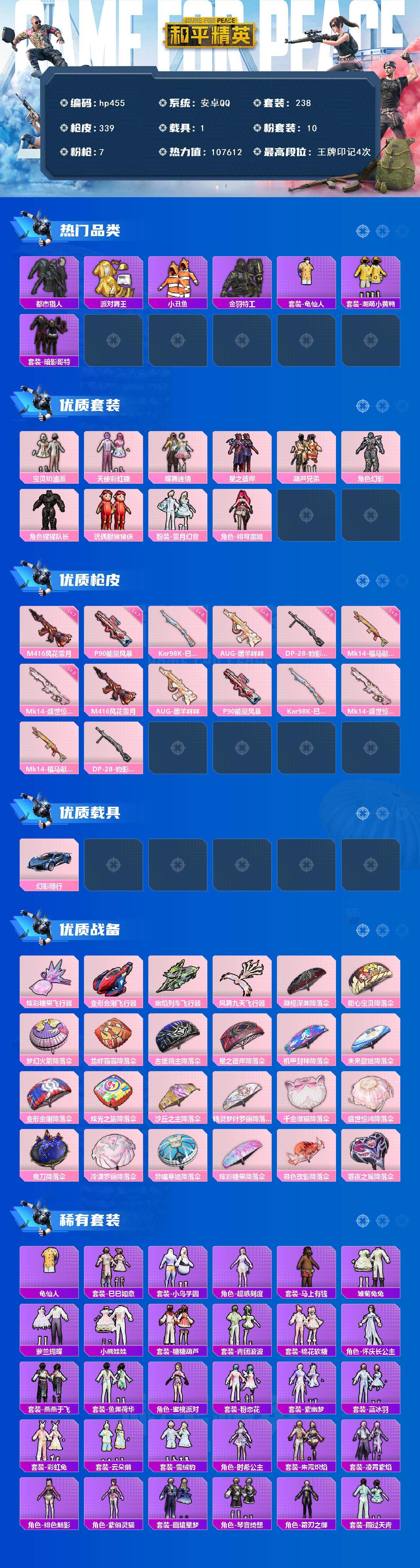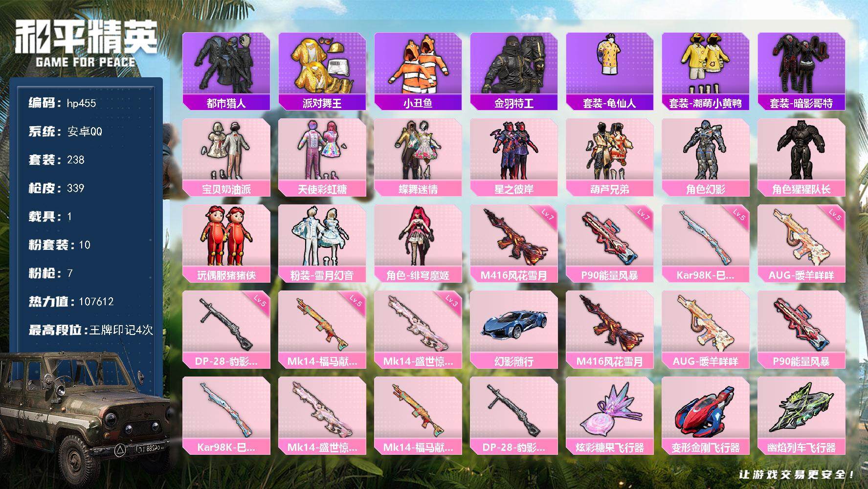 [17162496]安卓 手Q-10粉装-7特效枪-1载具-4粉色飞行器-107612热力值-4王牌印记-238套装-339枪皮 【热门品类】:套装-都市猎人,套装-派对舞王,套装-小丑鱼,套装-金羽特工,套装-龟仙人,套装-潮萌小黄鸭,套装-暗影哥特 【粉色套装】:粉装-宝贝奶油派,粉装-天使彩虹糖,粉装-蝶舞迷情,粉装-星之彼岸,粉装-葫芦兄弟,角色-幻影,角色-猩猩队长,玩偶服-猪猪侠,粉装-雪月幻音,角色-绯穹魔姬 【粉色枪皮等级】:M416-风花雪月(七级),AUG-暖羊咩咩(五级),P90-能量风暴(七级),Kar98K-巳巳如意(五级),Mk14-盛世惊鸿(三级),Mk14-福马献瑞(五级),DP-28-豹影疾电(五级) 【粉色载具】:幻影随行 【粉色枪皮】:M416-风花雪月,AUG-暖羊咩咩,P90-能量风暴,Kar98K-巳巳如意,Mk14-盛世惊鸿,Mk14-福马献瑞,DP-28-豹影疾电 【粉色飞行器】:炫彩糖果飞行器,变形金刚飞行器,幽焰列车飞行器,凤舞九天飞行器 【粉色降落伞】:凝视深渊降落伞,甜心宝贝降落伞,梦幻火箭降落伞,龙虾霸霸降落伞,古堡领主降落伞,星之彼岸降落伞,机甲封神降落伞,未来歌姬降落伞,变形金刚降落伞,炫光之旅降落伞,沙丘之主降落伞,精灵梦叶罗丽降落伞,千金淑猫降落伞,盛世惊鸿降落伞,鬼刀降落伞,冷漠罗丽降落伞,异瞳寒姬降落伞,炫彩糖果降落伞,暮色玫影降落伞,罪夜之冕降落伞 【稀有套装】:套装-龟仙人,套装-巳巳如意,套装-小鸟芋圆,角色-超感刻度,套装-雪国风尚,套装-炫彩糖果,套装-马上有钱,套装-雏菊兔兔,套装-萝兰蝴蝶,套装-小熊娃娃,套装-糖糖葫芦,套装-青团波波,套装-棉花软糖,角色-怀庆长公主,套装-燕燕于飞,套装-鱼渊荷华,角色-蜜桃派对,套装-粉恋花,套装-紫幽梦,套装-蓝冰羽,套装-彩虹兔,套装-云朵鹅,套装-雪绒豹,角色-时希公主,套装-朱霞炽焰,套装-凌霄紫焰,角色-绯色魅影,角色-紫俏灵猫,套装-画境星梦,套装-琴音绮想,角色-霜刃之御,套装-雨过天青,套装-红釉青花 【稀有枪皮】:AUG-冰晶雪宝,AKM-冰凉西瓜,AKM-天启纪元,AKM-影袭,AKM-星之信仰,AKM-星之彼岸,AKM-玉龙,AKM-破晓战魂,AKM-龙的传人,AKM-玄冥寒域,M16A4-凝视深渊,M16A4-机械英豪,M16A4-生命誓