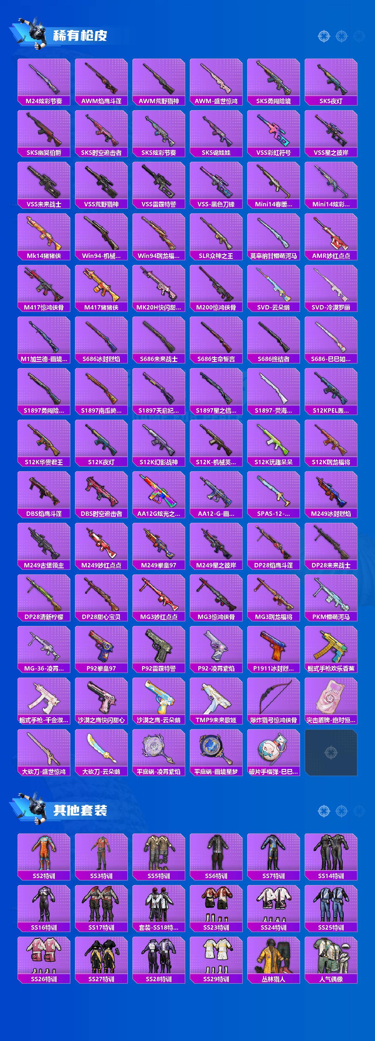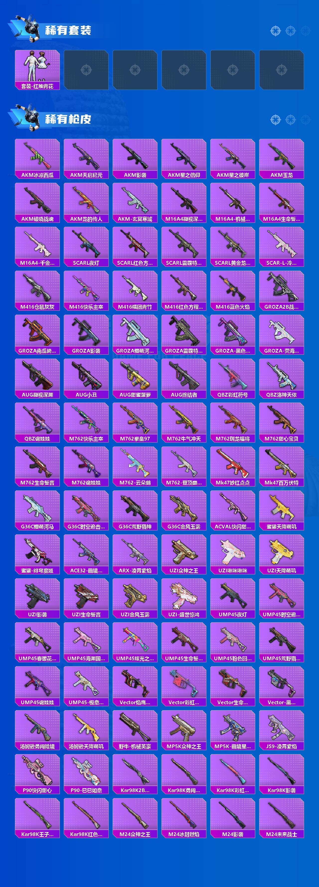 【稀有枪皮】:AUG-冰晶雪宝,AKM-冰凉西瓜,AKM-天启纪元,AKM-影袭,AKM-星之信仰,AKM-星之彼岸,AKM-玉龙,AKM-破晓战魂,AKM-龙的传人,AKM-玄冥寒域,M16A4-凝视深渊,M16A4-机械英豪,M16A4-生命誓