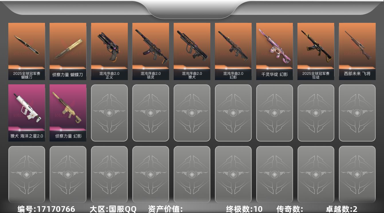 [17170766]【套装】:2025全球冠军赛套装,混沌序曲//2.0套装 【英雄】:炼狱,暮蝶,捷风,不死鸟,贤者,猎枭,零,芮娜,奇乐,尚勃勒,霓虹,K/O,钢锁 【近战武器】:近战武器-2025全球冠军赛 蝴蝶刀,近战武器-混沌链枷,近战武器-侦察力量 蝴蝶刀 【狂徒】:狂徒-2025全球冠军赛 【幻影】:幻影-千灵华绽,幻影-混沌序曲//2.0,幻影-侦察力量 【獠犬】:獠犬-混沌序曲//2.0,獠犬-海洋之星//2.0 【飞将】:飞将-西部未来 【骇灵】:骇灵-混沌序曲//2.0 【正义】:正义-混沌序曲//2.0 【卡面】:无畏契约GO!第一卷:零 卡面,代号红色 卡面,新兵报到 卡面,V契约 卡面,无畏契约 卡面 【喷漆】:买装还是存钱 喷漆,胜利属于无畏契约 喷漆,GLHF 喷漆,无畏契约 喷漆 【挂饰】:无畏契约 纪念币 挂饰
