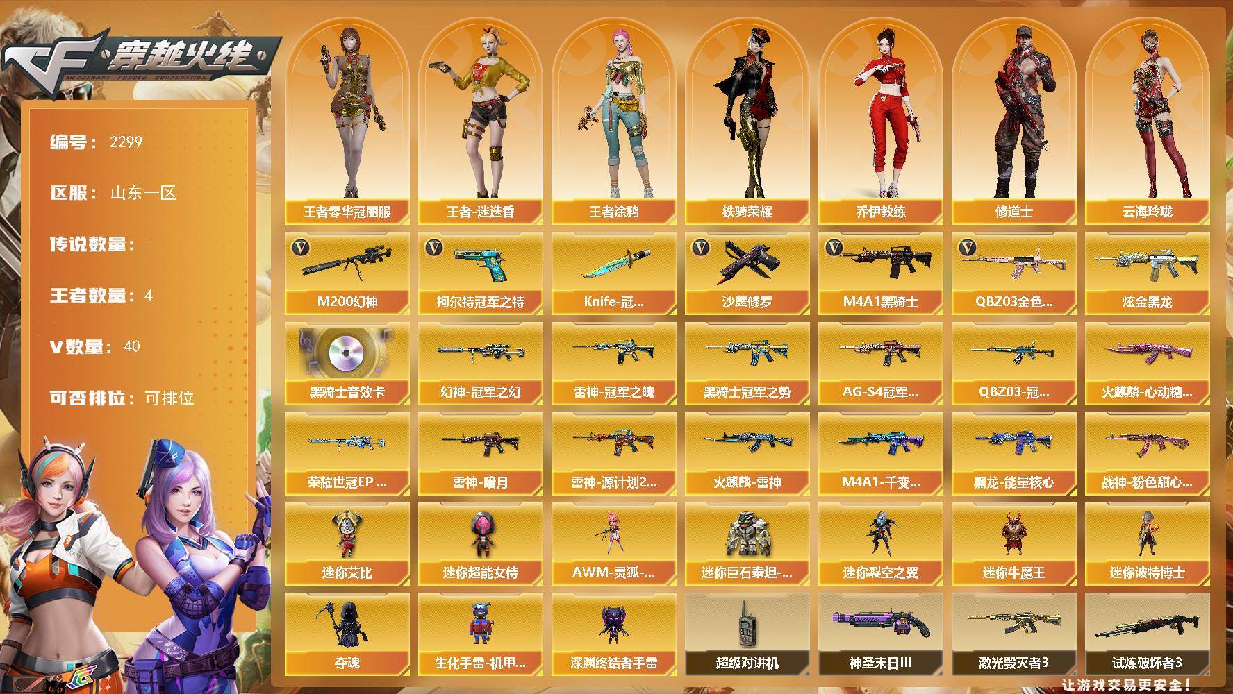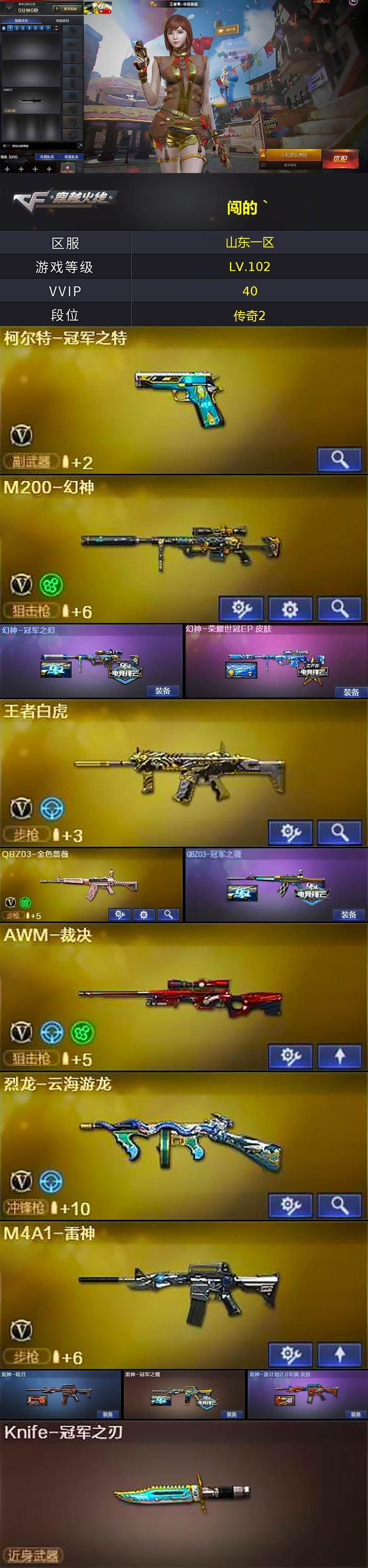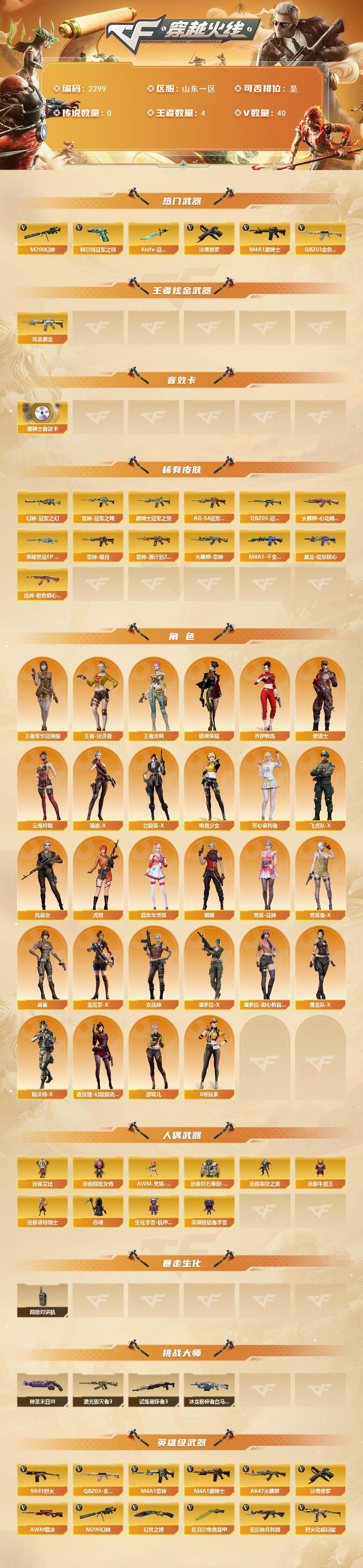 [17187176]山东一区-45V-4王者武器数-1炫金武器数 【热门武器】:QBZ03-金色蔷薇,M200-幻神,柯尔特-冠军之特,M4A1-黑骑士,沙鹰-修罗*3,Knife-冠军之刃 【王者炫金武器】:炫金黑龙 【音效卡】:M4A1-黑骑士音效卡 【皮肤】:幻神-冠军之幻,幻神-荣耀世冠EP 皮肤,QBZ03-冠军之薇,雷神-暗月,雷神-冠军之魄,雷神-源计划2.0专属 皮肤,火麒麟-雷神,火麒麟-心动糖果,M4A1-千变-孔明皮肤*2,黑龙-能量核心,黑骑士-冠军之势,黑骑士-AG-S4冠军典藏,战神-粉色甜心皮肤*2 【角色】:王者零-华冠丽服,王者涂鸦,王者-迷迭香,乔伊教练,修道士,云海玲珑,暗夜-X,北极狐-X,电竞少女,芳心审判者,飞虎队-X,风暴女,虎妞,嘉年华灵狐,娟娟,0号玩家,灵狐-花神,灵狐者-X,麻雀,曼陀罗-X,女战神,潘多拉-X,潘多拉-甜心教官,潜龙队-X,斯沃特-X,铁骑荣耀,夜玫瑰-幻能朋克,游珑儿 【人偶武器】:AWM-灵狐-15周年嘉年华,迷你裂空之翼,迷你牛魔王,迷你波特博士*2,夺魂*2,生化手雷-机甲核心,深渊终结者手雷,迷你艾比,迷你超能女侍,迷你巨石泰坦-魔花研究所 【暴走生化】:超级对讲机 【挑战大师】:冰龙粉碎者-白马银枪,激光毁灭者III*2,试炼破坏者III,神圣爆裂者-末日III 【英雄级武器】:AK47-火麒麟,M4A1-雷神,M4A1-黑骑士,无影-神兵利器,QBZ03-金色蔷薇,9A91-烈火,烈火-动感闪耀,AK-47-猩红传说*2,王者白虎-觉醒版,AWM-裁决,M200-幻神,烈龙-云海游龙,沙鹰-修罗*3,柯尔特-冠军之特,天神-动感闪耀,幻灵之锋,屠龙-动感闪耀,擎天-云海游龙,尼泊尔-电竞装甲,高爆手雷-幻灵,高爆手雷-神工天巧*2,手雷-动感闪耀,手雷-云海游龙,闪光弹-幻灵,闪光弹-神工天巧,烟雾弹-幻灵,烟雾弹-神工天巧,M4A1-赤狱骑士 【道具】:BS战队炫彩背包,云海游龙炫彩背包,亚洲杯纪念炫彩背包,全能枪王背包,背包-洛丽塔,虎牙炫彩背包,超级背包,黄金超能特工背包,哔哩哔哩名片,女皇终结者-魔龙之吻,救世主-黑桃战神,黄金生化钩,绿色巨人,灵魂忍者*2,变异宝贝,迷雾幽灵*2,夺命之镰,防化服*2,金色流光-枪王排位*2,星辰流光-枪王排位,流光-再燃火线,枪王排位28赛季金色流光,枪