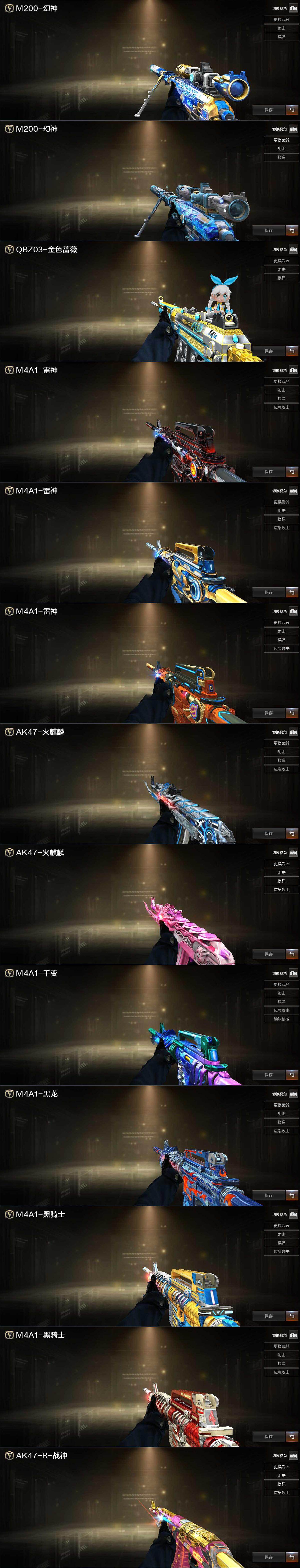 【热门武器】:QBZ03-金色蔷薇,M200-幻神,柯尔特-冠军之特,M4A1-黑骑士,沙鹰-修罗*3,Knife-冠军之刃