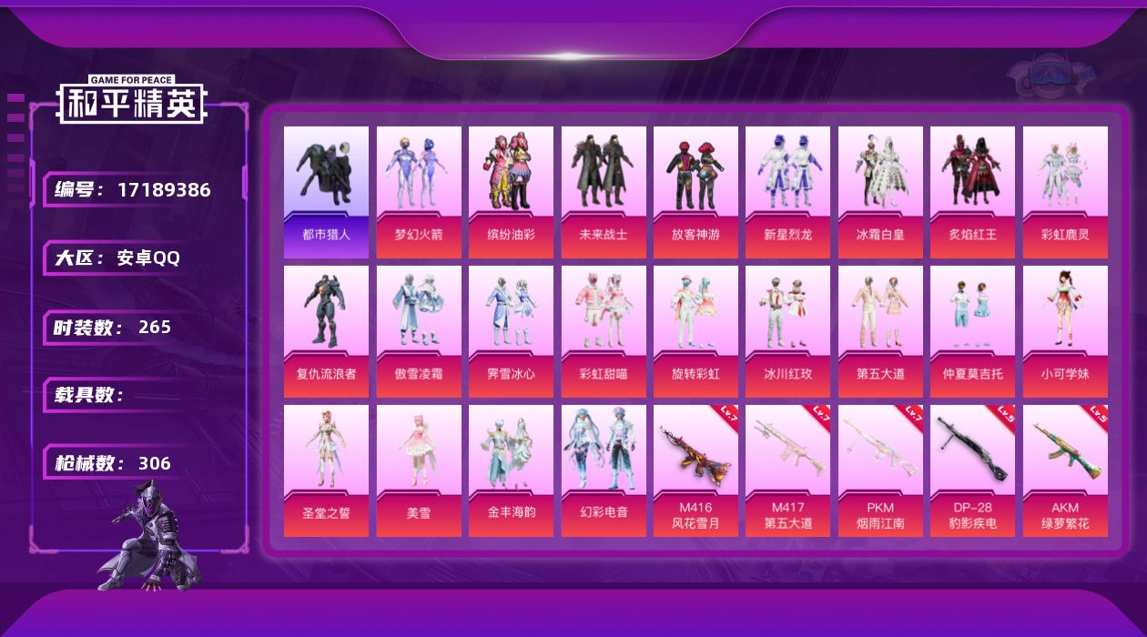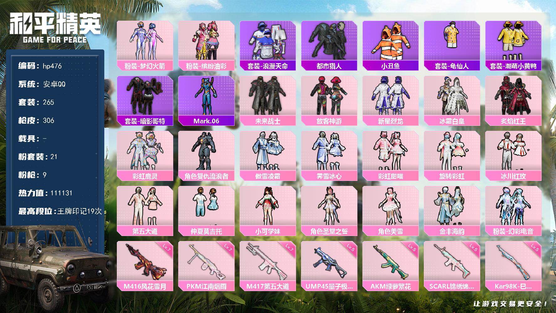 [17189386]安卓 手Q-21粉装-9特效枪-0载具-4粉色飞行器-111131热力值-19王牌印记-265套装-306枪皮