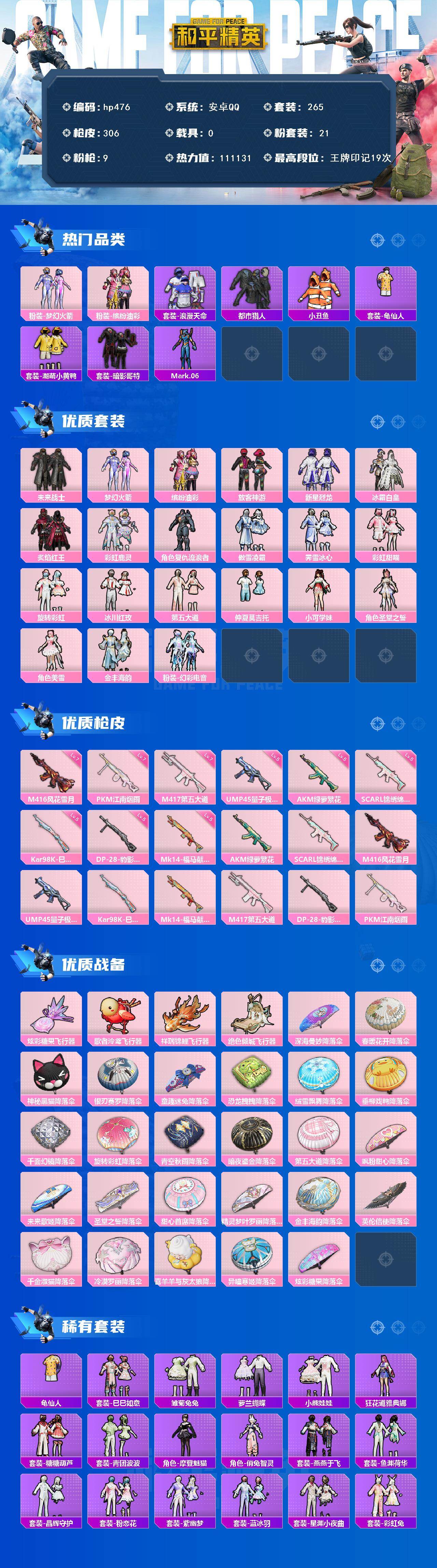 [17189386]安卓 手Q-21粉装-9特效枪-0载具-4粉色飞行器-111131热力值-19王牌印记-265套装-306枪皮 【热门品类】:粉装-梦幻火箭,粉装-缤纷油彩,套装-浪漫天命,套装-都市猎人,套装-小丑鱼,套装-龟仙人,套装-潮萌小黄鸭,套装-暗影哥特,角色-Mark.06 【粉色套装】:粉装-未来战士,粉装-梦幻火箭,粉装-缤纷油彩,粉装-放客神游,粉装-新星烈龙,粉装-冰霜白皇,粉装-炙焰红王,粉装-彩虹鹿灵,角色-复仇流浪者,粉装-傲雪凌霜,粉装-霁雪冰心,粉装-彩虹甜喵,粉装-旋转彩虹,粉装-冰川红玫,粉装-第五大道,粉装-仲夏莫吉托,角色-小可学妹,角色-圣堂之誓,角色-美雪,粉装-金丰海韵,粉装-幻彩电音 【粉色枪皮等级】:AKM-绿萝繁花(五级),SCAR-L-锦绣绵绵(五级),M416-风花雪月(七级),UMP45-量子极限(五级),Kar98K-巳巳如意(五级),Mk14-福马献瑞(五级),M417-第五大道(七级),DP-28-豹影疾电(五级),PKM-江南烟雨(七级) 【粉色枪皮】:AKM-绿萝繁花,SCAR-L-锦绣绵绵,M416-风花雪月,UMP45-量子极限,Kar98K-巳巳如意,Mk14-福马献瑞,M417-第五大道,DP-28-豹影疾电,PKM-江南烟雨 【粉色飞行器】:炫彩糖果飞行器,歌者泠鸢飞行器,祥瑞锦鲤飞行器,绝色倾城飞行器 【粉色降落伞】:深海曼妙降落伞,春暖花开降落伞,神秘黑猫降落伞,银刃赛罗降落伞,童趣迷兔降落伞,恐龙拽拽降落伞,绒雪飘舞降落伞,垂柳戏鸭降落伞,千面幻镜降落伞,旋转彩虹降落伞,青空秋雨降落伞,暗夜鎏金降落伞,第五大道降落伞,飒粉甜心降落伞,未来歌姬降落伞,圣堂之誓降落伞,甜心首席降落伞,精灵梦叶罗丽降落伞,金丰海韵降落伞,英伦信使降落伞,千金淑猫降落伞,冷漠罗丽降落伞,喜羊羊与灰太狼降落伞,异瞳寒姬降落伞,炫彩糖果降落伞 【稀有套装】:套装-龟仙人,套装-巳巳如意,套装-雪国风尚,套装-雏菊兔兔,套装-萝兰蝴蝶,套装-小熊娃娃,角色-狂花道·雅典娜,套装-糖糖葫芦,套装-青团波波,角色-摩登魅猫,角色-俏兔智灵,套装-燕燕于飞,套装-鱼渊荷华,套装-晶辉守护,套装-粉恋花,套装-紫幽梦,套装-蓝冰羽,套装-星渊小夜曲,套装-彩虹兔,套装-云朵鹅,套装-雪绒豹,角色-乐音,角色-夜瞳黯灵,套装-朱霞炽焰,