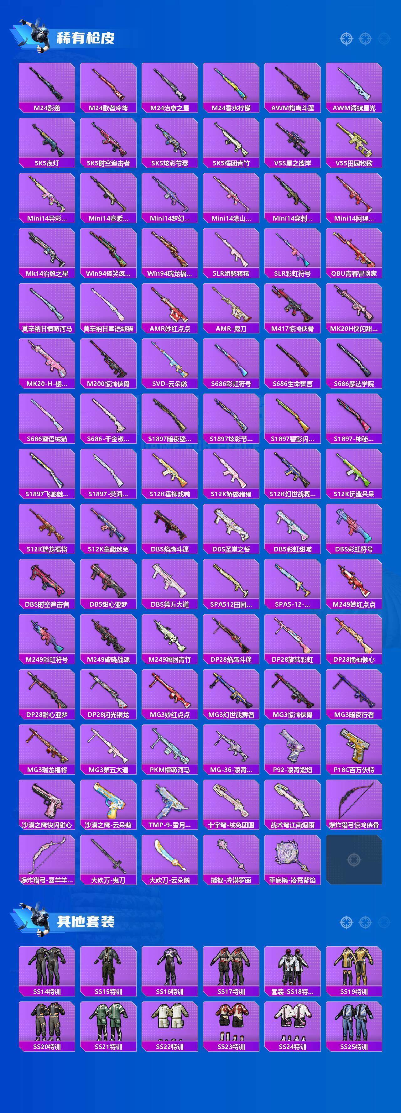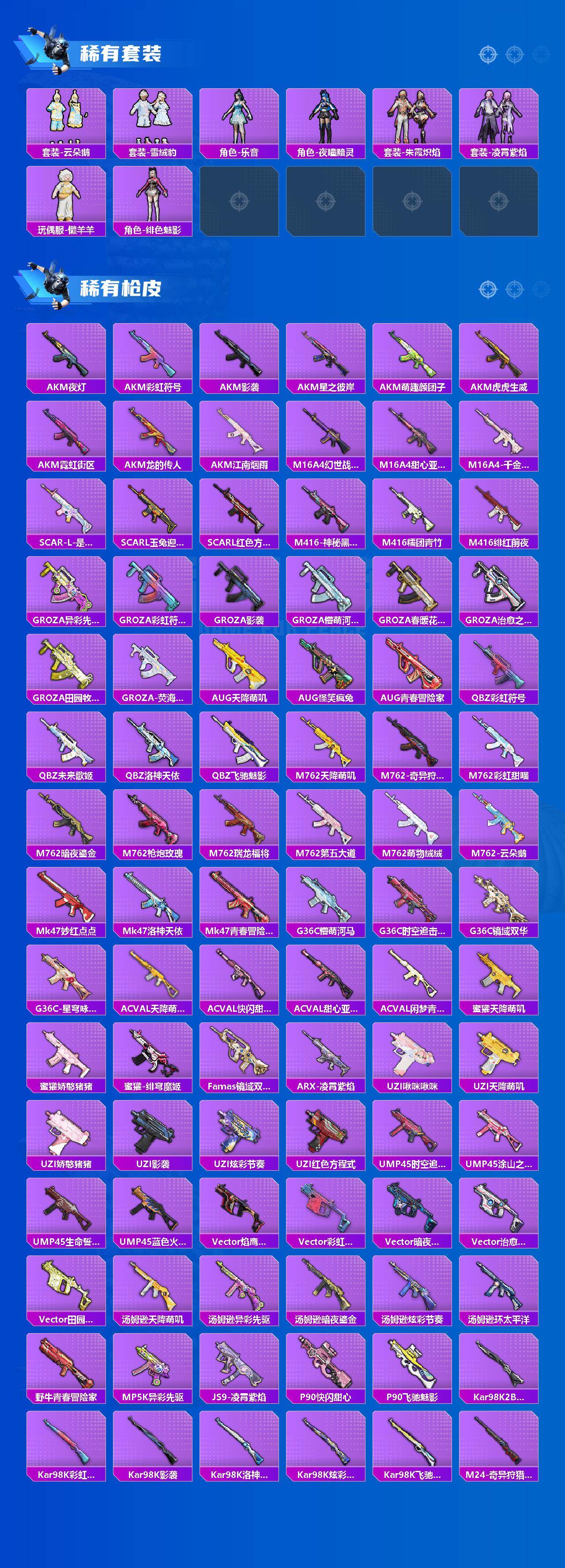 AKM-绿萝繁花,SCAR-L-锦绣绵绵,M416-风花雪月,UMP45-量子极限,Kar98K-巳巳如意,M417-第五大道,PKM-江南烟雨