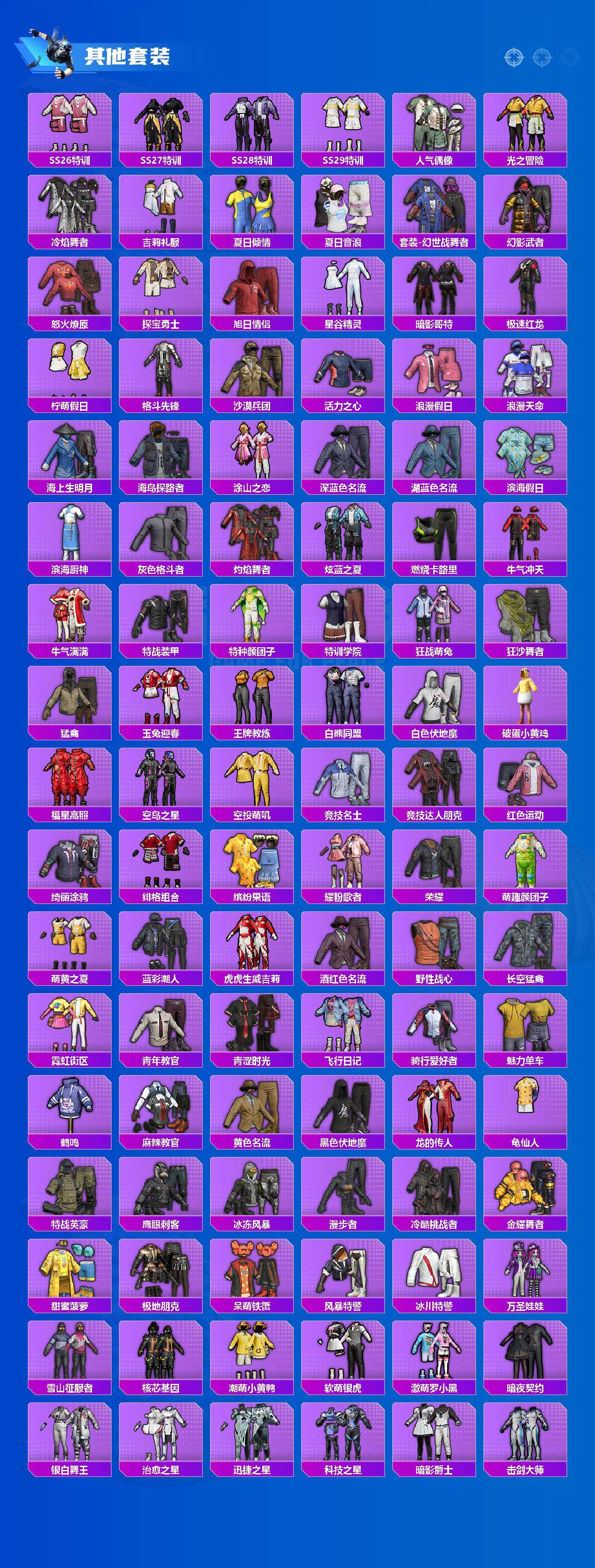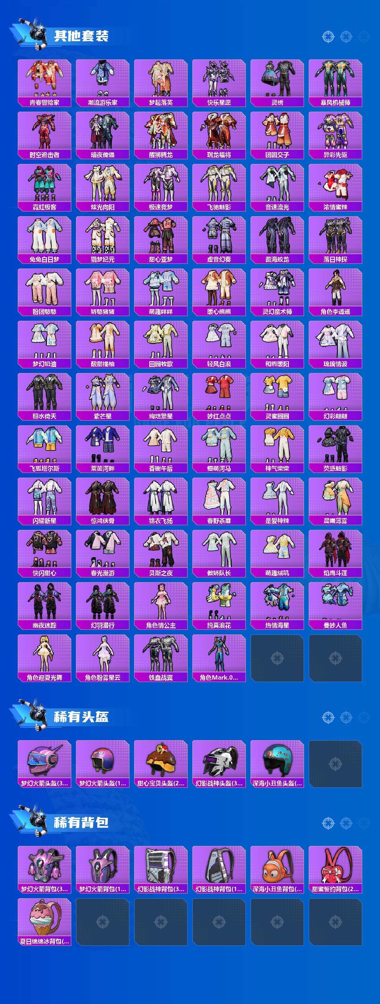 套装-梦幻火箭,套装-缤纷油彩,套装-都市猎人,套装-潮萌小黄鸭,套装-未来战士,套装-放客神游,套装-新星烈龙,套装-炙焰红王,套装-彩虹鹿灵,角色-复仇流浪者,套装-傲雪凌霜,套装-霁雪冰心,套装-彩虹甜喵,套装-旋转彩虹,套装-冰川红玫,套装-第五大道,套装-仲夏莫吉托,角色-小可学妹,角色-圣堂之誓,角色-美雪,套装-金丰海韵,套装-鹰眼刺客,套装-呆萌铁蟹,套装-万圣娃娃,套装-软萌银虎,兔兔白日梦套装