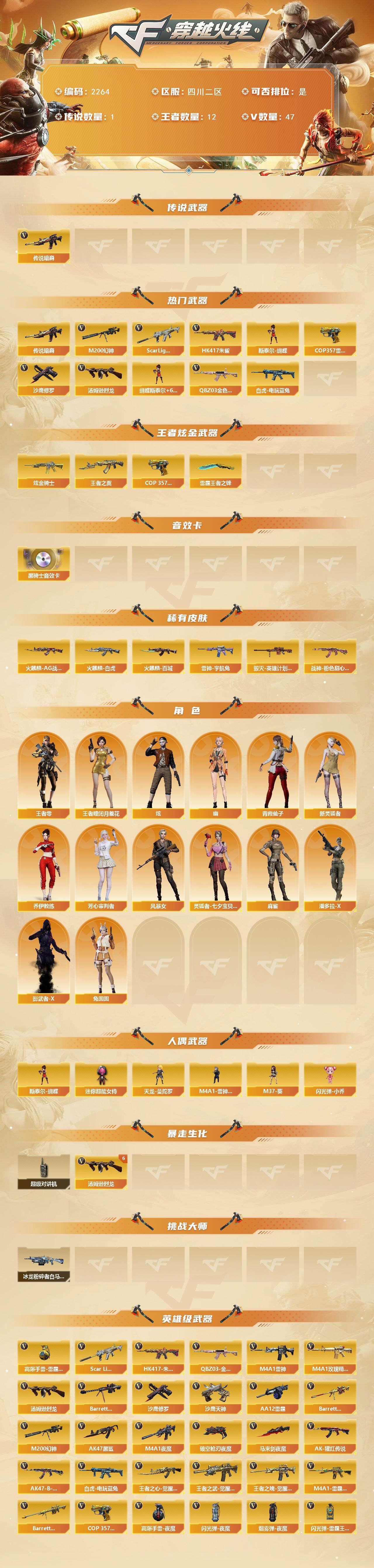 [17092928]四川二区-57V-12王者武器数-1炫金武器数 【传说武器】:传说暗裔 【热门武器】:传说暗裔,QBZ03-金色蔷薇,Scar Light-白虎,HK417-朱雀,M200-幻神,白虎-电玩蓝兔,汤姆逊-烈龙*6,斯泰尔-蝴蝶,COP 357-雷霆王者,沙鹰-修罗*4 【王者炫金武器】:王者之翼,COP 357-雷霆王者,雷霆王者之锋,炫金骑士 【音效卡】:M4A1-黑骑士音效卡*3 【皮肤】:雷神-宇航兔皮肤,火麒麟-AG战队皮肤,火麒麟-白虎,火麒麟-百城,毁灭-英雄计划 皮肤,战神-粉色甜心皮肤 【角色】:炫,王者-瞳-闭月羞花,王者-零,乔伊教练,芳心审判者,风暴女,灵狐者-七夕宝贝,麻雀,潘多拉-X,青霞仙子,兔囡囡,新灵狐者,影武者-X,幽 【人偶武器】:天龙-曼陀罗,M4A1-雷神-精英刀锋,斯泰尔-蝴蝶,M37-葵,闪光弹-小乔,迷你超能女侍 【暴走生化】:超级对讲机 【挑战大师】:冰龙粉碎者-白马银枪*2 【英雄级武器】:M4A1-雷神,AK47-黑鲨,HK417-朱雀,Scar Light-白虎,M4A1-夜魔,M4A1-玫瑰精灵,QBZ03-金色蔷薇,王者之心-觉醒版,王者之武-觉醒版,王者之魄-觉醒版,AK-47-猩红传说,AK47-B-战神,M4A1-雷霆王者-觉醒版,白虎-电玩蓝兔,Barrett-毁灭,M200-幻神,Barrett-朱雀,Barrett-雷霆王者-觉醒版,汤姆逊-烈龙*6,AA-12-雷霆,沙鹰-修罗*4,沙鹰-天神,COP 357-雷霆王者-觉醒版,破空枪刃-夜魔,马来剑-夜魔,高爆手雷-夜魔*5,高爆手雷-雷霆王者-觉醒版,闪光弹-夜魔*5,闪光弹-雷霆王者-觉醒版,烟雾弹-夜魔*5,烟雾弹-雷霆王者-觉醒版 【道具】:炫彩背包,超级背包,女皇终结者-魔龙之吻,绿色巨人,灵魂忍者,迷雾幽灵,夺命之镰,防化服*2,电玩兔兔表情,防弹头盔*4,防弹衣*5,C4工具钳*4,手雷包*3 【特殊枪械】:蝴蝶斯泰尔+6烈龙,1白虎,6烈龙,1蝴蝶斯泰尔