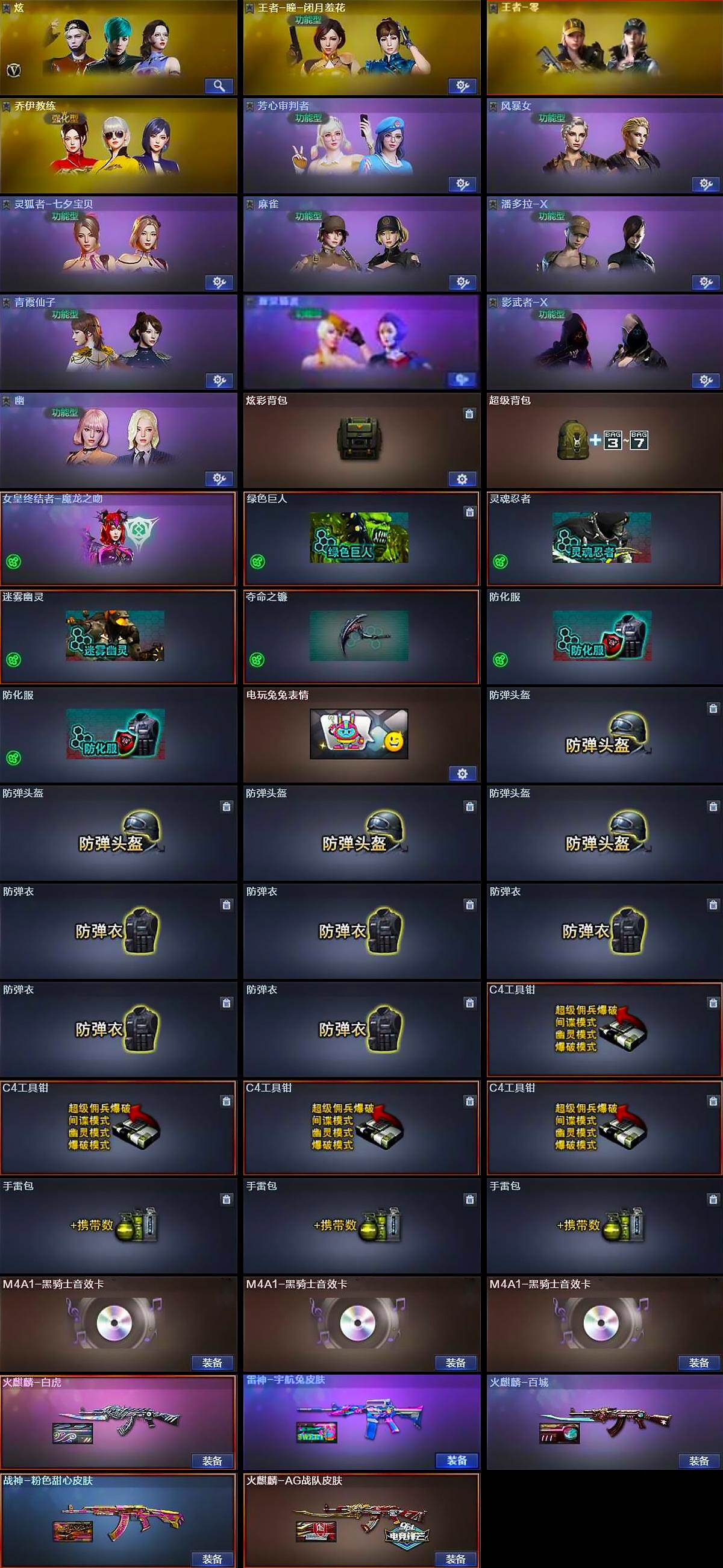【道具】:炫彩背包,超级背包,女皇终结者-魔龙之吻,绿色巨人,灵魂忍者,迷雾幽灵,夺命之镰,防化服*2,电玩兔兔表情,防弹头盔*4,防弹衣*5,C4工具钳*4,手雷包*3