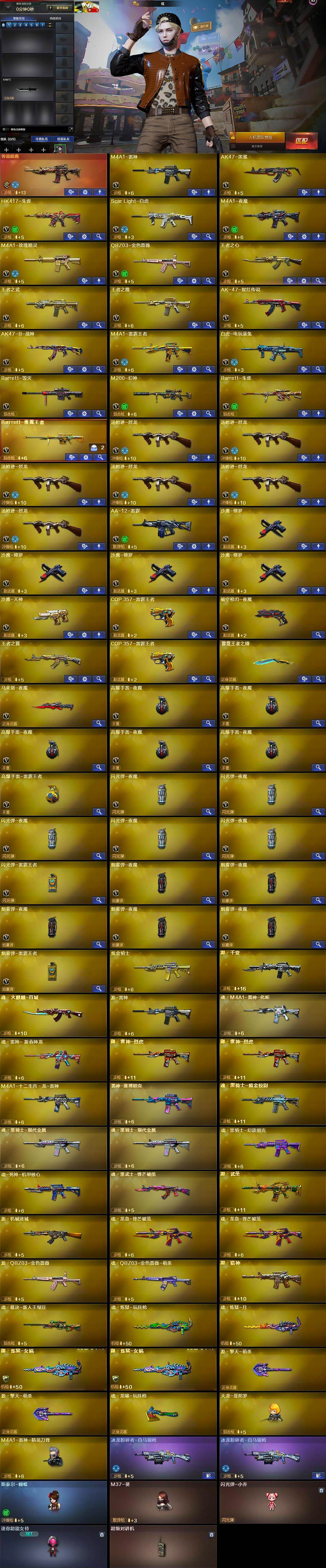 【英雄级武器】:M4A1-雷神,AK47-黑鲨,HK417-朱雀,Scar Light-白虎,M4A1-夜魔,M4A1-玫瑰精灵,QBZ03-金色蔷薇,王者之心-觉醒版,王者之武-觉醒版,王者之魄-觉醒版,AK-47-猩红传说,AK47-B-战神,M4A1-雷霆王者-觉醒版,白虎-电玩蓝兔,Barrett-毁灭,M200-幻神,Barrett-朱雀,Barrett-雷霆王者-觉醒版,汤姆逊-烈龙*6,AA-12-雷霆,沙鹰-修罗*4,沙鹰-天神,COP 357-雷霆王者-觉醒版,破空枪刃-夜魔,马来剑-夜魔,高爆手雷-夜魔*5,高爆手雷-雷霆王者-觉醒版,闪光弹-夜魔*5,闪光弹-雷霆王者-觉醒版,烟雾弹-夜魔*5,烟雾弹-雷霆王者-觉醒版
