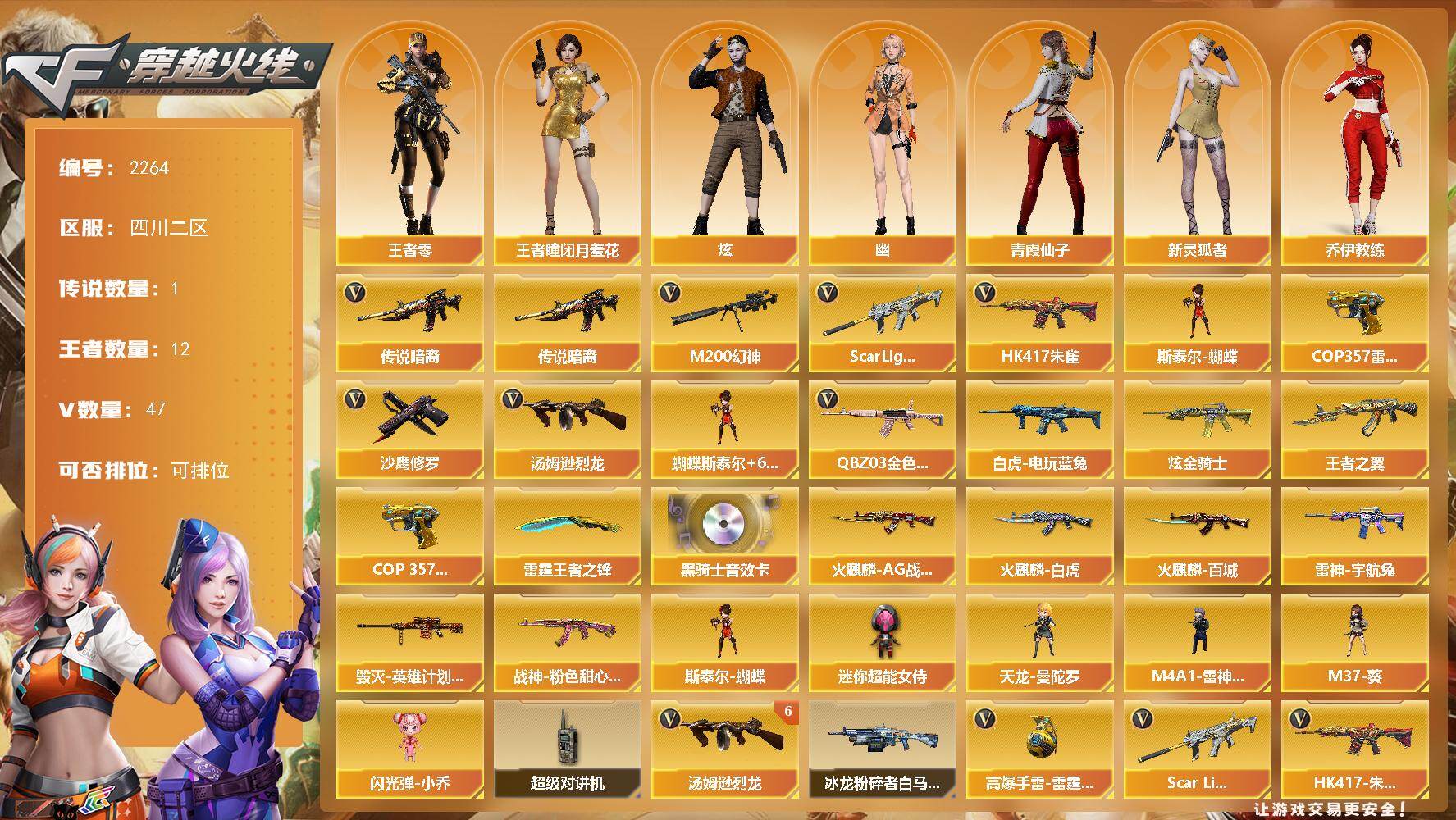 - [15977342]江苏二区-29V-8王者-2炫金 【传说武器】:传说圣灵,传说梦魇 【传说角色】:传说女帝 【热门武器】:传说梦魇,传说圣灵,Scar Light-白虎,M200-竞技荣光,死亡之眼,毒蜂,M4A1-黑骑士,USP-雷暴,沙鹰-修罗*2 【王者炫金武器】:王者霜心,炫金雷神,炫金毁灭 【音效卡】:M4A1-雷神音效卡,Scar Light-白虎音效卡 【皮肤】:雷神-暗月,雷神-荣耀之魄,雷神-宠儿-2019MVP,雷神-杨戬,火麒麟-雷神,火麒麟-华夏之心,火麒麟-轻羽皮肤,火麒麟-盘古,毁灭-BEAN-2020MVP,黑武士-典韦皮肤,修罗-CF STAR,修罗-冠军之魂*2,屠龙-荣耀之锋 【角色】:电竞教官-云悠悠,王者葵-惊若翩鸿,嘉年华灵狐,潘多拉-X,蜀雪,樱-战斗天使 【人偶武器】:天龙-曼陀罗,AWM-灵狐-15周年嘉年华,迷你牛牛 【暴走生化】:毒蜂,死亡之眼 【挑战大师】:冰龙粉碎者-白马银枪 【英雄级武器】:AK47-火麒麟,M4A1-黑龙,M4A1-雷神*2,M4A1-黑骑士,AK47-黑武士,M4A1-武圣,Scar Light-白虎,王者冰魄-觉醒版,王者之烈-觉醒版,QBZ-03-王者蔷薇-觉醒版,Barrett-毁灭,M200-竞技荣光,Barrett-金色蔷薇,王者之怒-觉醒版,王者之决-觉醒版,王者星神-觉醒版,悦蓝-惊涛骇浪-觉醒版,沙鹰-修罗*2,沙鹰-天神,USP-雷暴,柯尔特-竞技荣光,Glock18-武圣,屠龙*2,擎天,擎天-竞技荣光,高爆手雷-竞技荣光,闪光弹-竞技荣光,烟雾弹-竞技荣光 【道具】:老虎背包,绿色巨人,灵魂忍者,迷雾幽灵,夺命之镰,防化服*2,金色流光-枪王排位*2,枪王排位28赛季金色流光,EP战队名片,防弹头盔*4,防弹衣*4,C4工具钳*3,手雷包*3 【特殊枪械】:1白虎,1黑骑士
